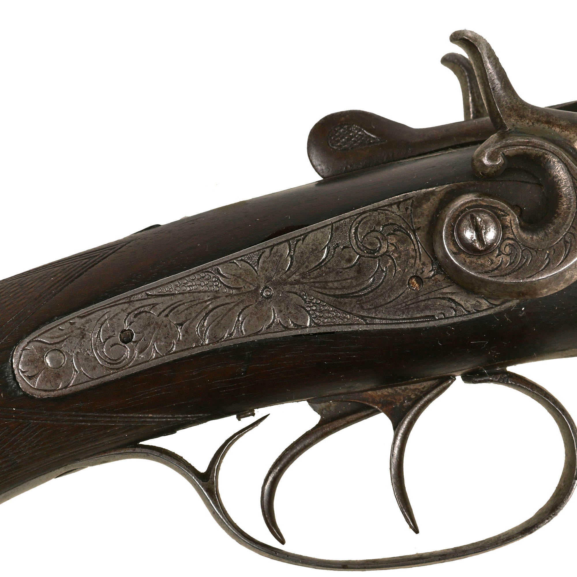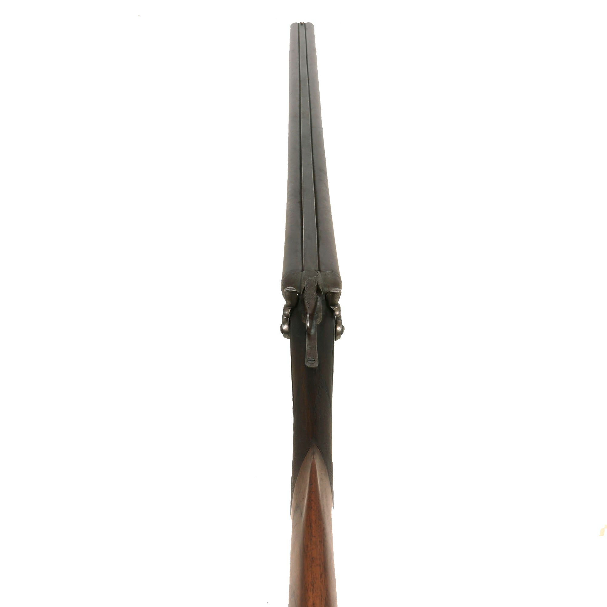 The gun is in nice shape, and bores are clear, showing some oxidation peppering and fouling from use. The standard top lever pushed to the side, opening the chambers for reloading, with a functional ejector. It is fitted with "bounce back" style hammers, which strike the back of the firing pin and then return to battery, allowing the firing pins to reset, though the springs on both firing pins are unfortunately missing or broken. The stocks show the expected wear from use and long service, but do not have any major cracks or other damage. It features a plastic or hard rubber butt plate, which does show some cracking due to age, and there was originally an oval escutcheon on the bottom of the butt stock, which is now missing.