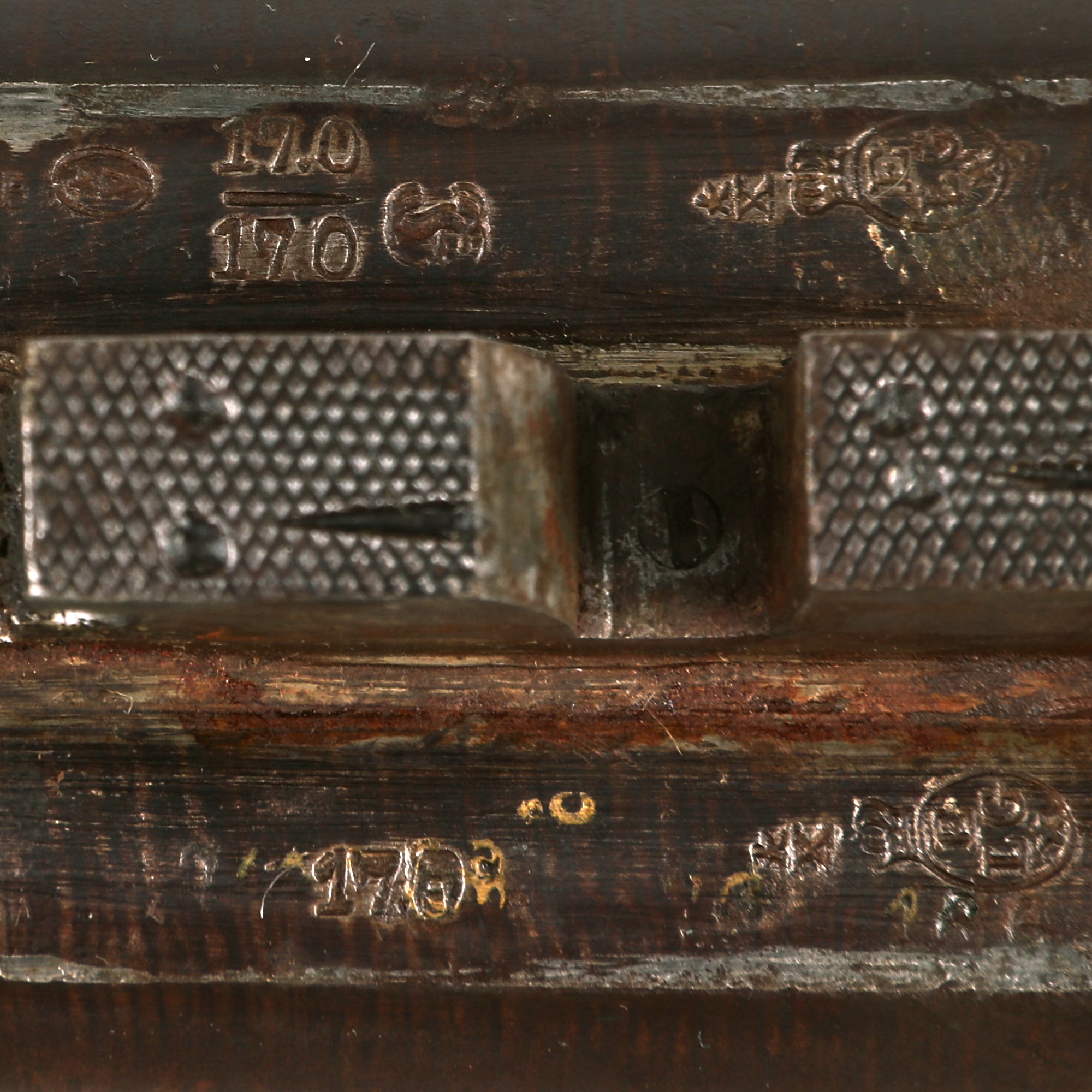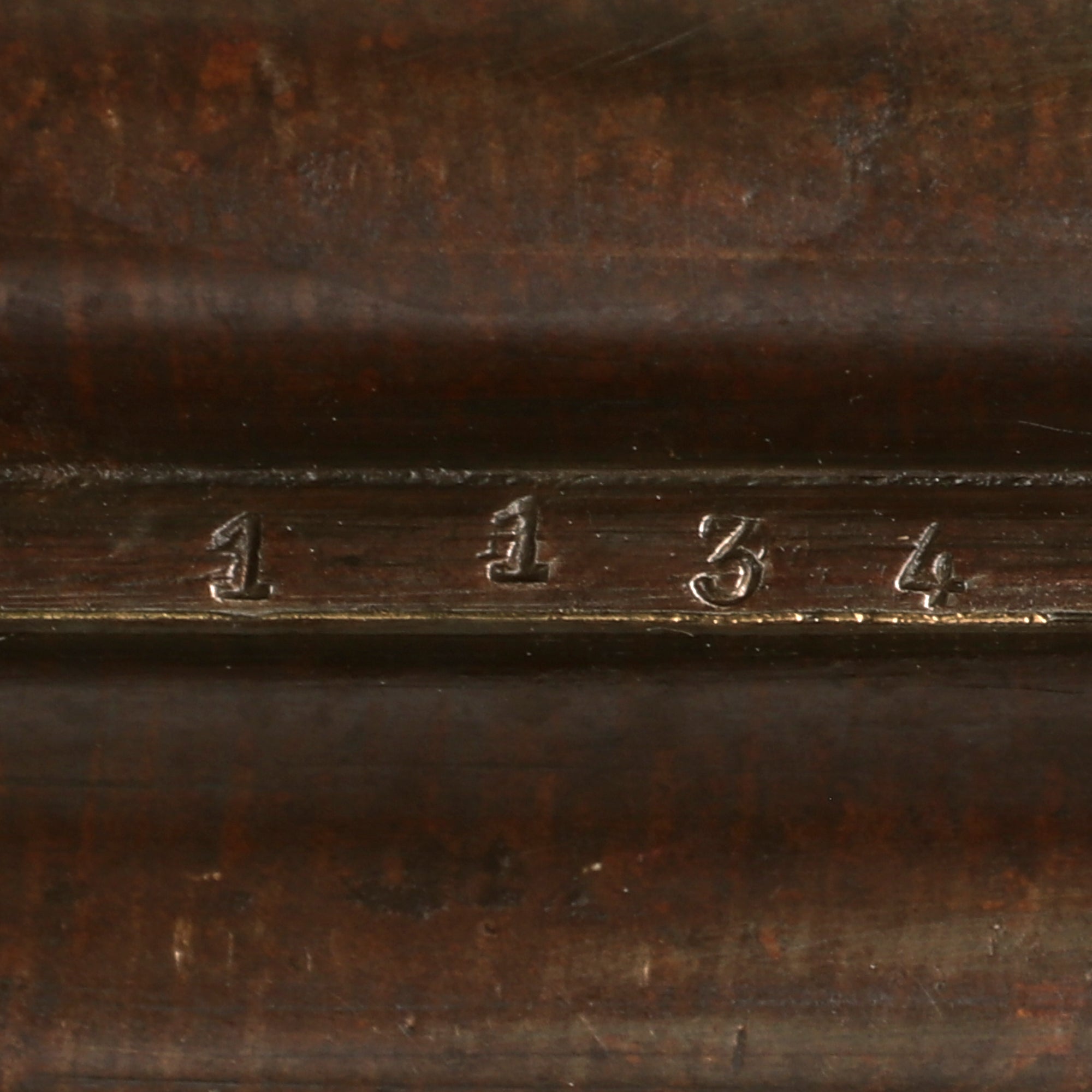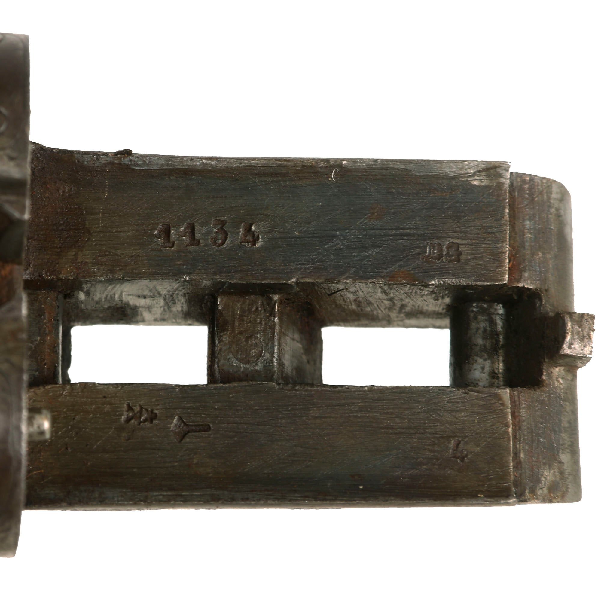 The "table" of the shotgun breech area is marked with the "Perron" or Tower of Liège on the right side, and also has serial number 1134 stamped on the left hand side, which matches the number stamped under the muzzle of the barrel assembly. Assembly number 4 is stamped on the table, on the foregrip fitting, and on the fore grip lug on the bottom of the barrel assembly, so no major parts have been swapped out. There are additional proofs and other markings giving further specifications on the barrels, such as gauge, maker, inspector, choke, etc.