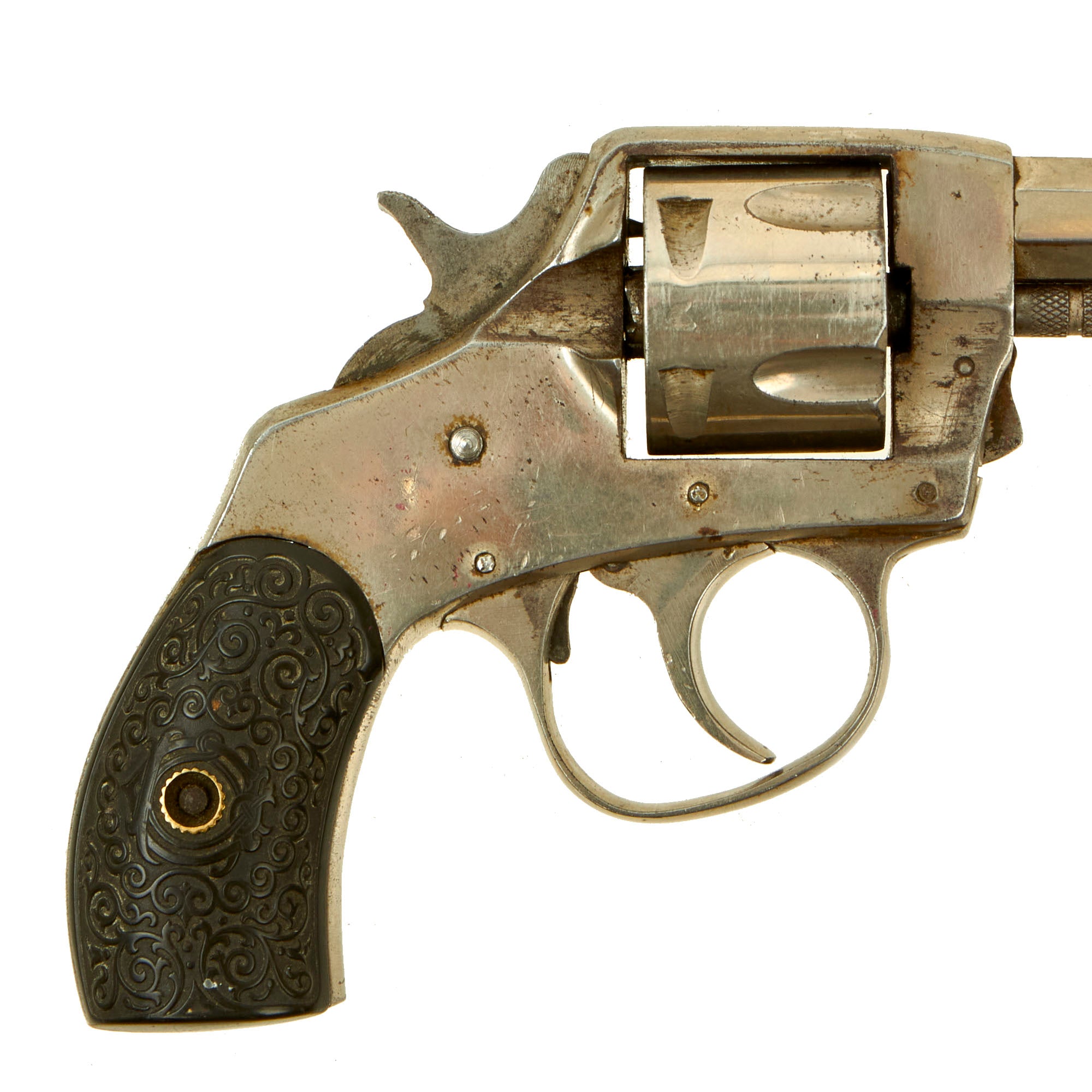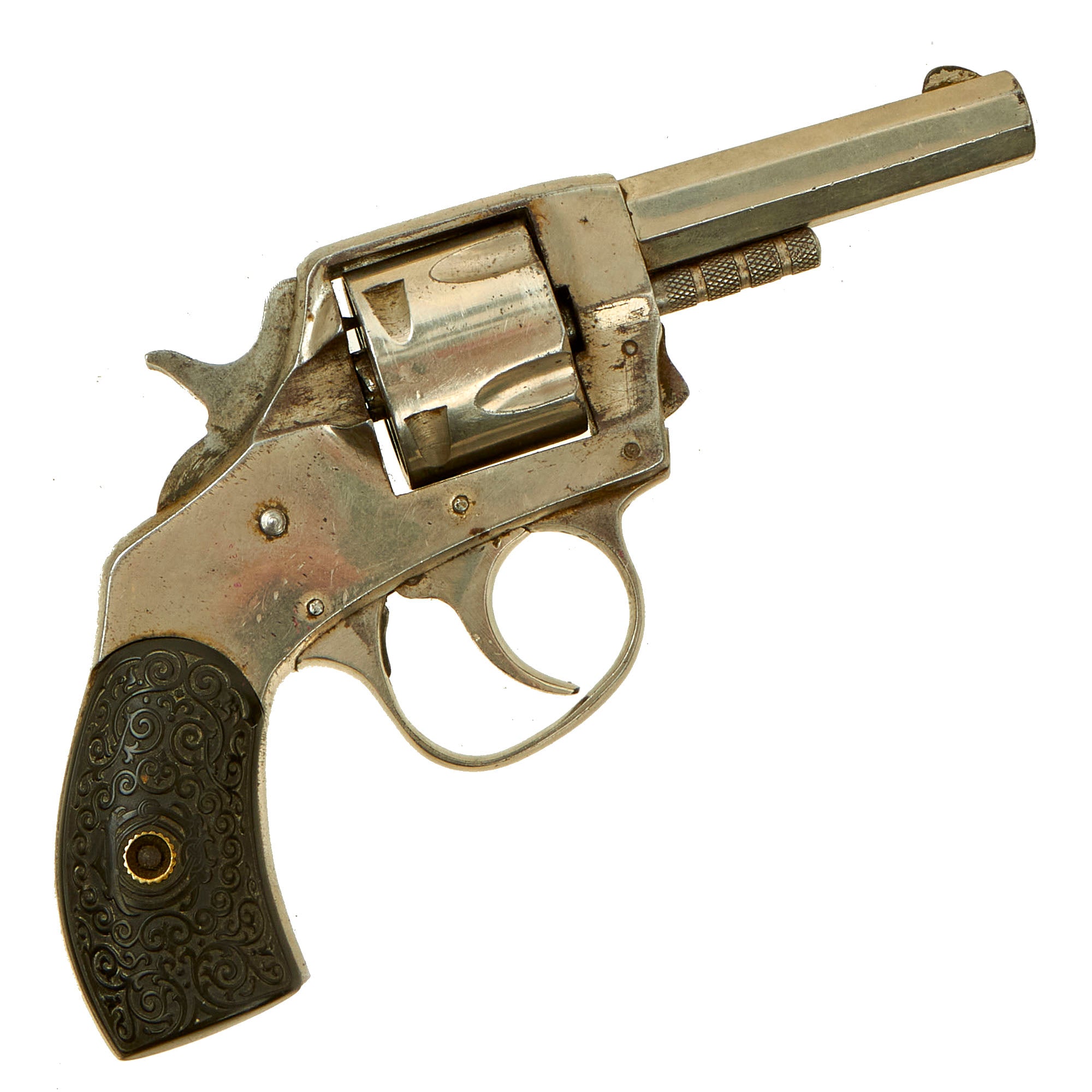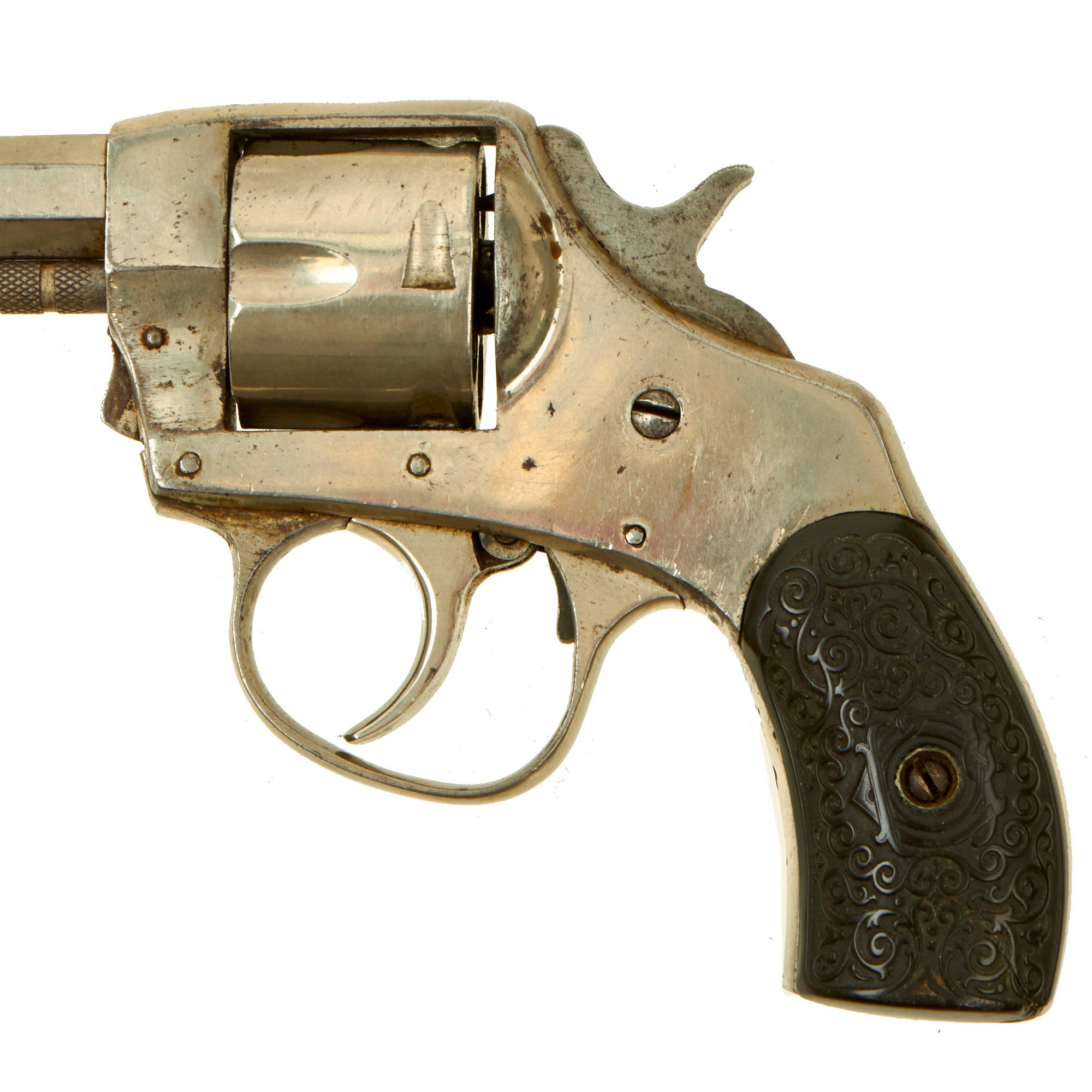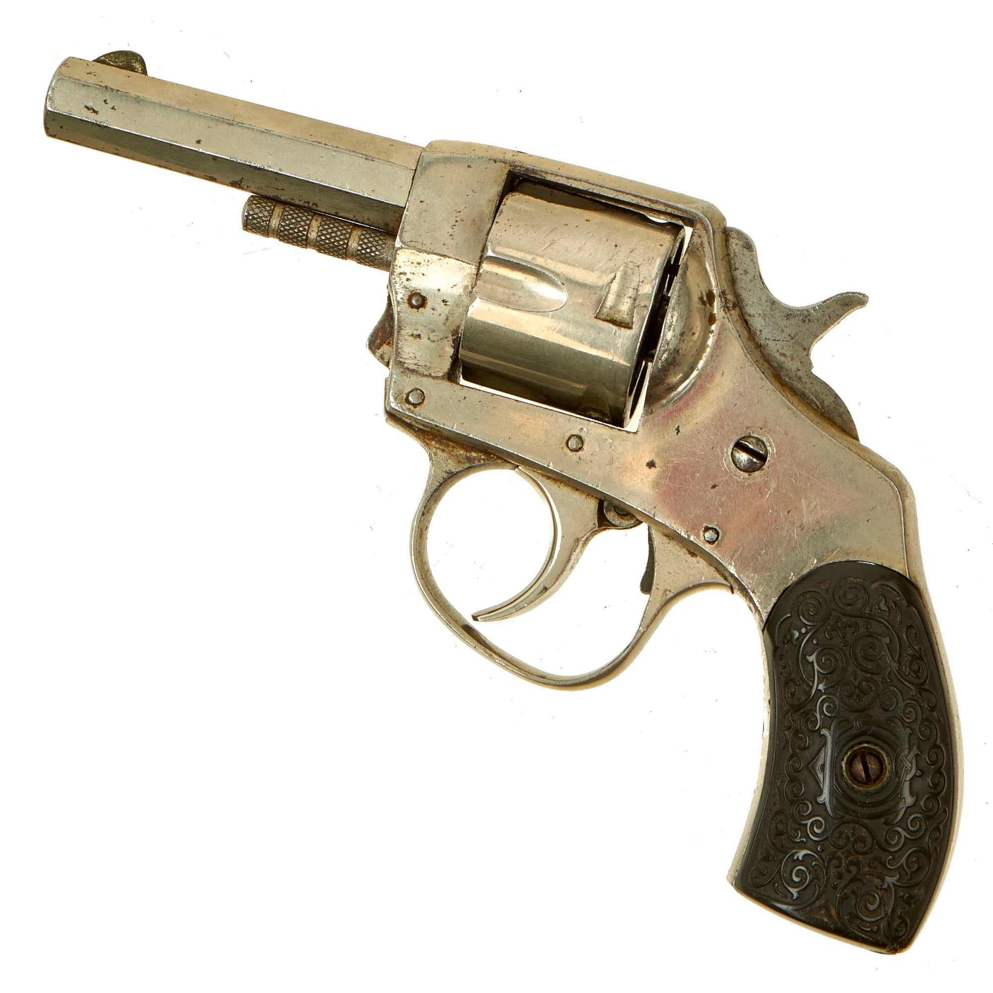 This double action example features a nickel plated finish, 2 1/2" octagonal barrel, brass blade front sight, and a notch on top of the barrel strap functioning as the rear sight. It also has a fluted five-shot cylinder, and ornate two-piece black hard rubber grips with a lovely foliate motif design. We removed the grips, and serial number 6986 is stamped into the grip frame. The revolver retains almost all of the original nickel plating, and is very attractive!