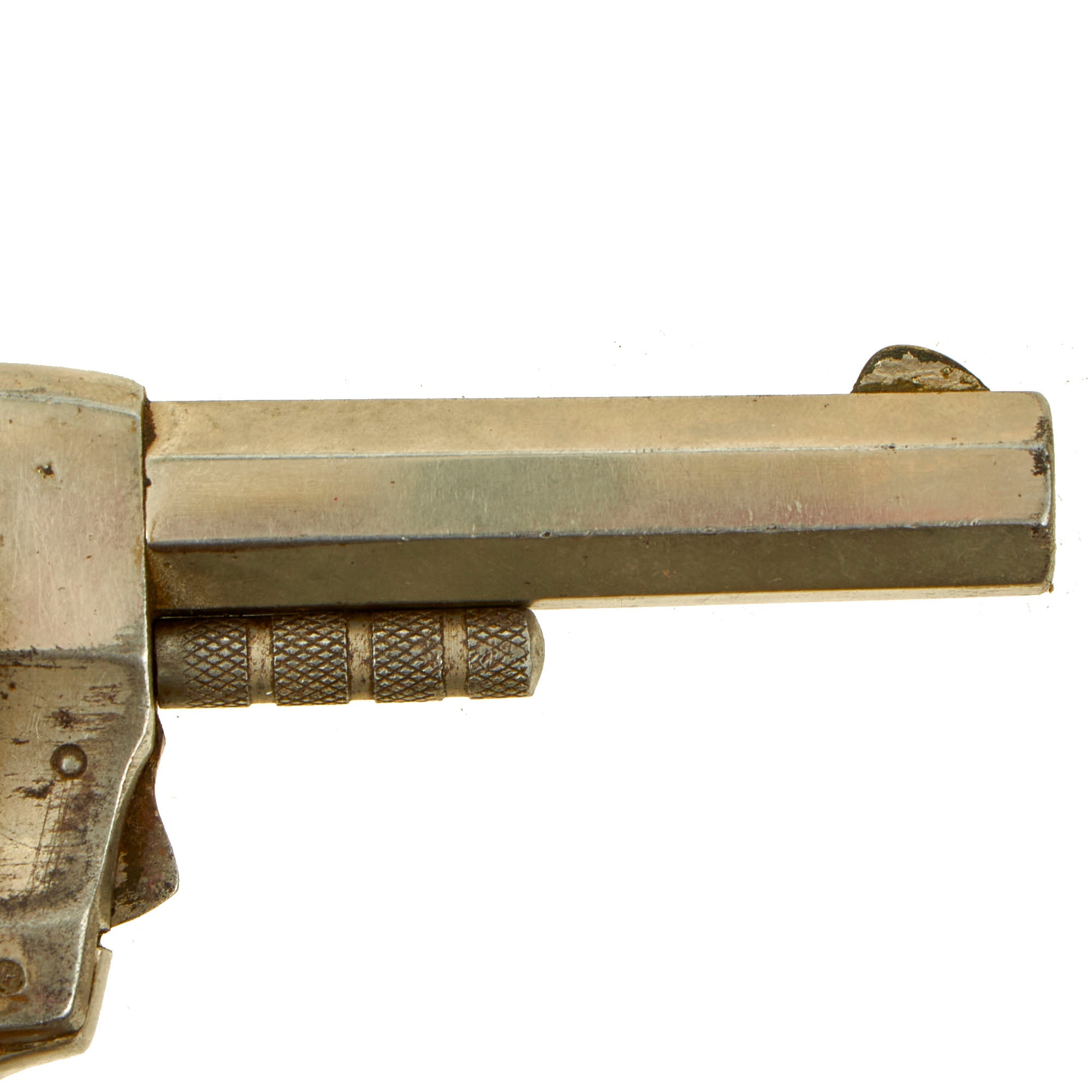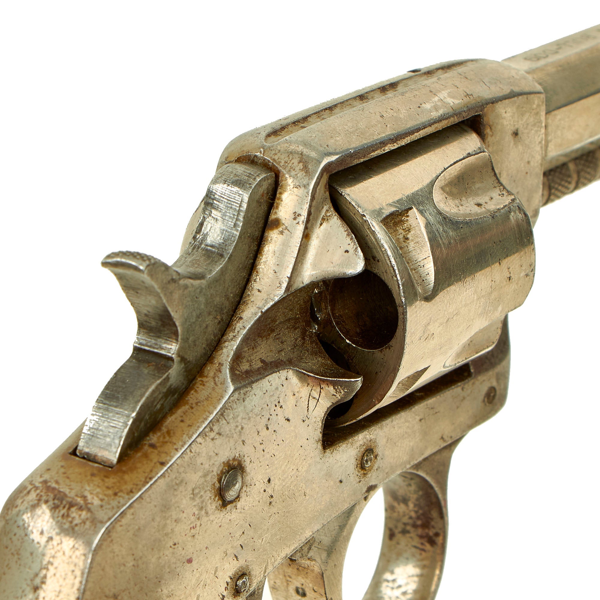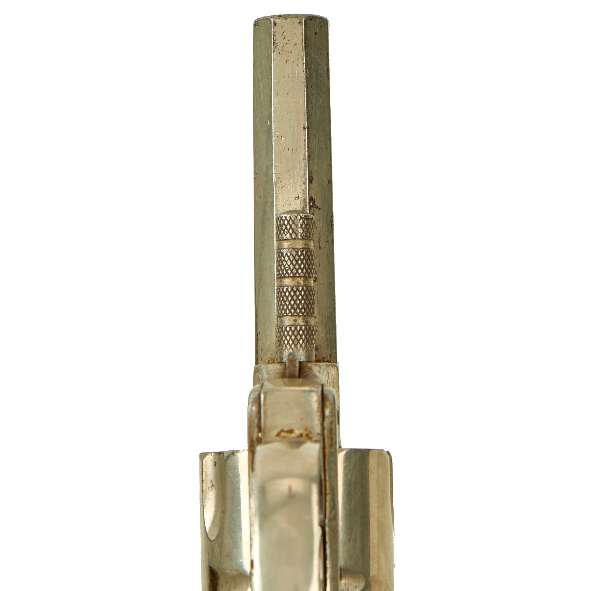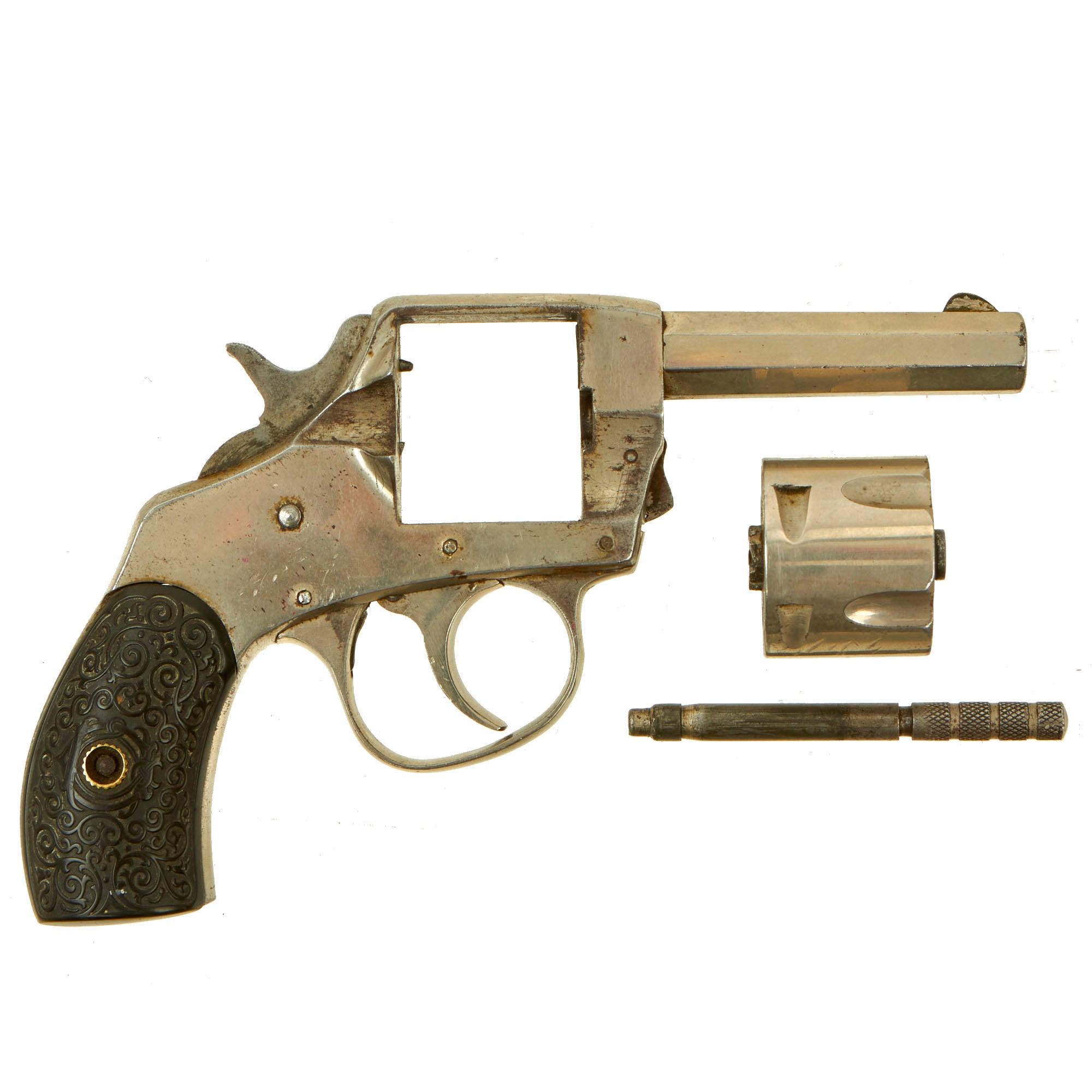 This double action example features a nickel plated finish, 2 1/2" octagonal barrel, brass blade front sight, and a notch on top of the barrel strap functioning as the rear sight. It also has a fluted five-shot cylinder, and ornate two-piece black hard rubber grips with a lovely foliate motif design. We removed the grips, and serial number 6986 is stamped into the grip frame. The revolver retains almost all of the original nickel plating, and is very attractive!