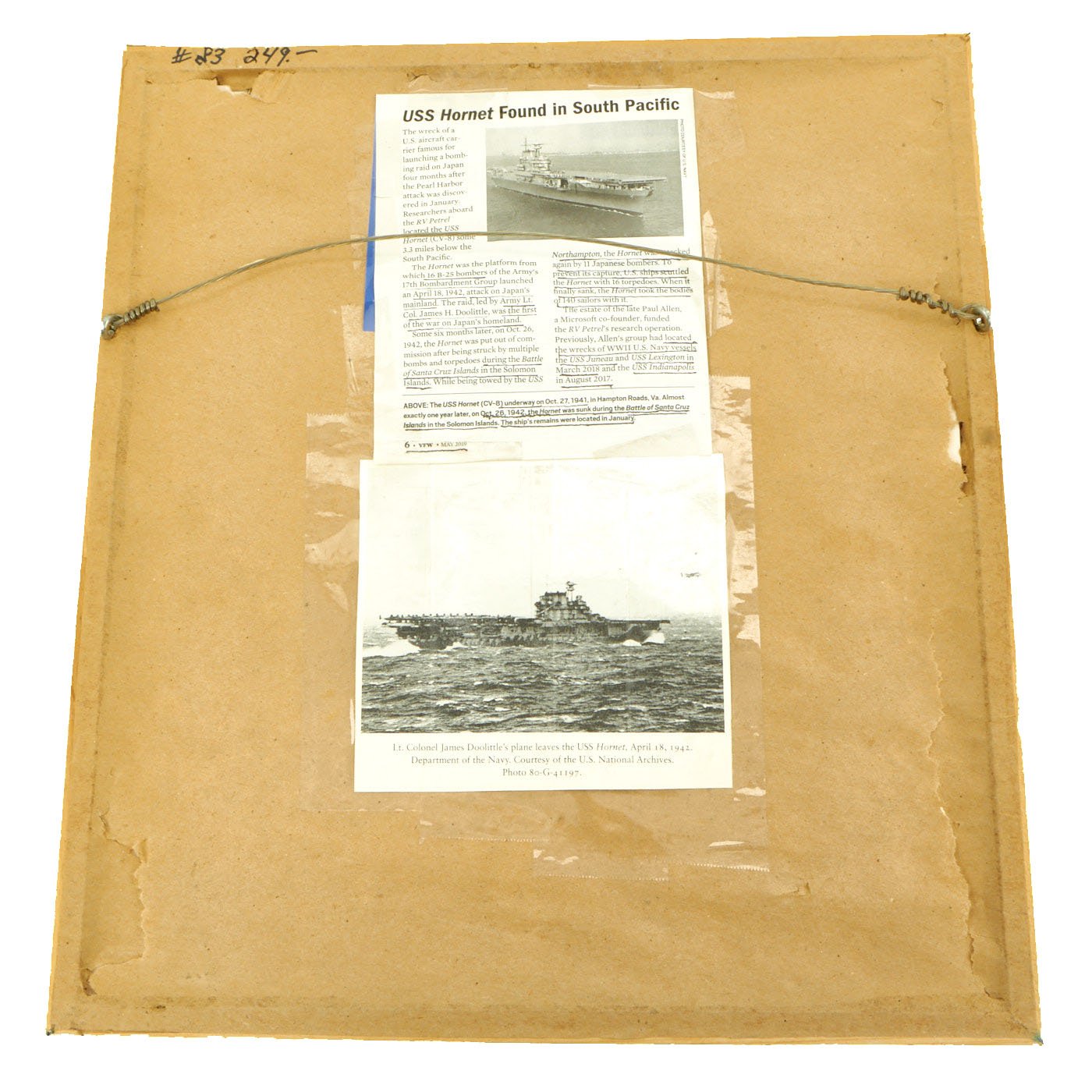 From the Artist: The Hornet's Nest is a painting which holds a great deal of personal meaning to me. Jimmy Doolittle and his men represent heroism and patriotism paralleled by few during a time in our history of great fear and uncertainty. It was my goal in producing this piece to portray the anticipation and impending excitement of those preparing to launch the first strike against an enemy which had sworn to take away our freedom. In the research process for completing the painting, several members of the Tokyo Raiders themselves were of great assistance in providing information not often found in history books. Details such as the U.S.S. Enterprise's F4F Wildcats flying overhead, or a number of Doolittle's B-25s bearing cowling rings painted in their individual squadron's color particularly interested me. I had just begun the planning process for the painting when I had learned of Jimmy Doolittle's passing from this life. In this age we live in, as our nation's memory of its great history begins to slowly fade, I thank God that I have had an opportunity to keep it alive in this small way for those who will cherish our heritage in years to come.