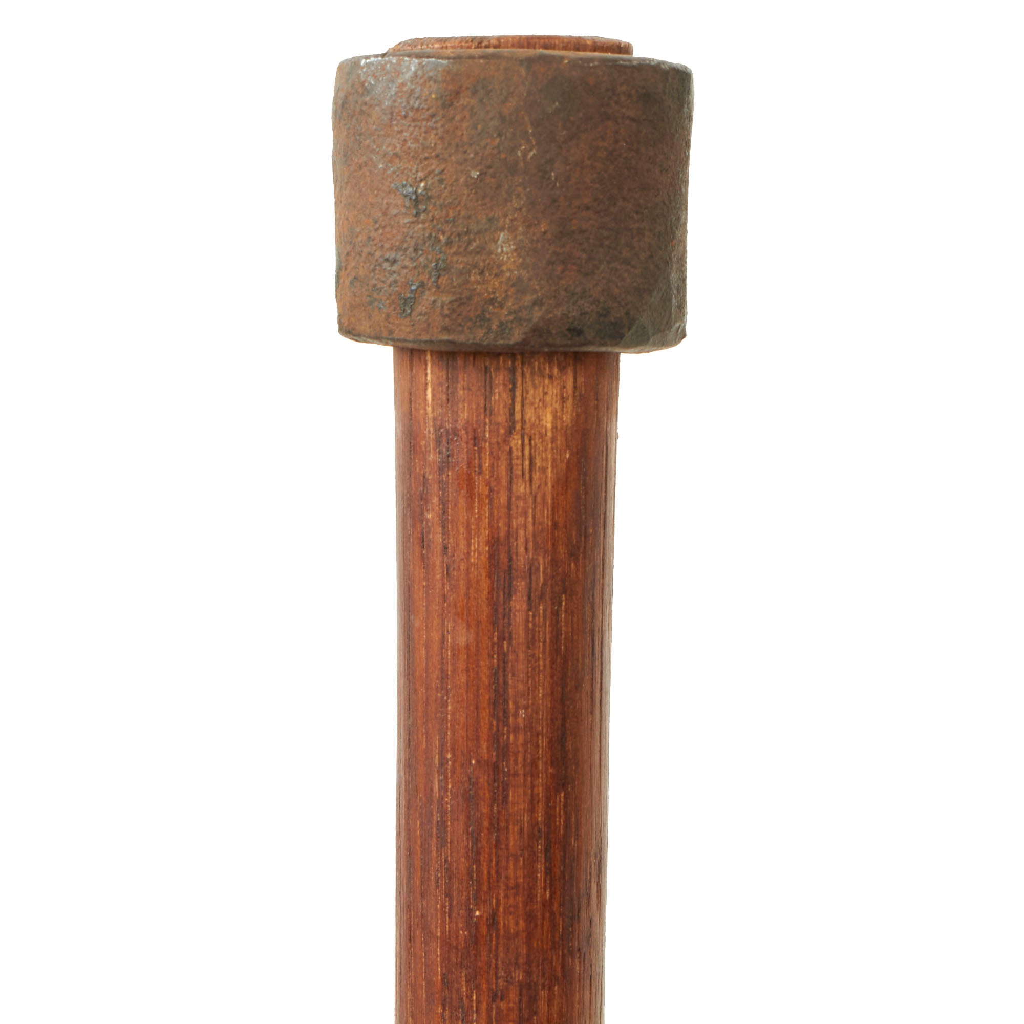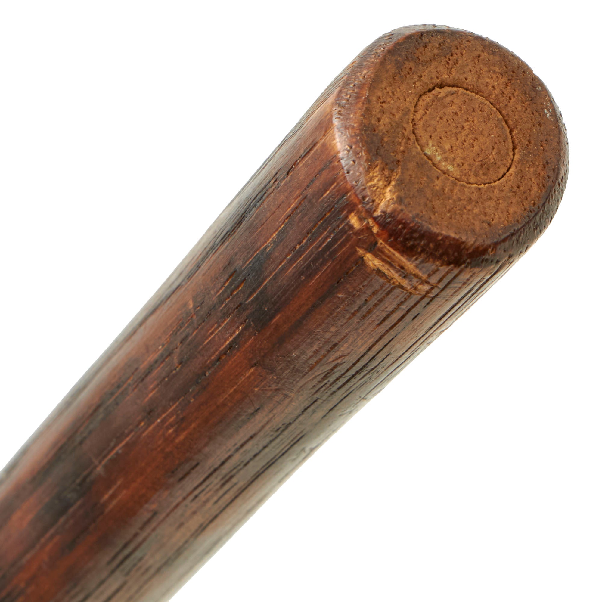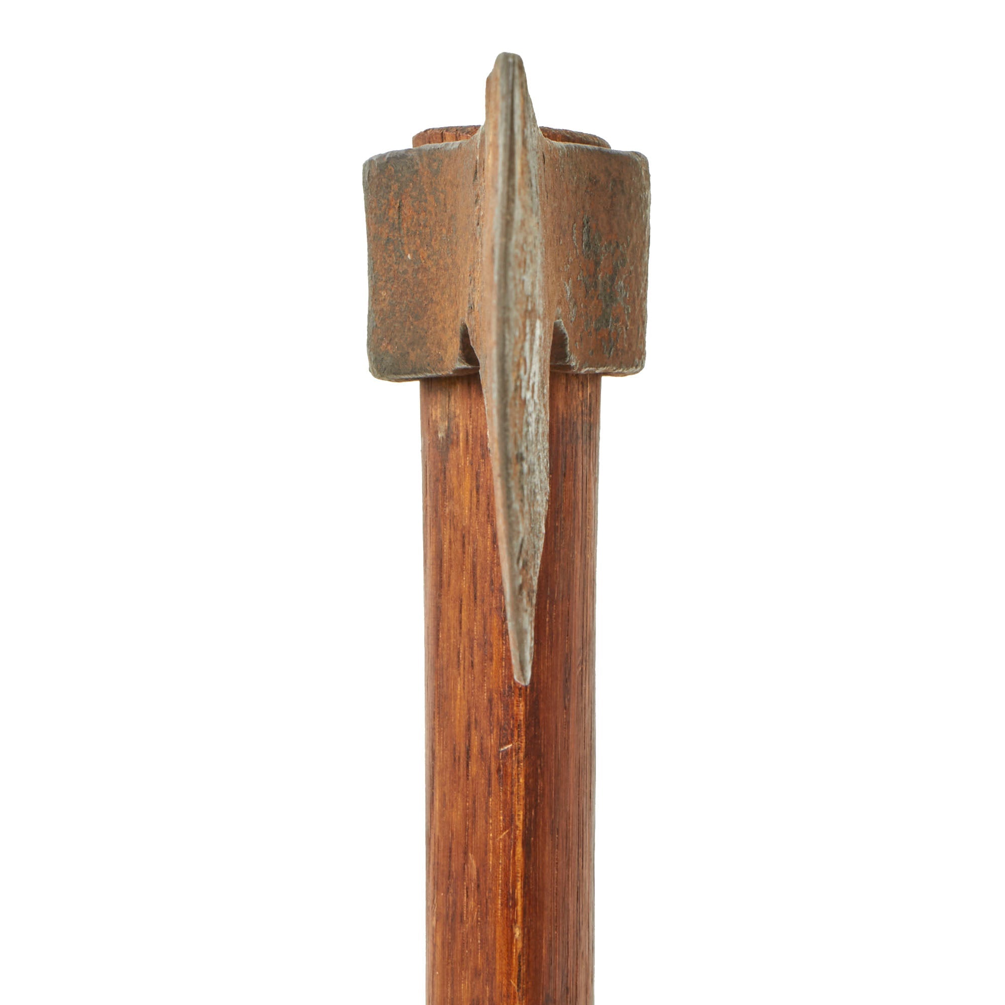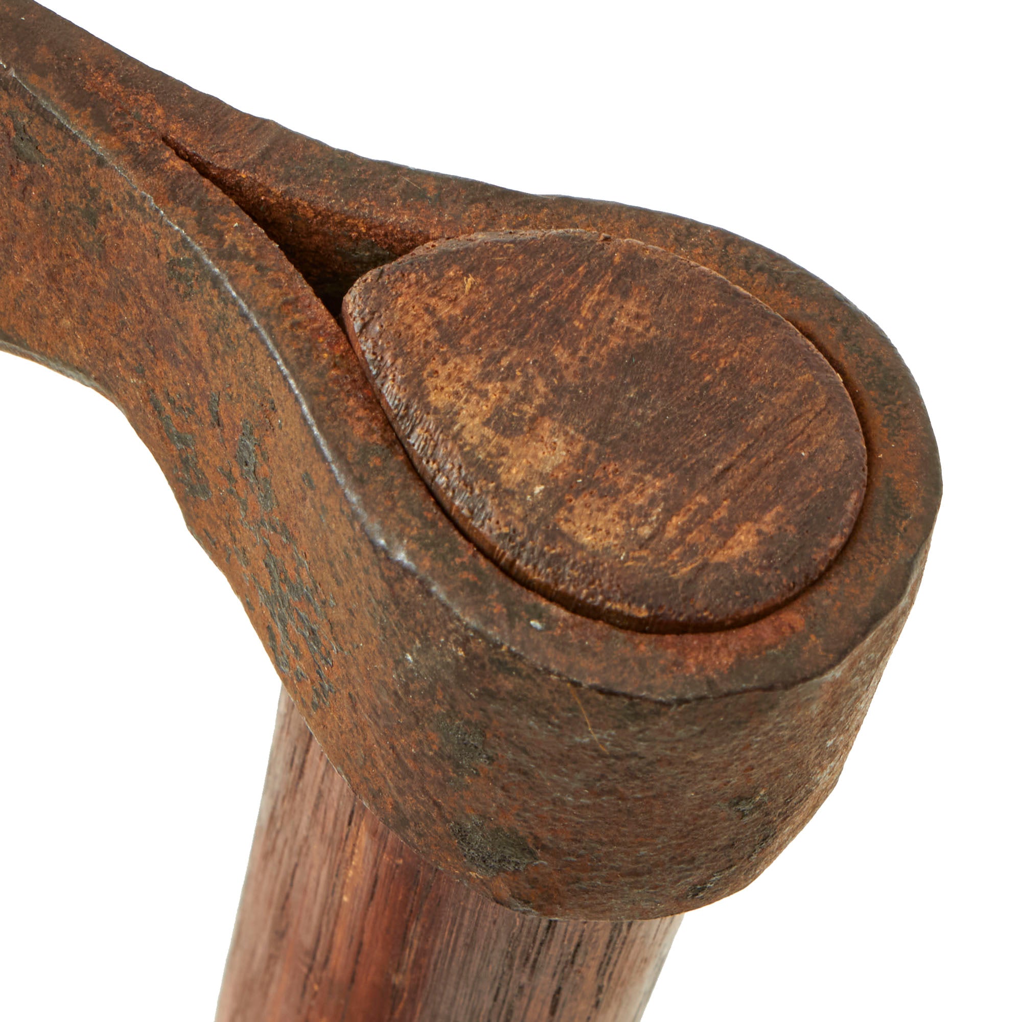 It seems that this tomahawk was dug out of the ground, as there are evident signs of old pitting on the head. The length of the head of the tomahawk measures approximately 5 1/4 inches with an edge width of 2 ¾ inches, while the handle is about 17 inches long. There is a blacksmith marking present that reads 'EE' or ‘SS’ although we have not been able to find any reliable information regarding this marking.