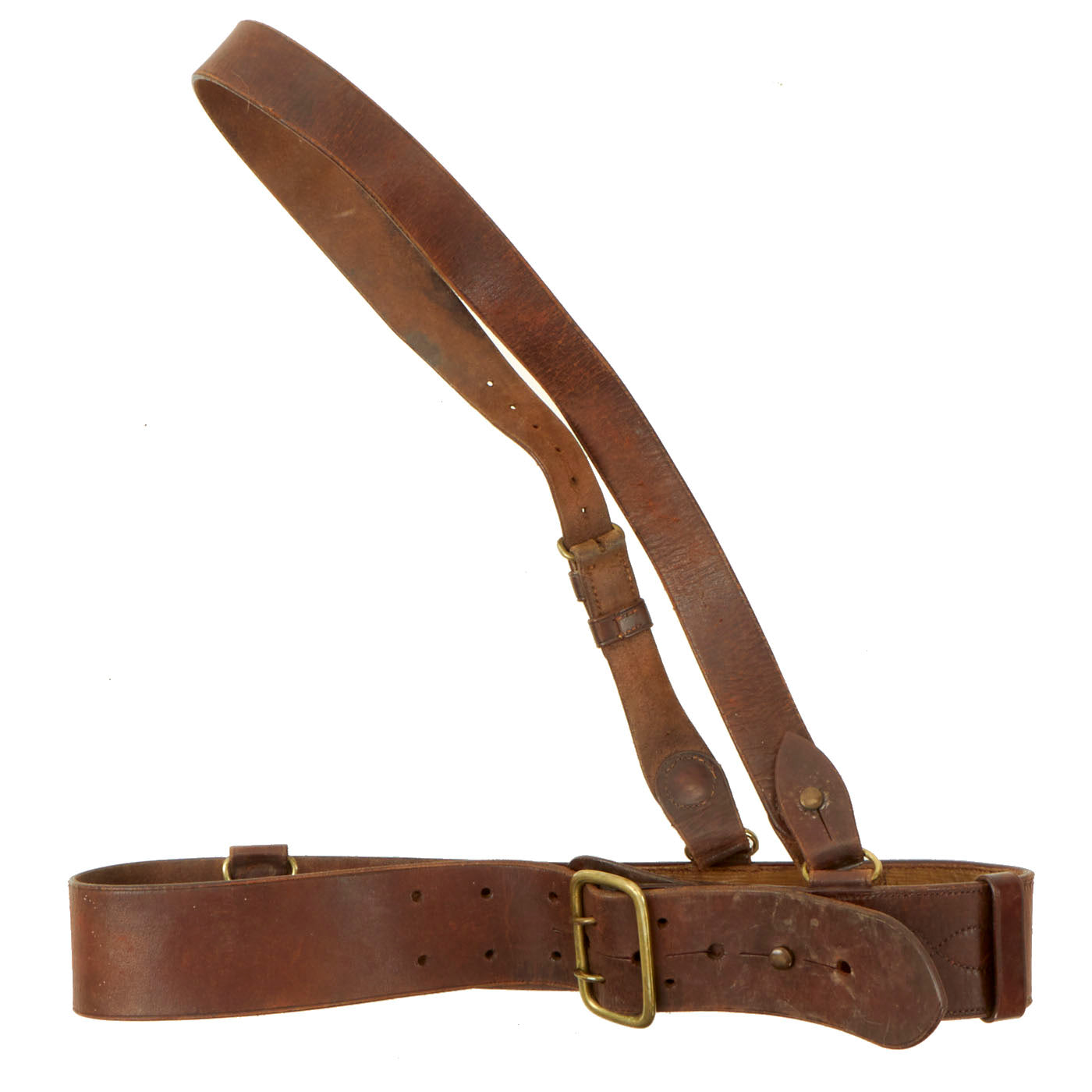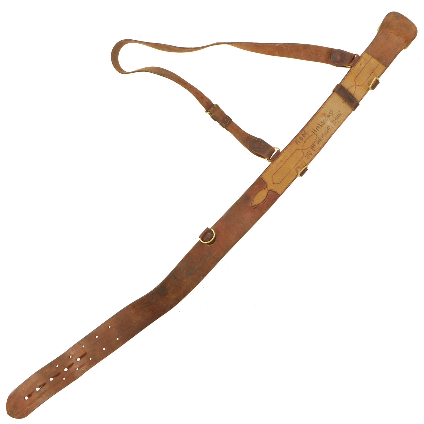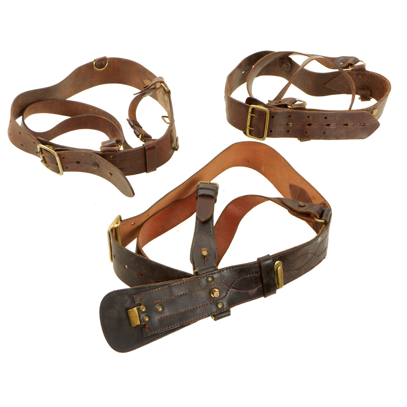 All 3 belts are complete with buckles, snaps and leather shoulder strap. They are all still in serviceable condition and one of the belts is named to a RSM Halstead of the 1st Armoured Division (UK). They are free of damage and have minor cracking in the finish.