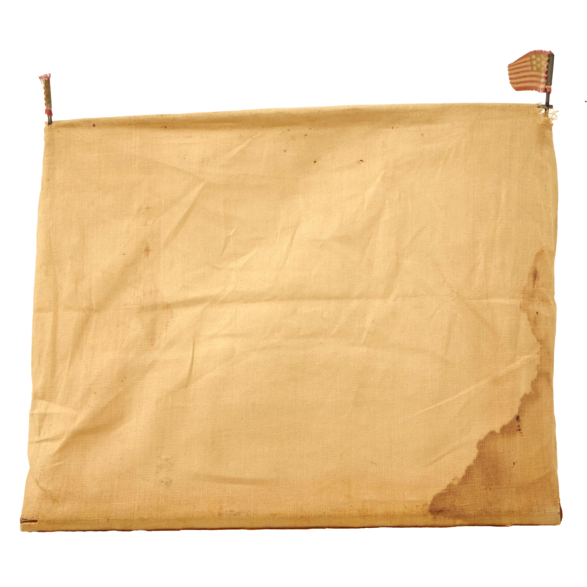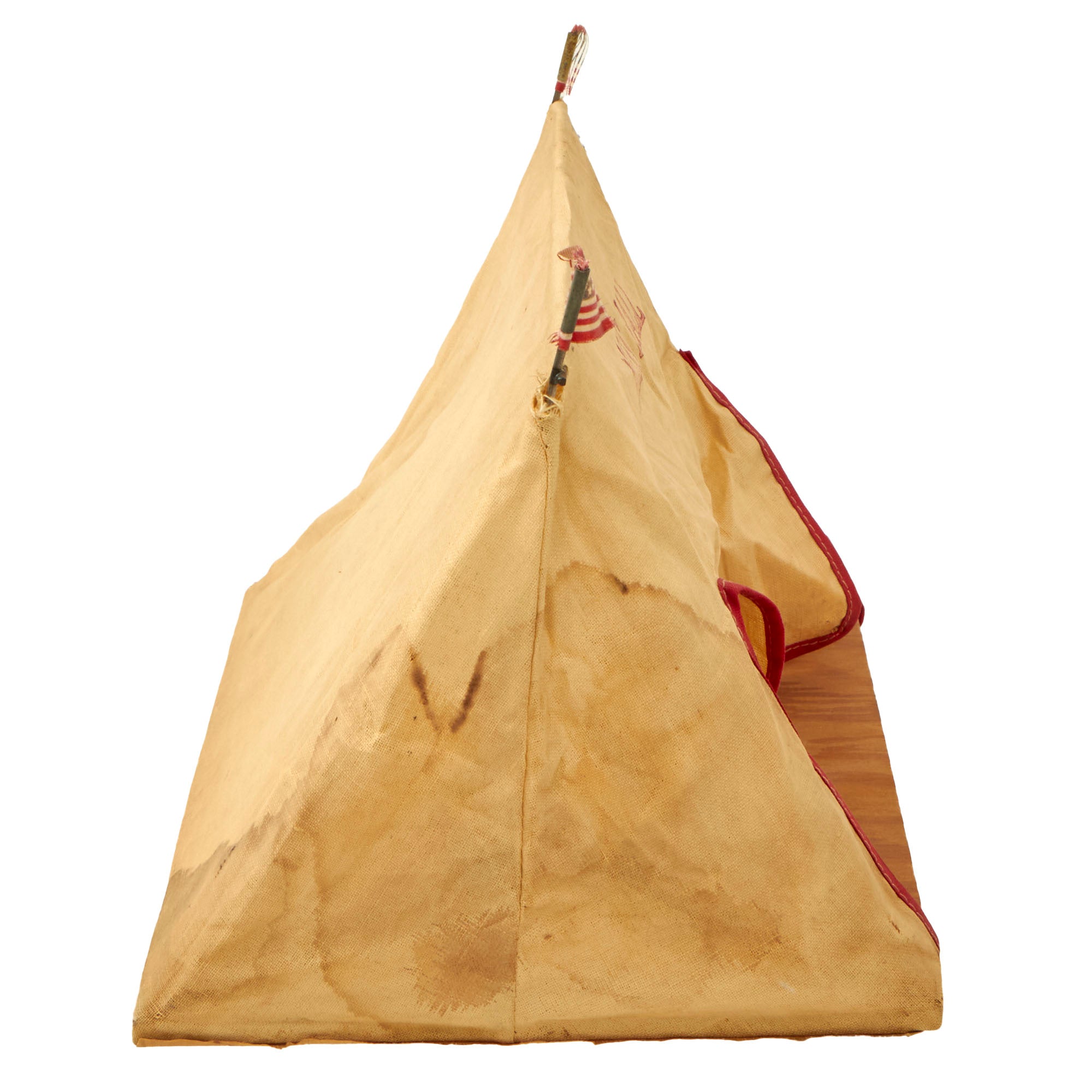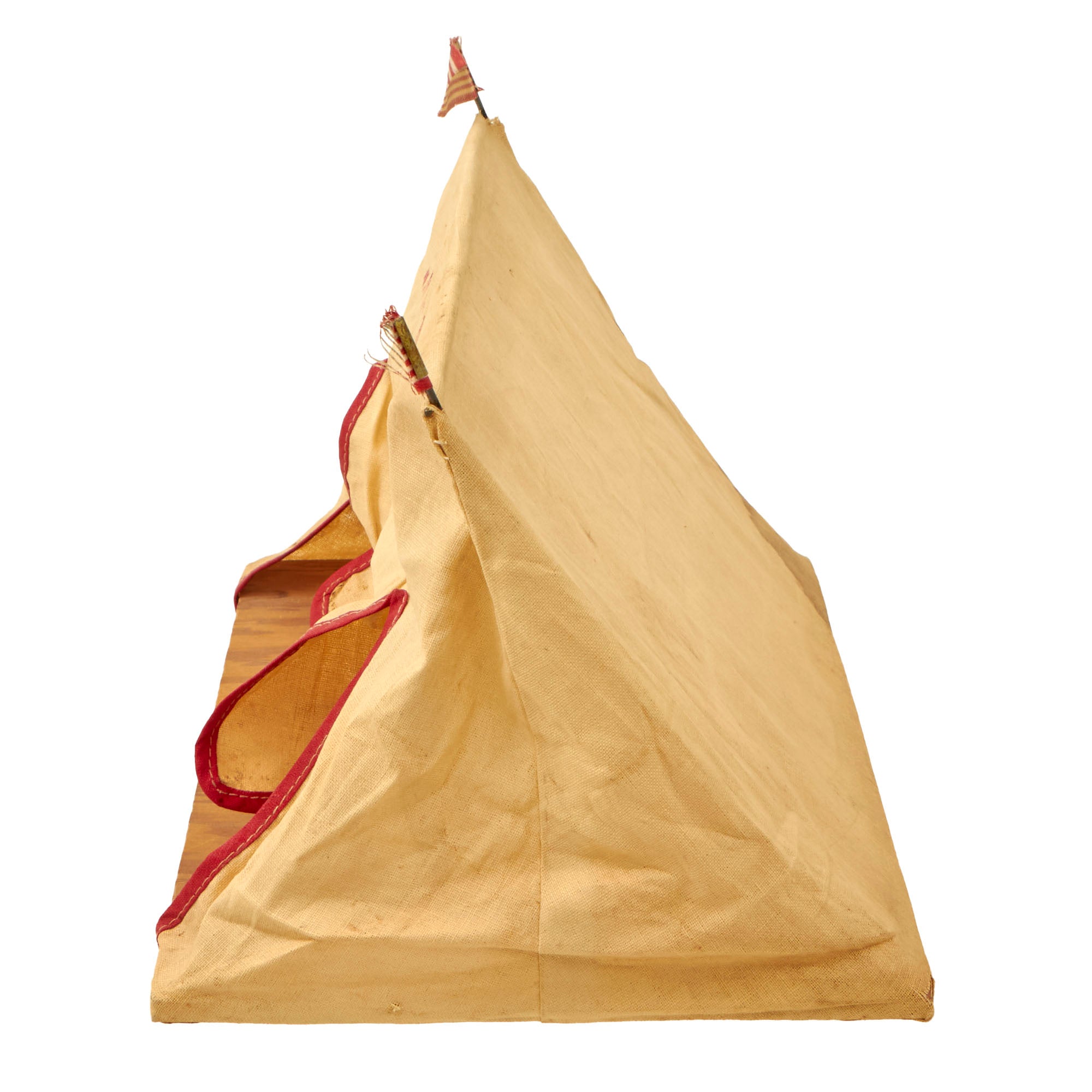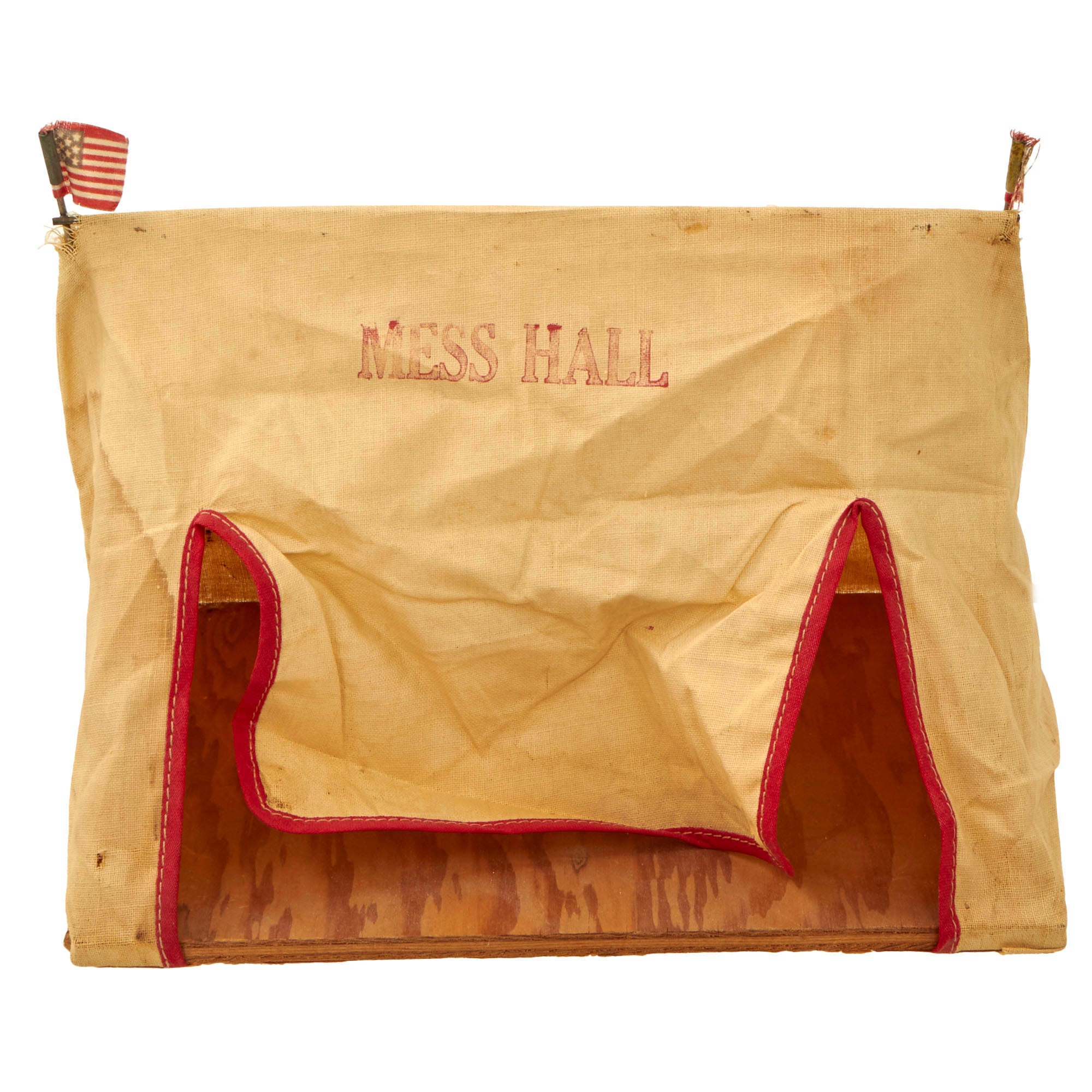 - A small cloth mess hall on a plywood base with two small rods to hold it up. On the ends of the rods are American flags, but one of the flags is gone. The front reads MESS HALL. Cute addition.