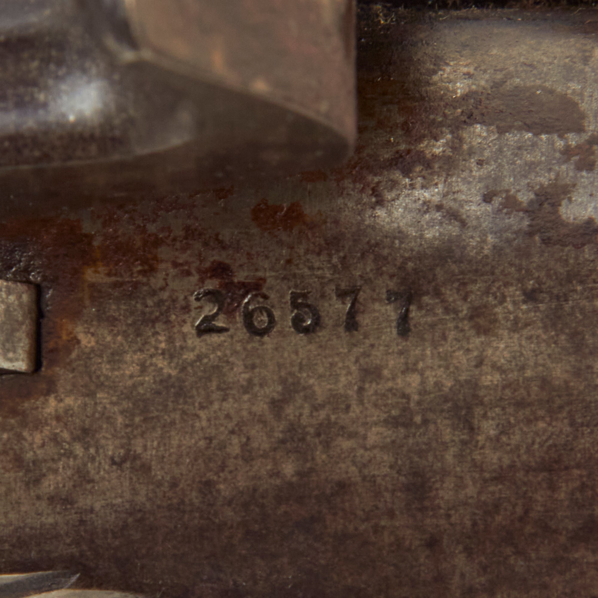 The fore stock is in very good condition, with some dents and light wear, but no cracks or slivers missing along the woodline. The butt stock is in really great shape, with a lovely finish and color, and has no cracking where the magazine channel. This is definitely a rarity, as the channel weakens the wood, and makes it much more susceptible to expansion related cracking, as the metal channel does not shrink due to moisture, as the wood does. There are also still inspector cartouches on the left side to the rear of the saddle ring bolster, however we cannot quite make them out due to wear.