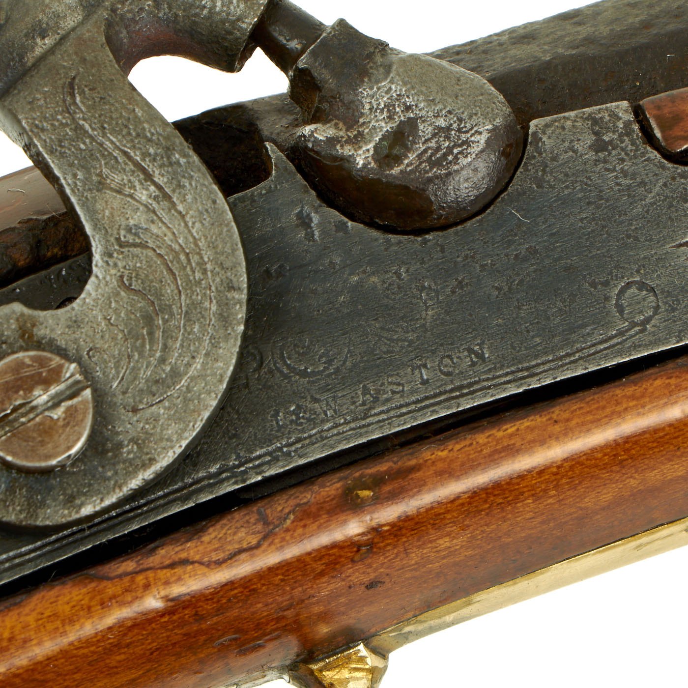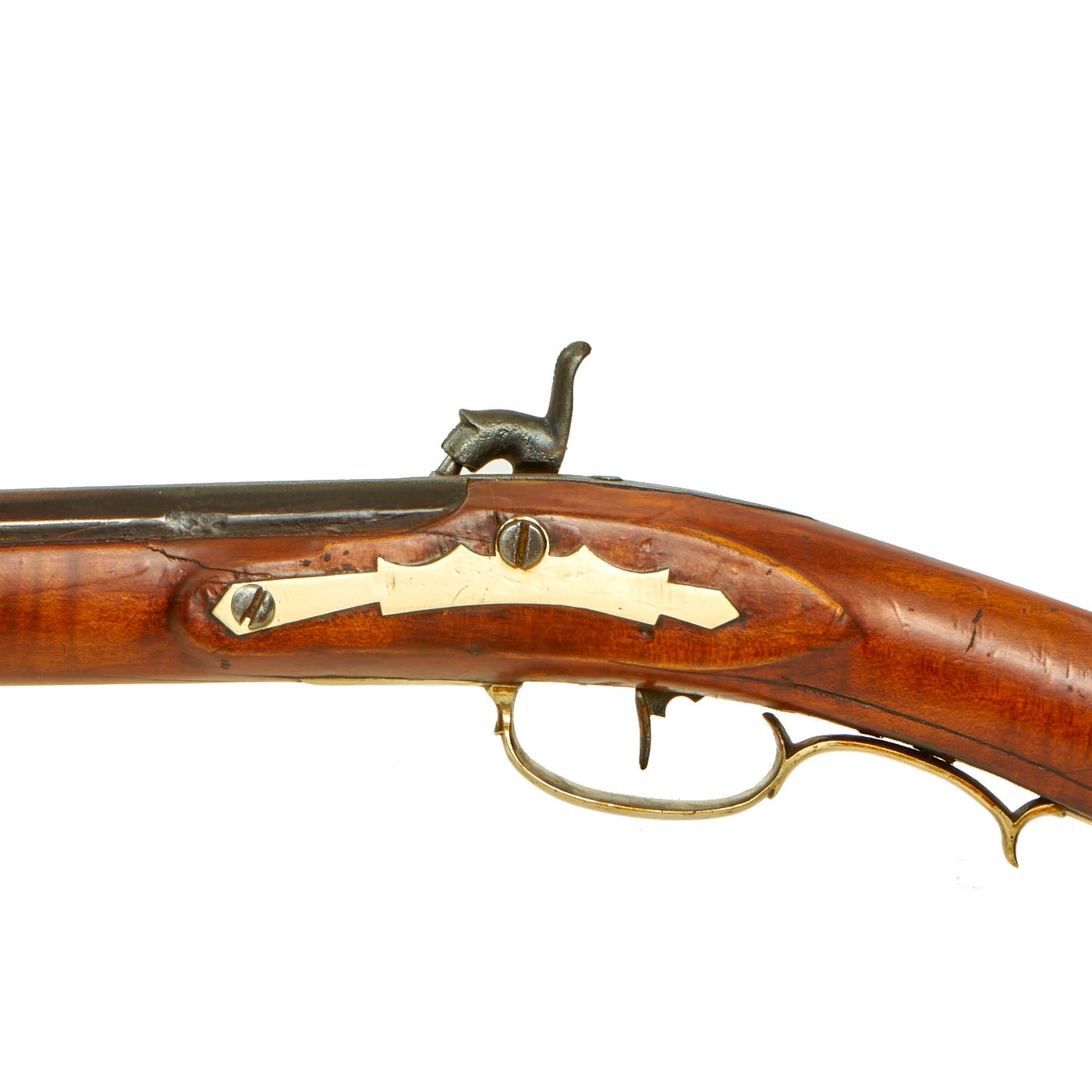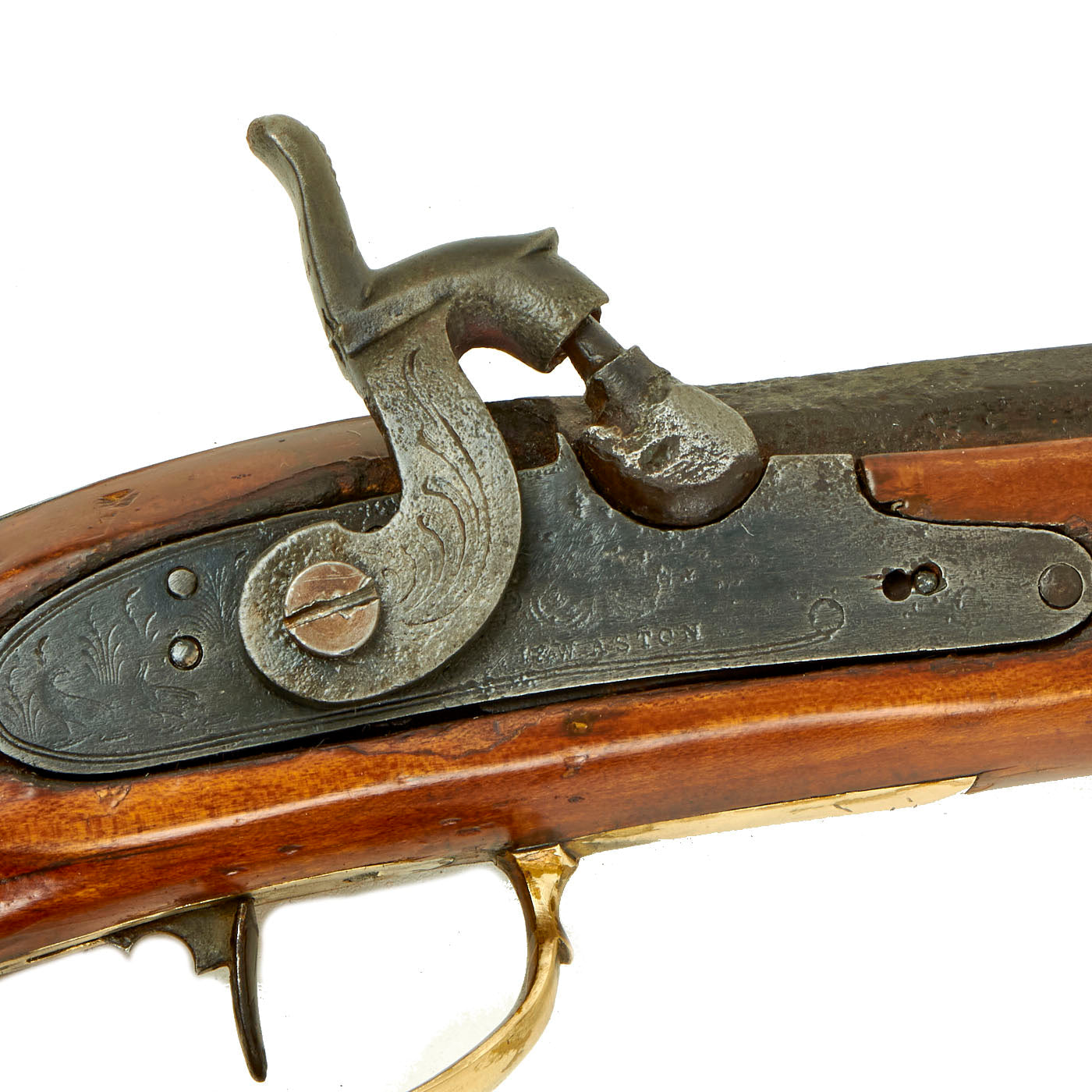 The engraved lock plate is marked at the bottom with J. & W. ASTON, a known maker of this type of rifle from the mid 19th century. We have not been able to find much at all about this maker, which could also be a retailer or importer. Many of these Pennsylvania rifles used "trade" locks, which could be imported from others states, or more often from England.