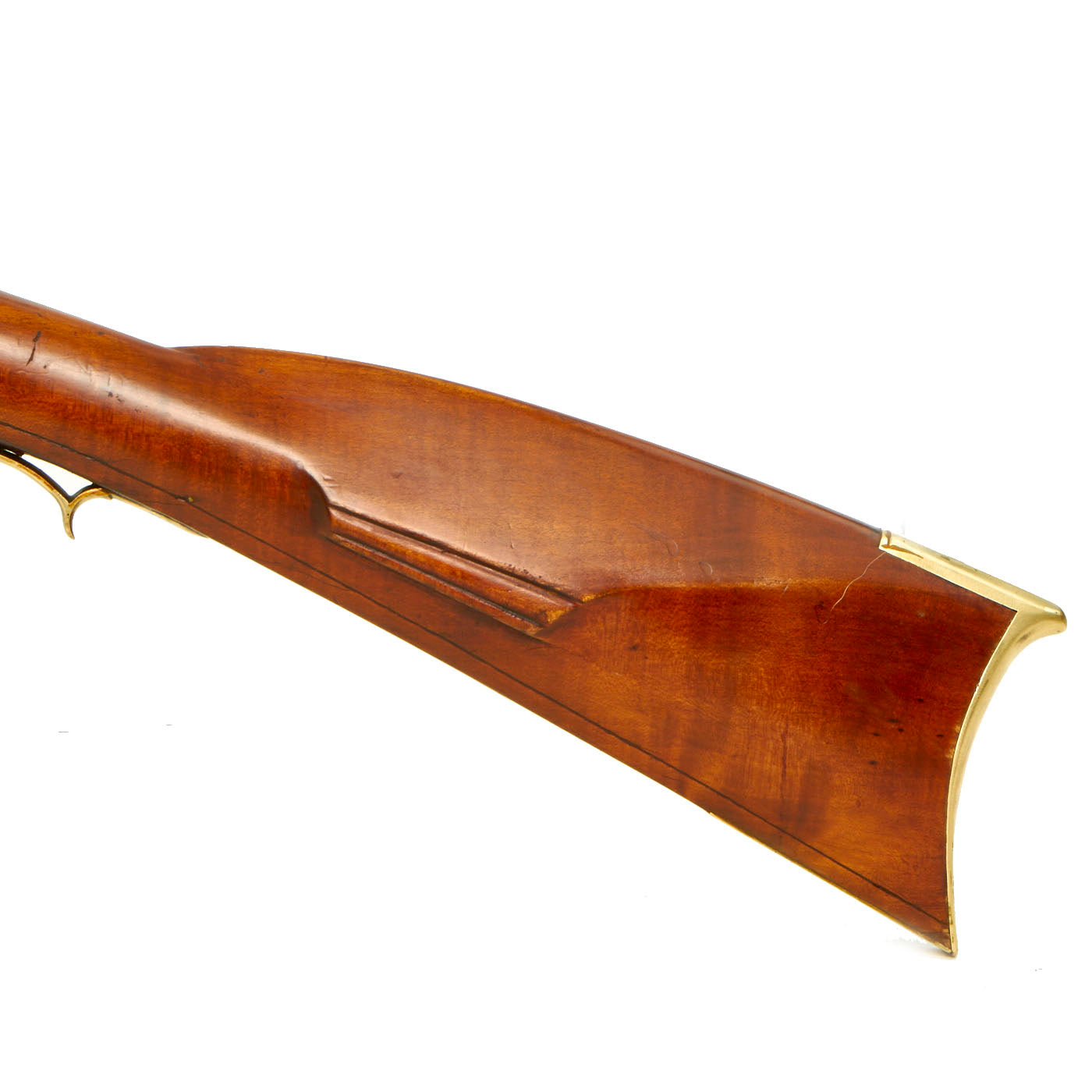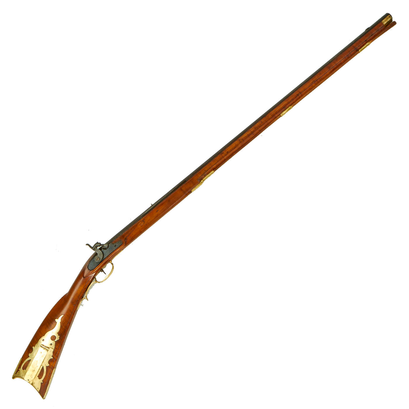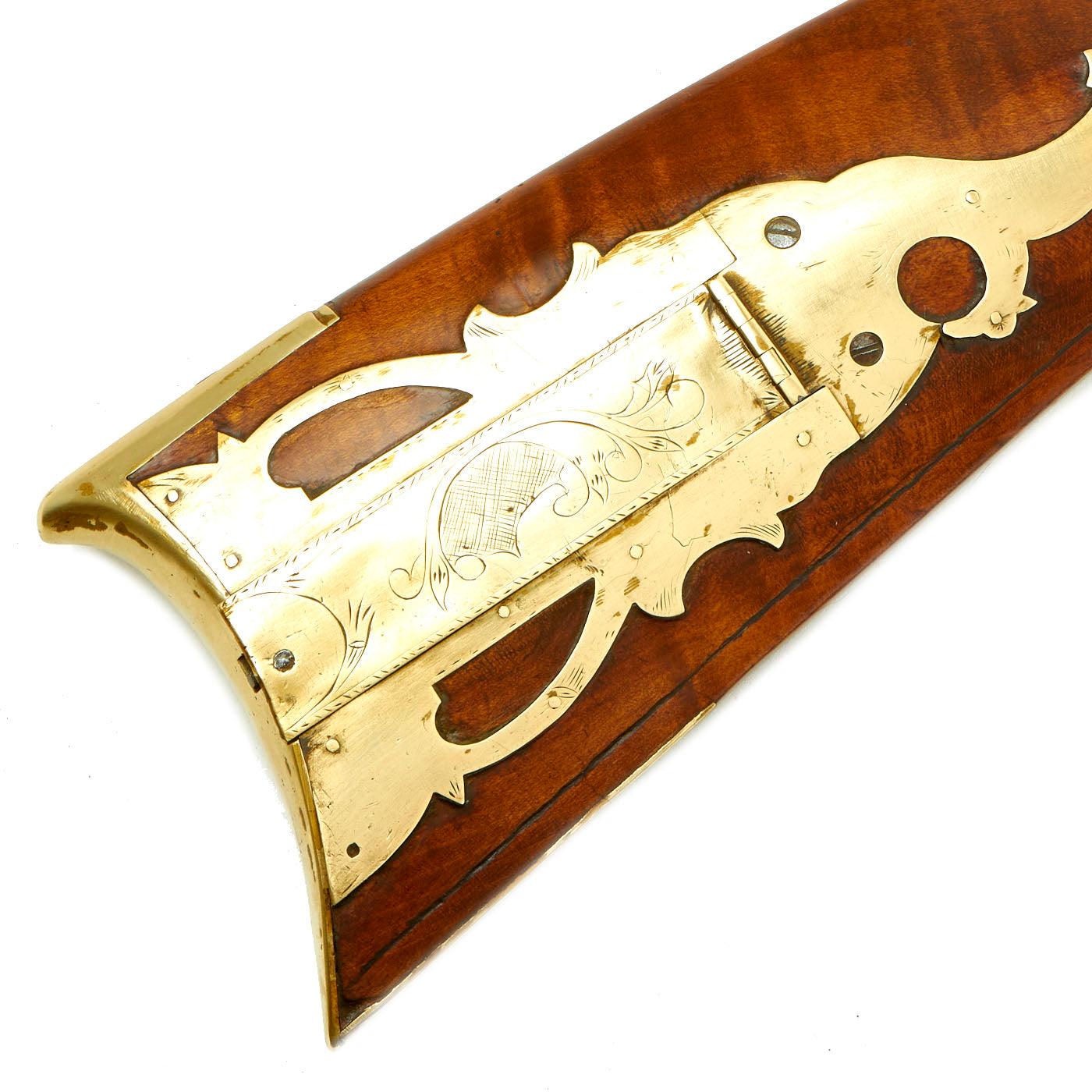 The engraved lock plate is marked at the bottom with J. & W. ASTON, a known maker of this type of rifle from the mid 19th century. We have not been able to find much at all about this maker, which could also be a retailer or importer. Many of these Pennsylvania rifles used "trade" locks, which could be imported from others states, or more often from England.