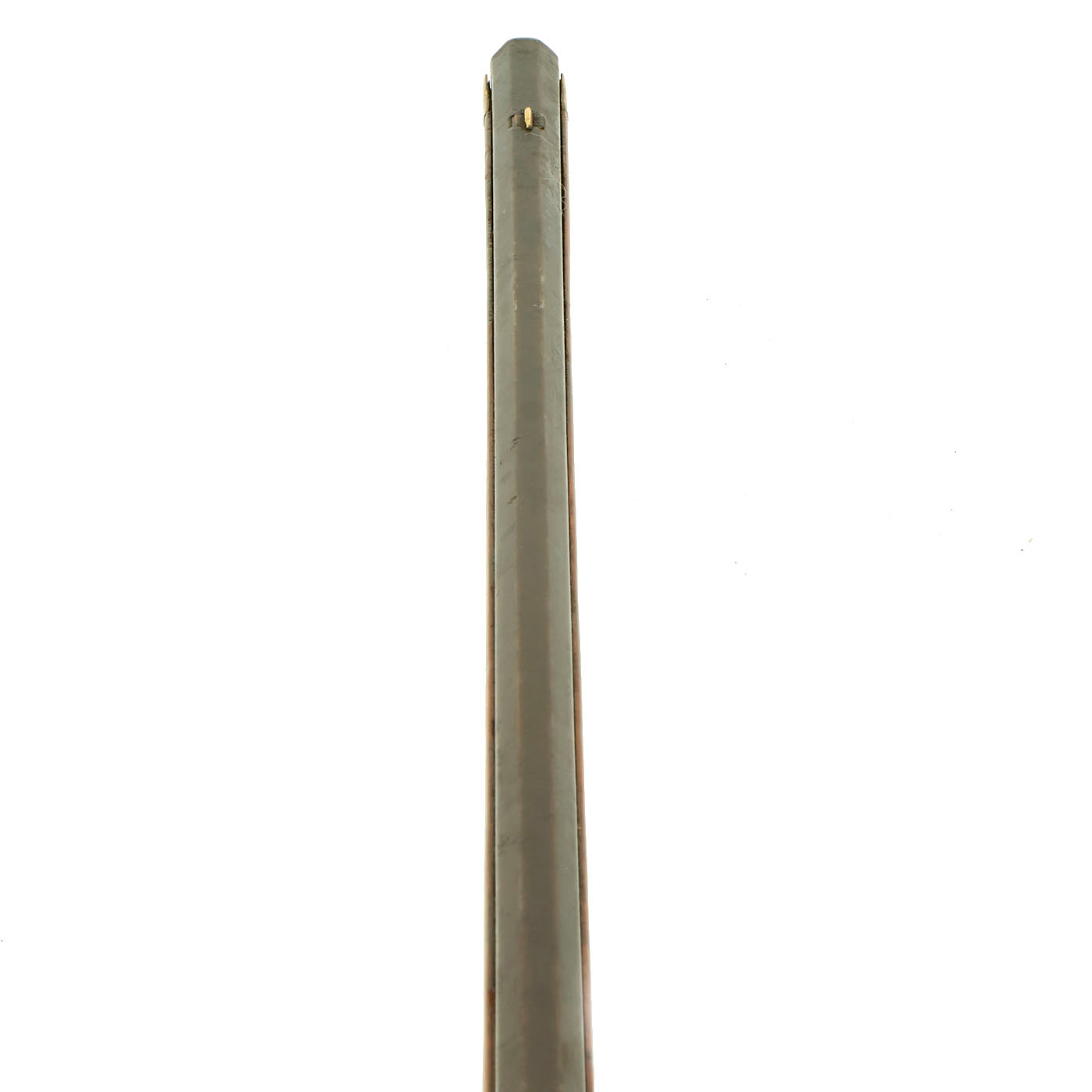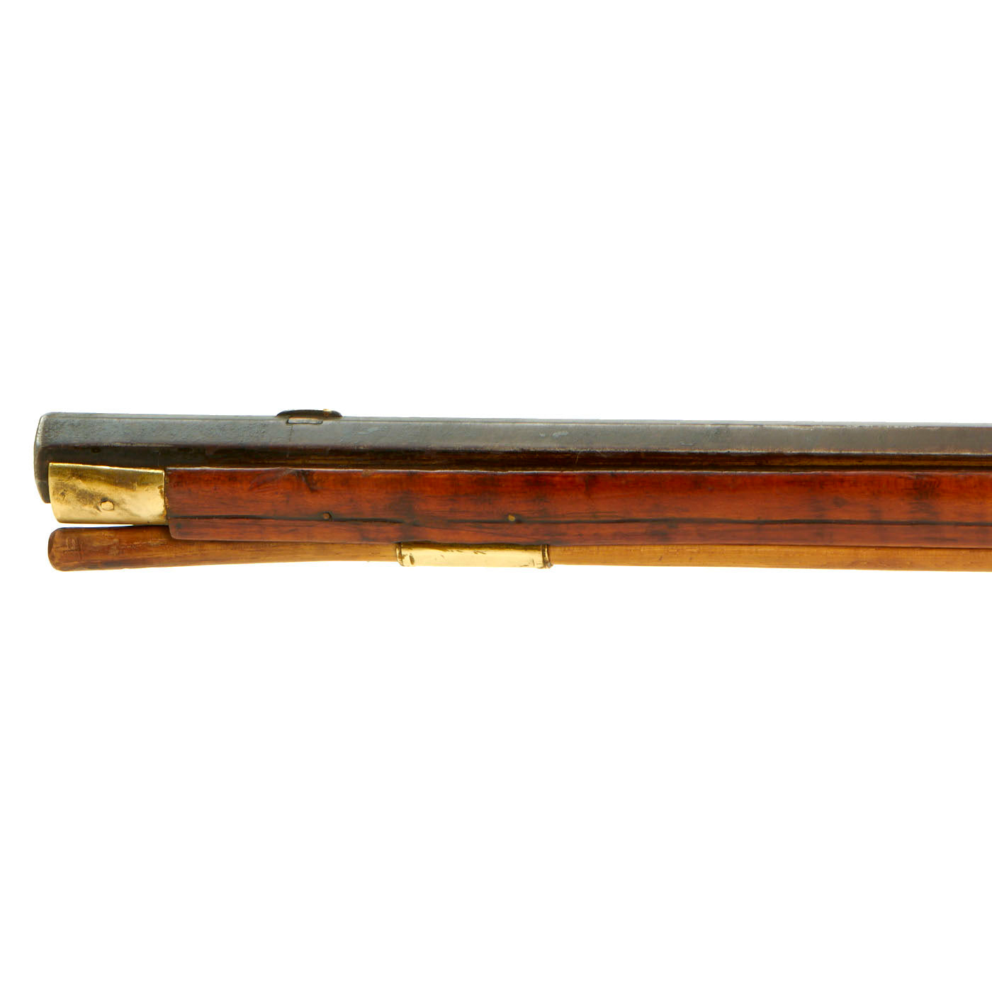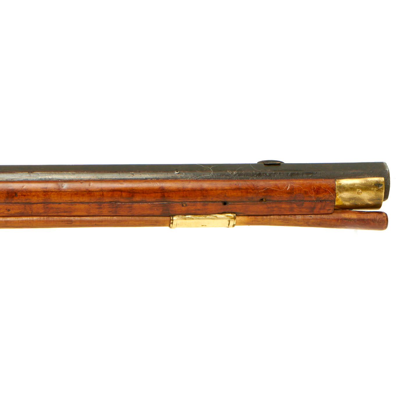 We estimate that this octagonal barrel rifle was made about 1840, and features all brass mounts with minimal ornamentation. There are dovetail front and rear sights on the barrel, the rear made from copper and the front with a copper base and brass blade. The lock is the most decorated part of the entire rifle, with lovely foliate engraving on the plate and hammer. It functions, but does not look to have a half cock position at present, and the main spring is fairly weak.