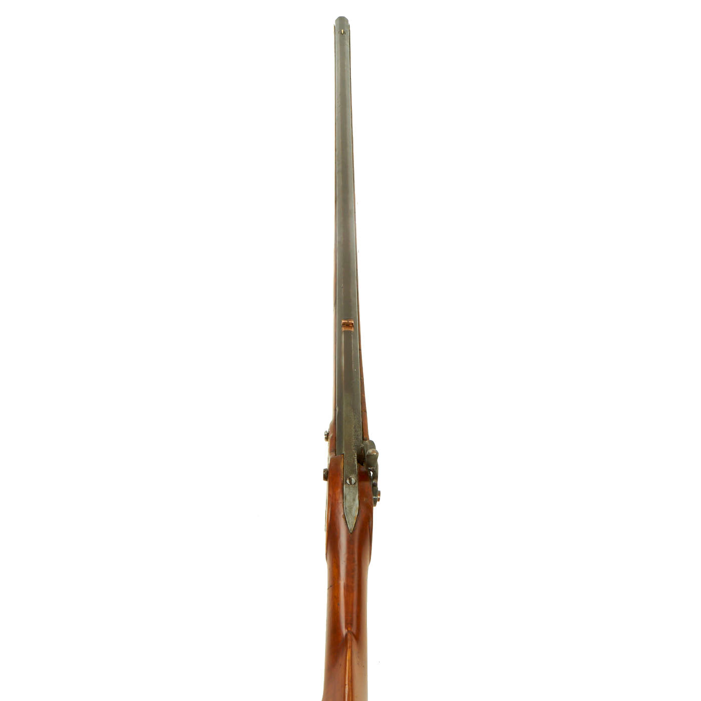 The full length stock is made from very attractive wood, which looks to be maple, stained a lovely chestnut color. There is light figuring throughout the stock, with some 'Tiger' flame figuring on the butt stock, which also has a great "Monte Carlo" style cheek piece on the left side. The right side has a lovely sheet copper patch box, which has minimal engraving. It is opened by pressing a small lever on the butt plate up slightly to release the catch. There is a simple wooden cleaning rod installed, which is most likely only for display.