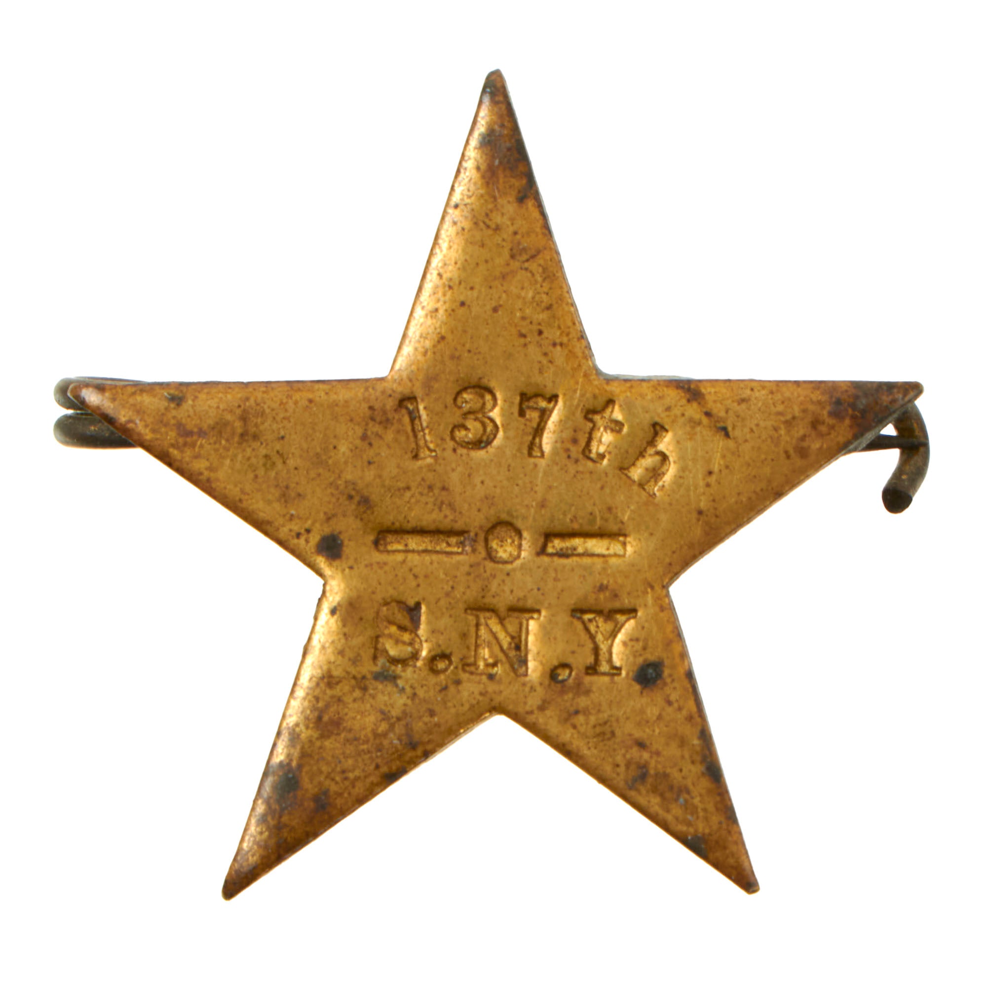 Original Item. Only One Available. This is a very scarce Civil War Corps pin badge for the 137th New York Infantry Regiment, which played a pivotal role in the Battle of Gettysburg. This example could have been worn on a cap but also could’ve been worn on a shell jacket or uniform. The badge is a star and has a pin-back, reading 137th S.N.Y.. The badge measures 1⅛ x 1”.