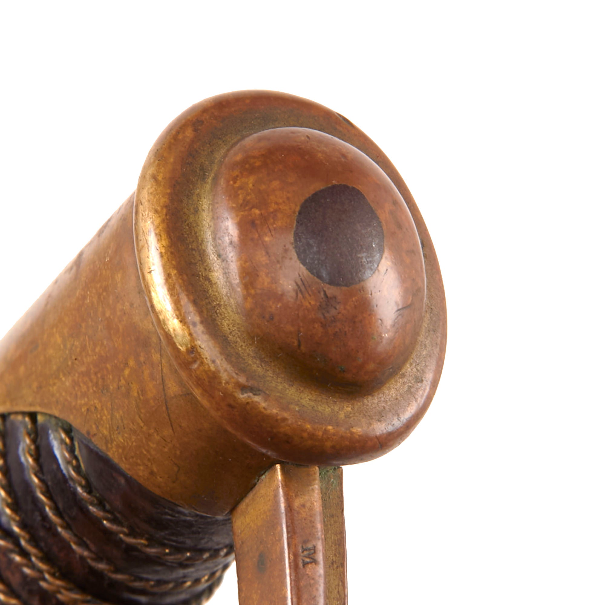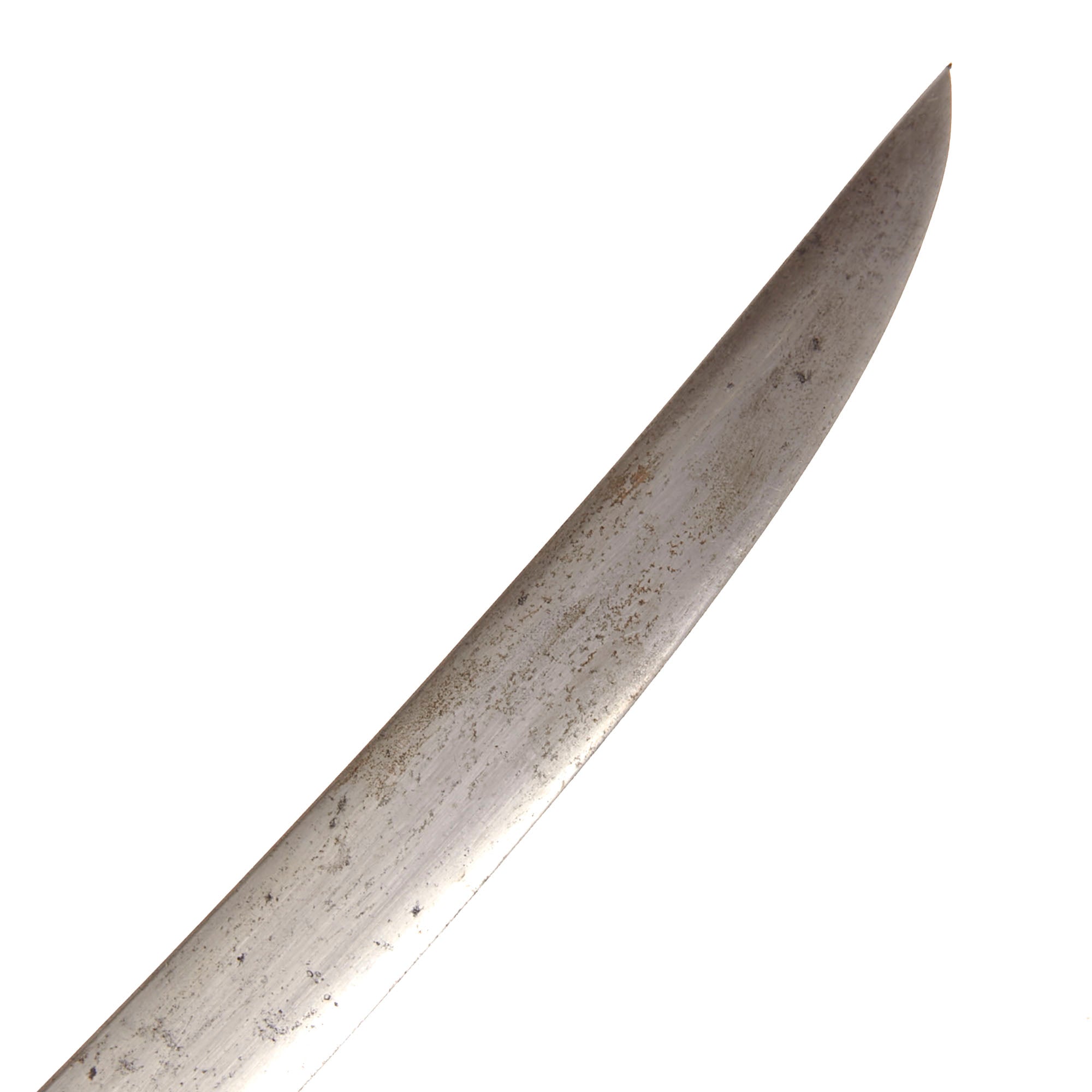 This is a lovely late war dated example. It is in very nice honest matured condition. All markings are clear and the sword is tight and in good order, undamaged, and showing only signs of honest service use. The leather grip binding is still in place wrapped with brass wire, but there are some spots of heavy wear with the wire dislodged. The blade shows only a few small nicks in the blade which are barely noticeable, with a lovely matured oxidized patina.