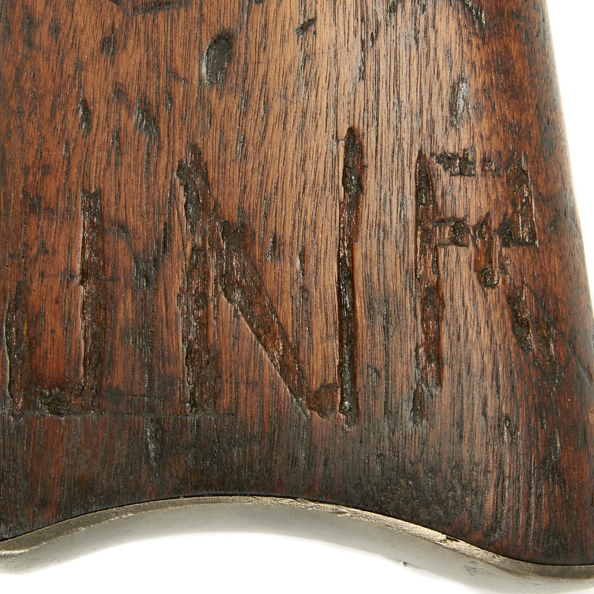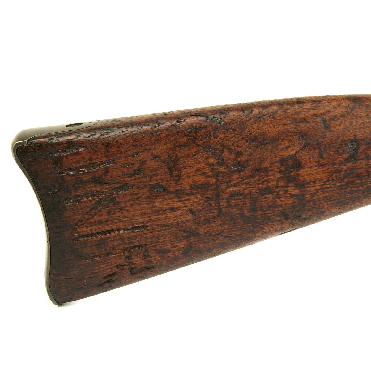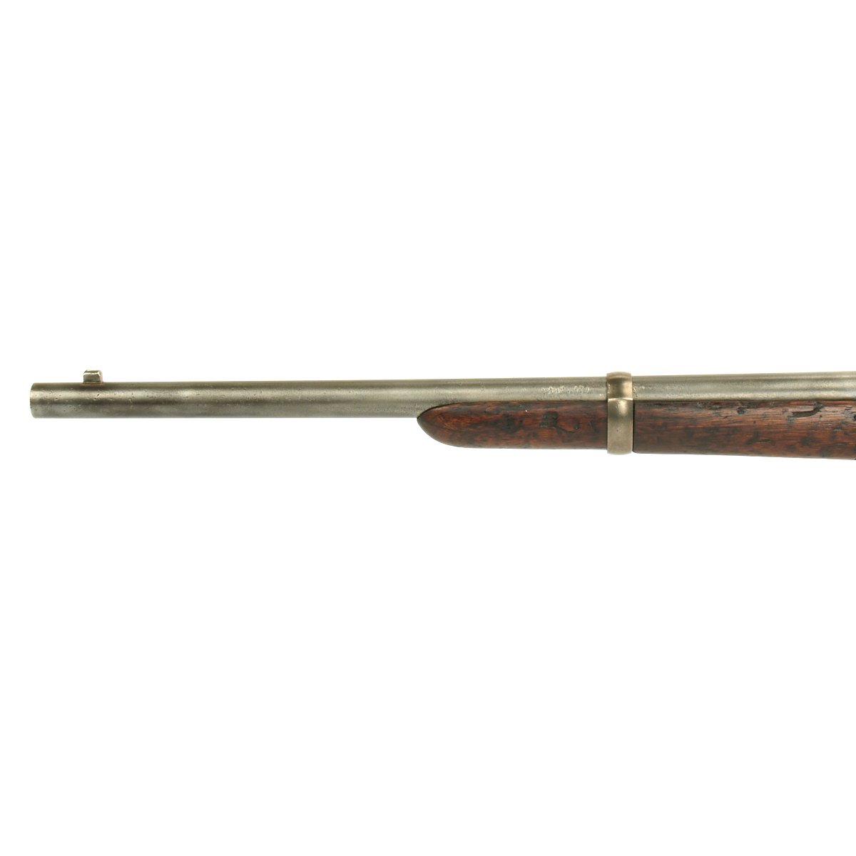 This Peabody carbine is in very good, complete condition and features a 20 round barrel secured to its walnut stock via a single barrel band. Walnut stocks are free of any blemishes. The butt stock has carved soldier's initials J.N.R. and the number 322 is stamped into the opposite side. A small cartouche from a Providence Company inspector shows on the left wrist area of the stock.