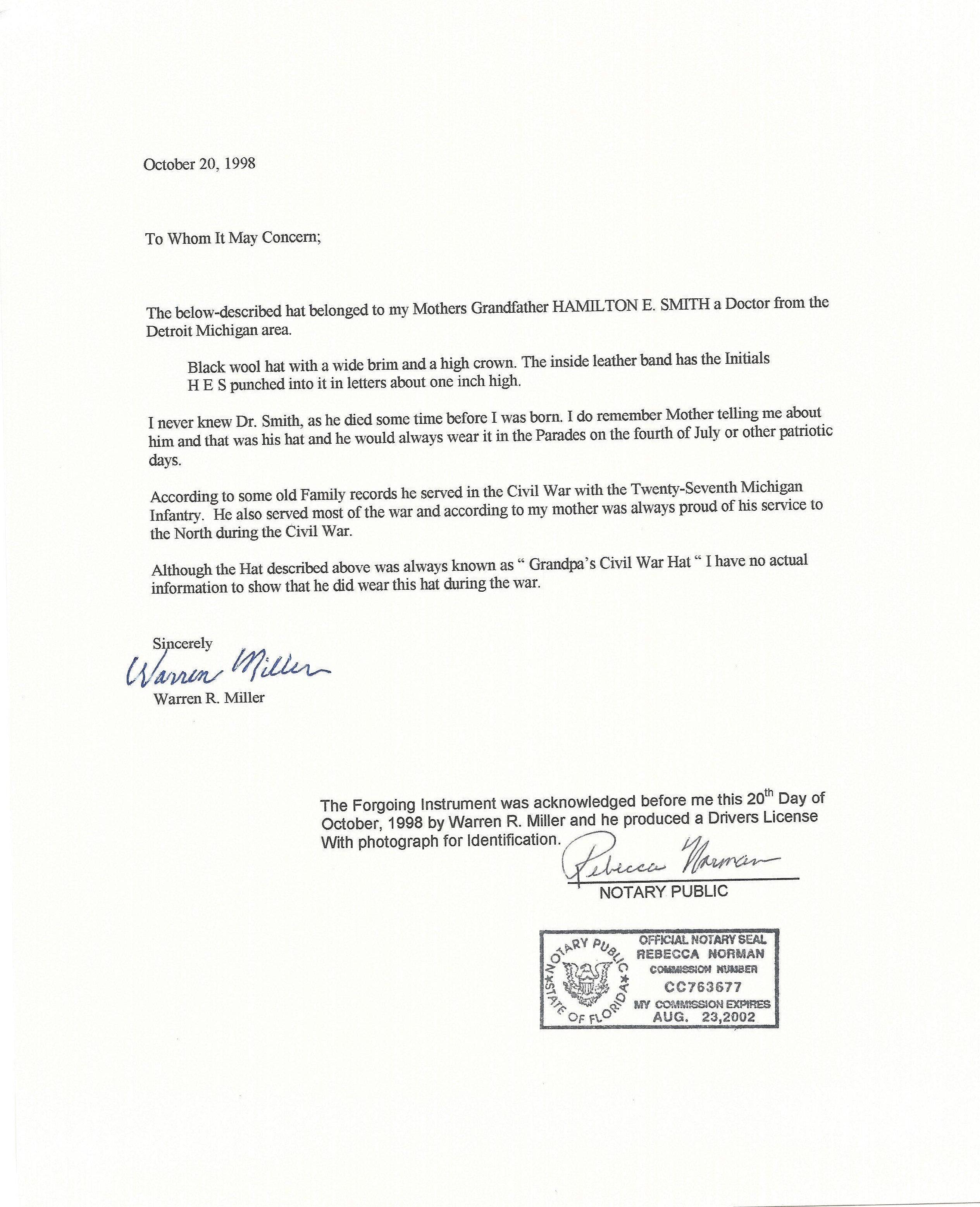 Original Item: Only One Available. During the Civil War Hamilton E. Smith was a member of the Union 27 Michigan Infantry. He entered the war with the rank of 1 Asst. Surgeon, and left with the rank of Surgeon. Accompanying the hat is a 1998 dated notarized letter from his Great Grandson. It reads:
