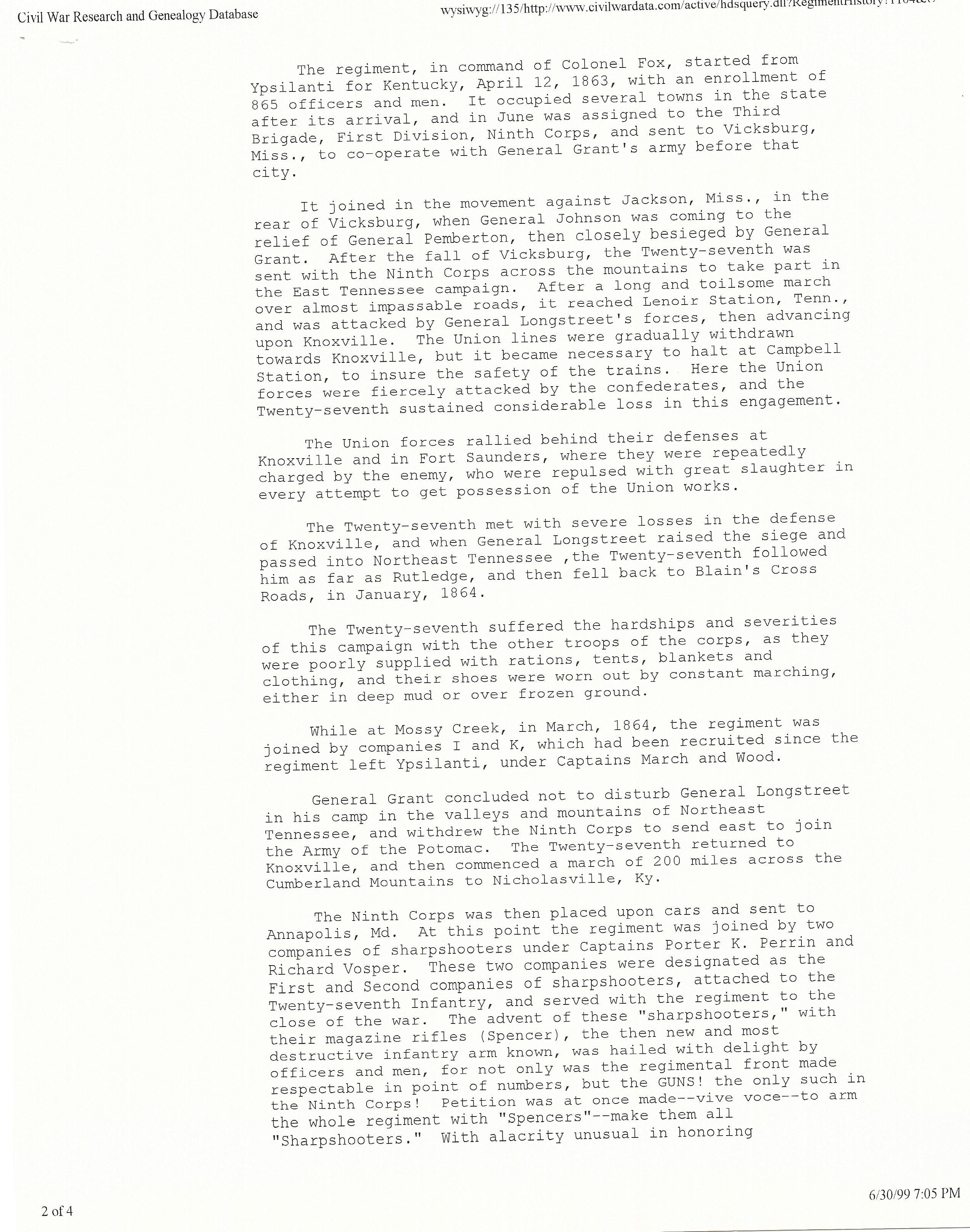 The Twenty-seventh Michigan was composed of companies from the Upper and Lower Peninsulas, and its organization was partially completed at Ypsilanti, and eight companies were mustered into service April 10, 1863.