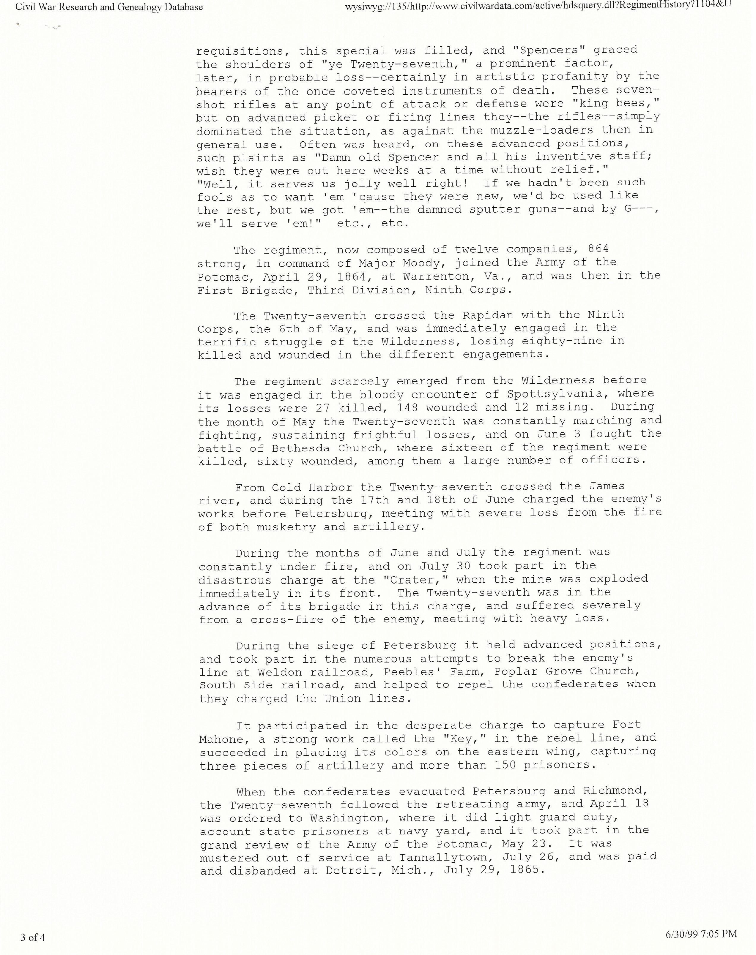 According to some old Family records he served in the Civil War with the Twenty-Seventh Michigan Infantry. He also served most of the war and according to my mother was always proud of his service to the North during the Civil War.