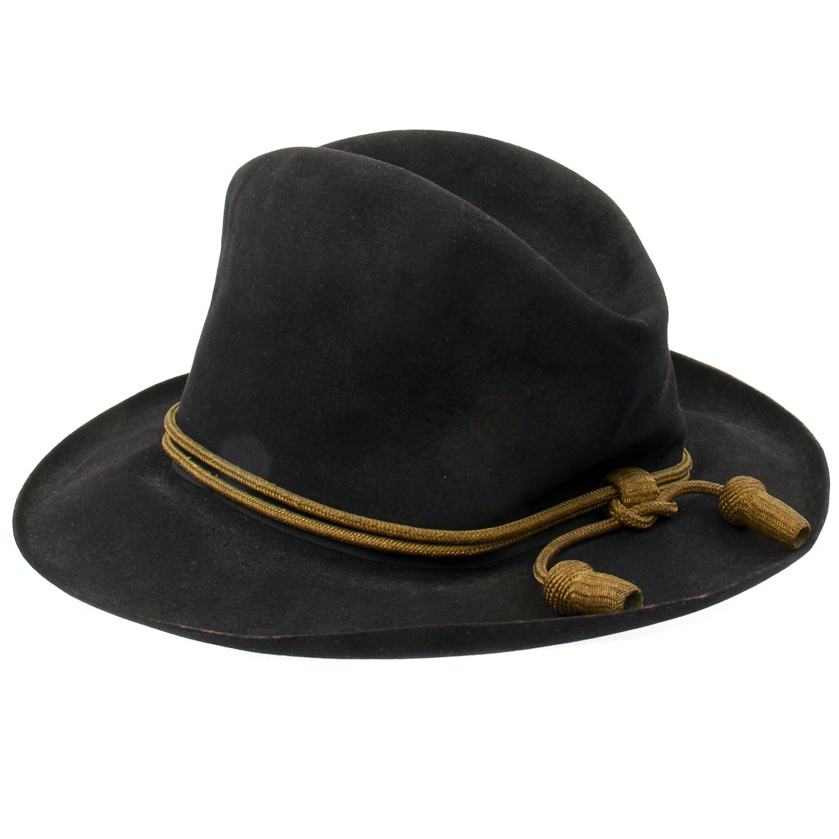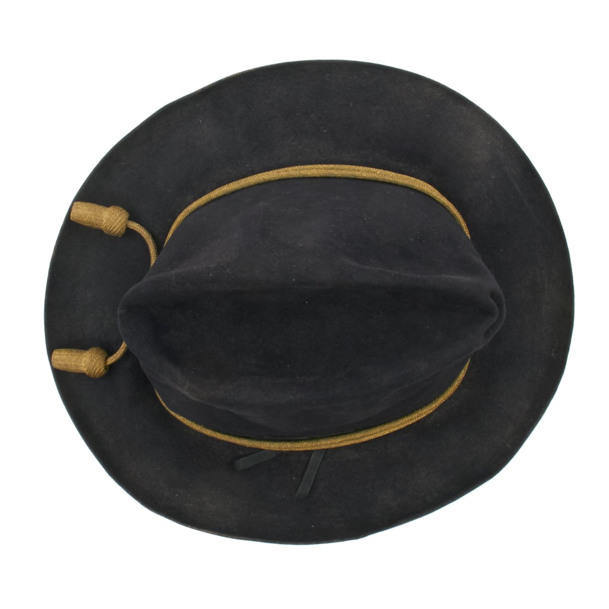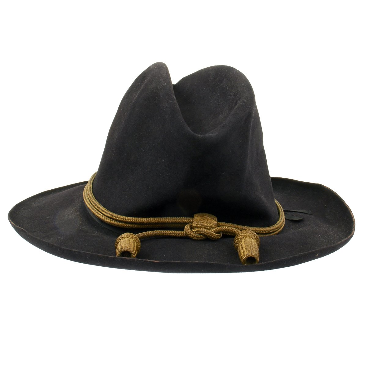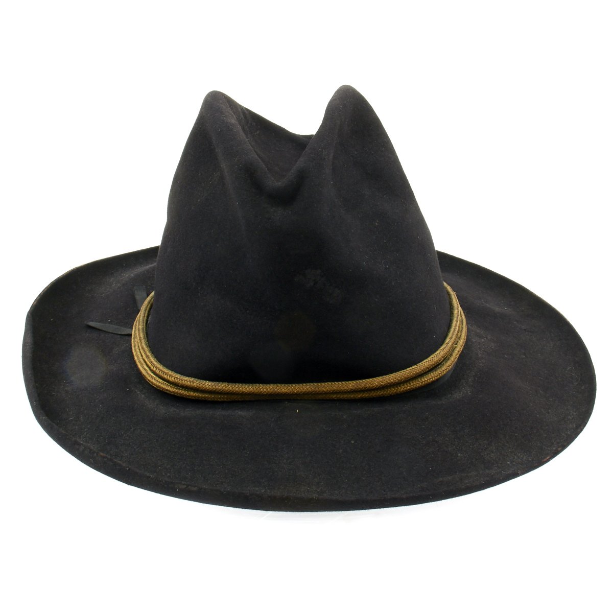 This is a post Civil War circa 1870s-1880s campaign hat. It is constructed of black fur felt with grosgrain ribbon hatband, the brim does not have stitching indicating an early specimen. This black felt hat became symbolic of the Army on the western frontier and today is one of the most highly prized pieces of military headgear. The brim measures approximately 3 inches wide. The crown measures approximately 5 inches high. This hat comes complete with an 1870s-1880s Gold Cavalry officer hat cord. Interior has a leather sweatband embossed The Diadem. The sweatband is also punched with the initial HES. Original paper size label still present under sweatband. Condition overall is very good. An incredibly rare hard to find hat from a verified Civil War veteran as used by the Army on the Western Frontier!