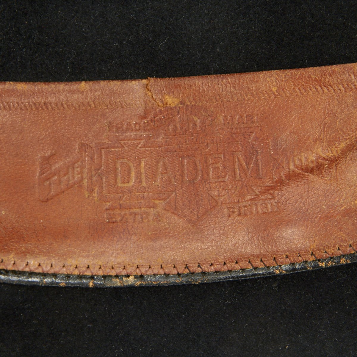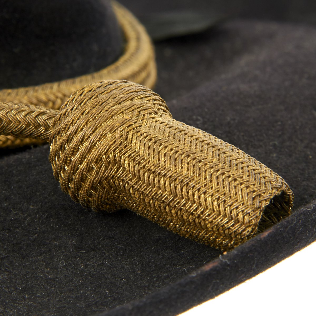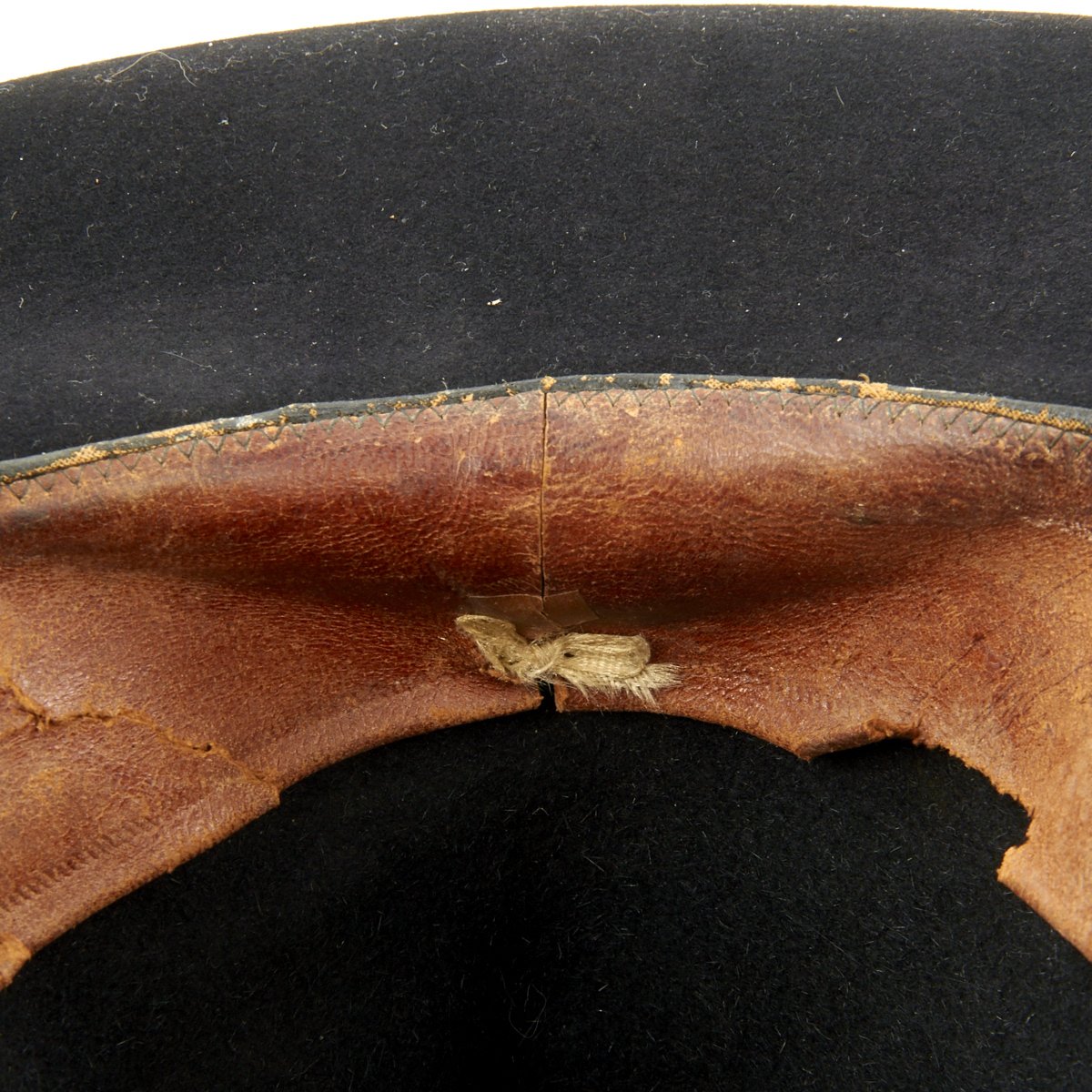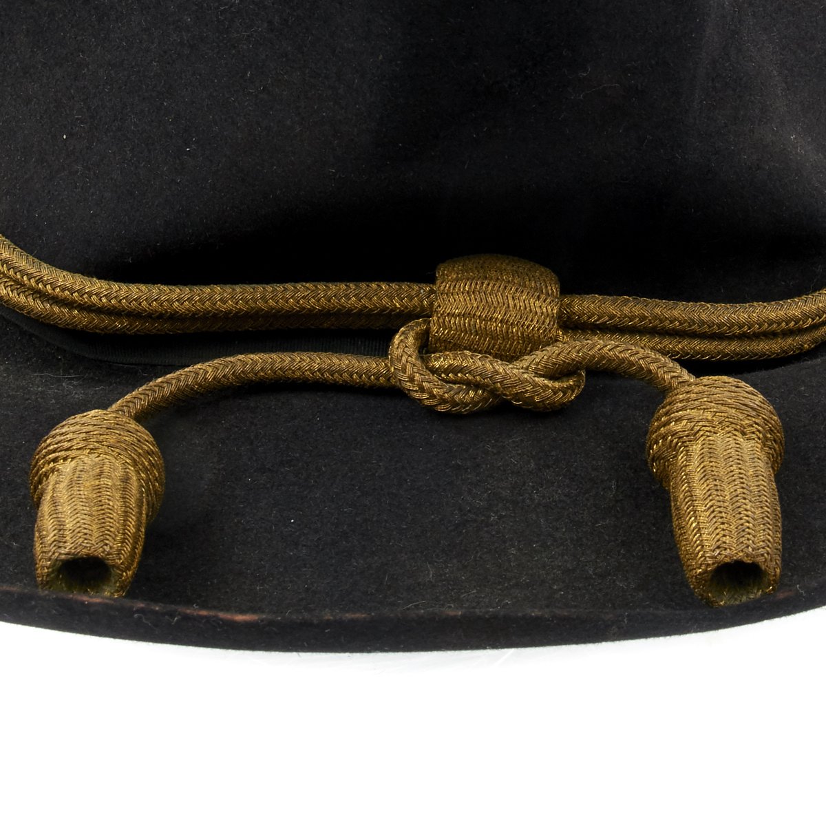 This is a post Civil War circa 1870s-1880s campaign hat. It is constructed of black fur felt with grosgrain ribbon hatband, the brim does not have stitching indicating an early specimen. This black felt hat became symbolic of the Army on the western frontier and today is one of the most highly prized pieces of military headgear. The brim measures approximately 3 inches wide. The crown measures approximately 5 inches high. This hat comes complete with an 1870s-1880s Gold Cavalry officer hat cord. Interior has a leather sweatband embossed The Diadem. The sweatband is also punched with the initial HES. Original paper size label still present under sweatband. Condition overall is very good. An incredibly rare hard to find hat from a verified Civil War veteran as used by the Army on the Western Frontier!