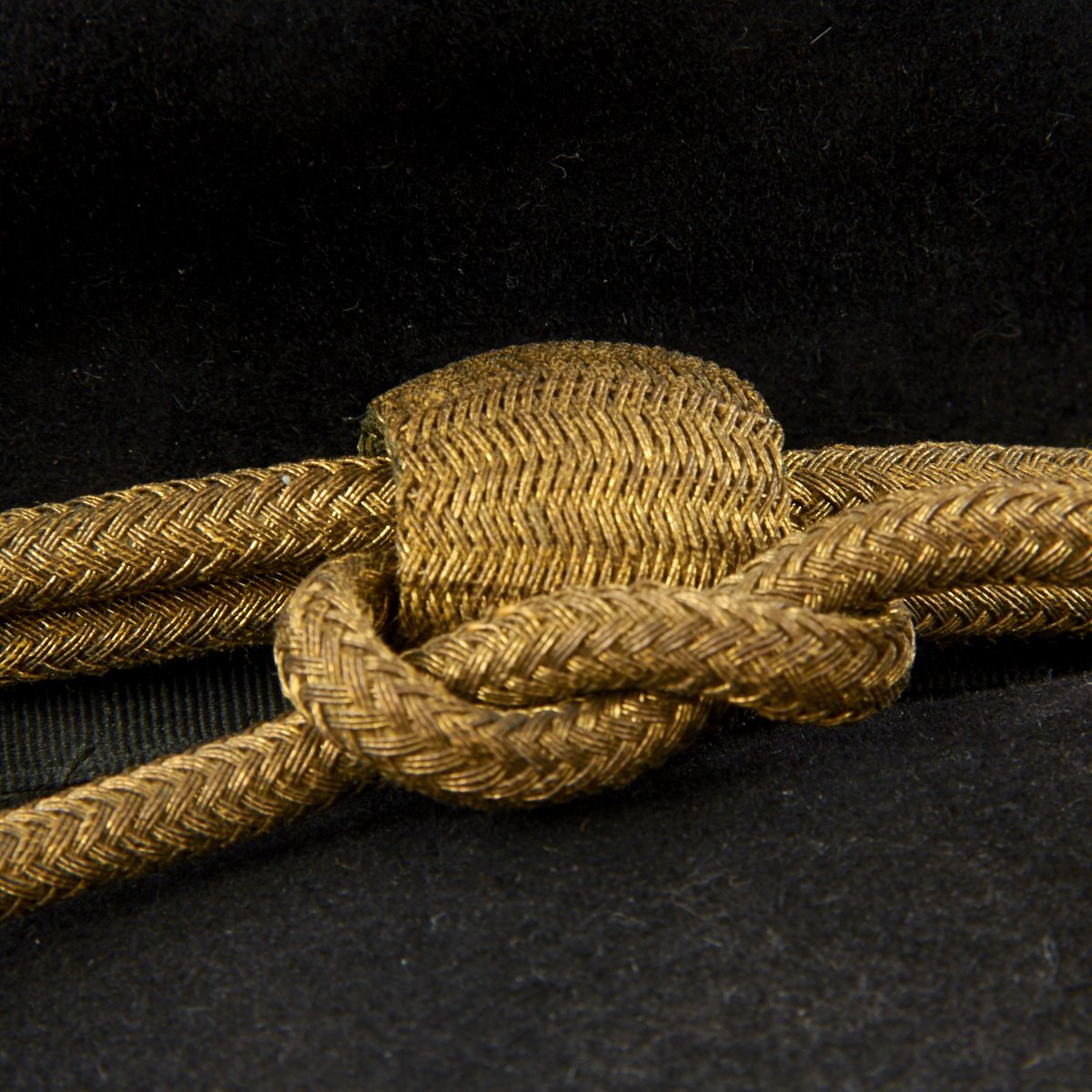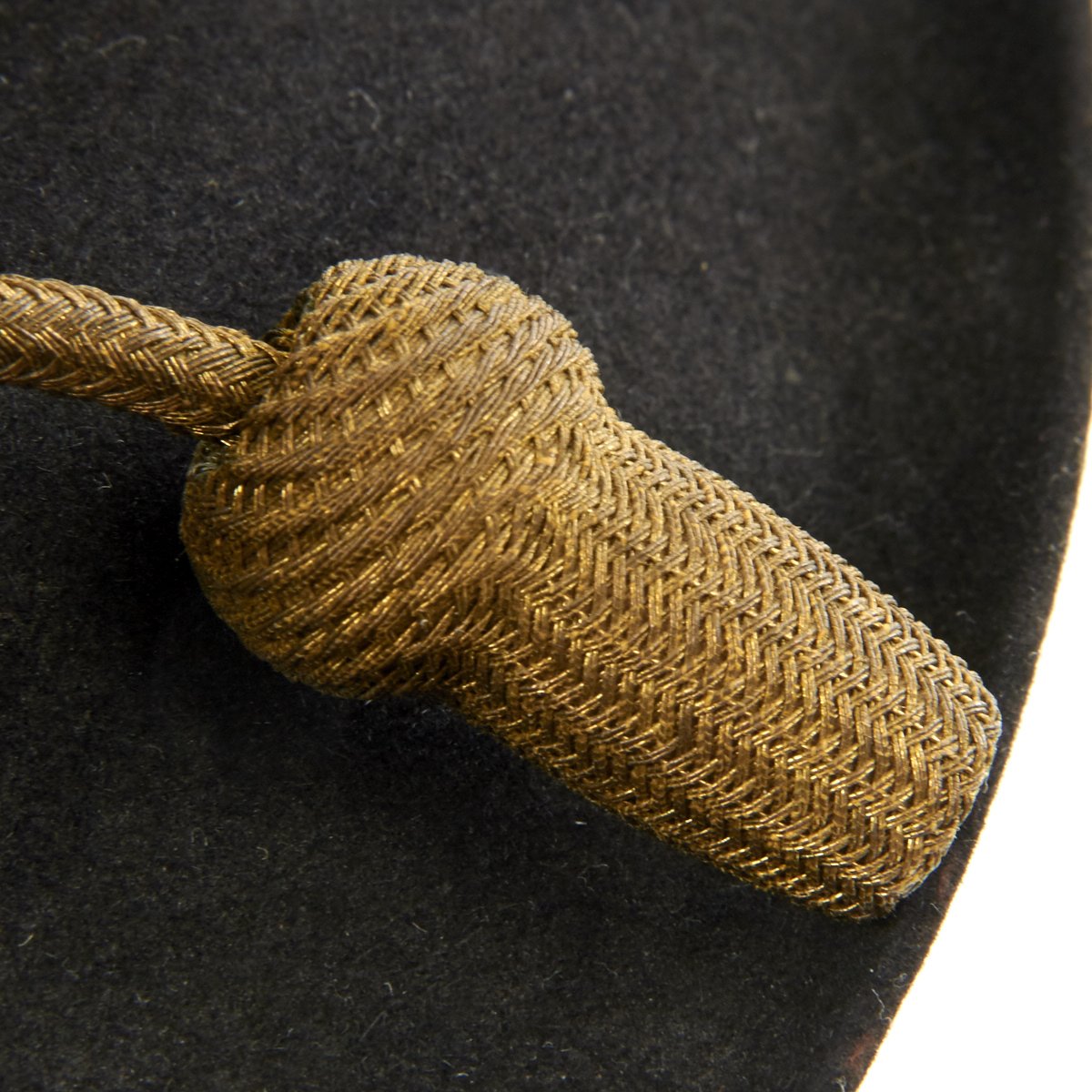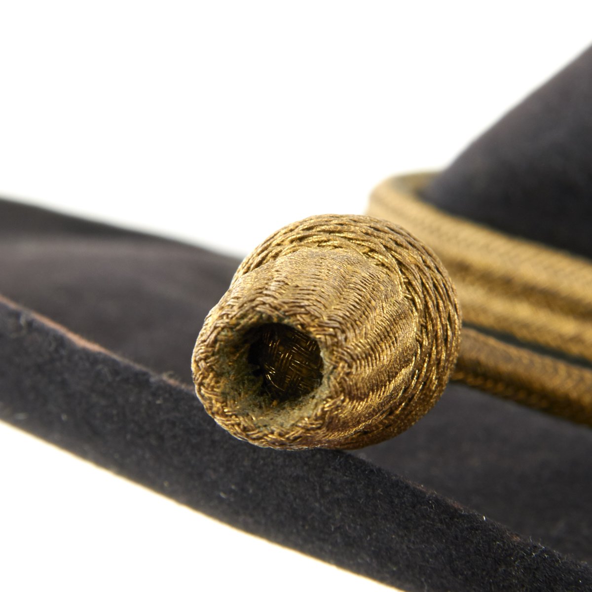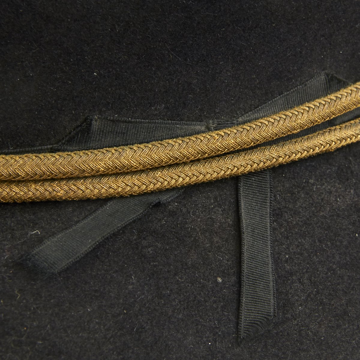 This is a post Civil War circa 1870s-1880s campaign hat. It is constructed of black fur felt with grosgrain ribbon hatband, the brim does not have stitching indicating an early specimen. This black felt hat became symbolic of the Army on the western frontier and today is one of the most highly prized pieces of military headgear. The brim measures approximately 3 inches wide. The crown measures approximately 5 inches high. This hat comes complete with an 1870s-1880s Gold Cavalry officer hat cord. Interior has a leather sweatband embossed The Diadem. The sweatband is also punched with the initial HES. Original paper size label still present under sweatband. Condition overall is very good. An incredibly rare hard to find hat from a verified Civil War veteran as used by the Army on the Western Frontier!
