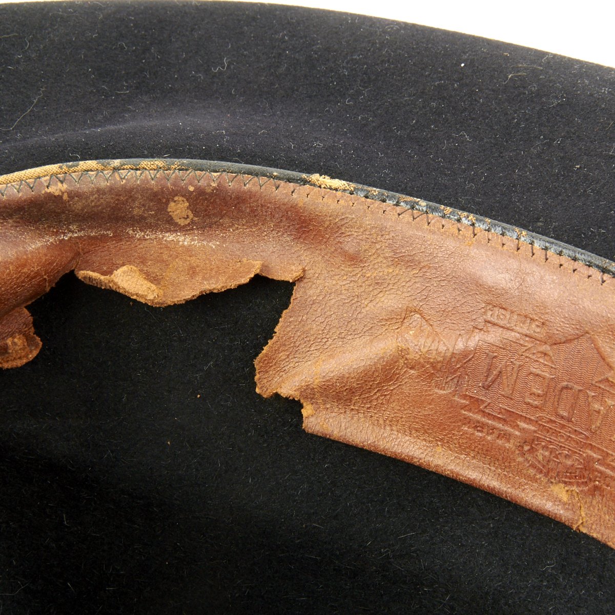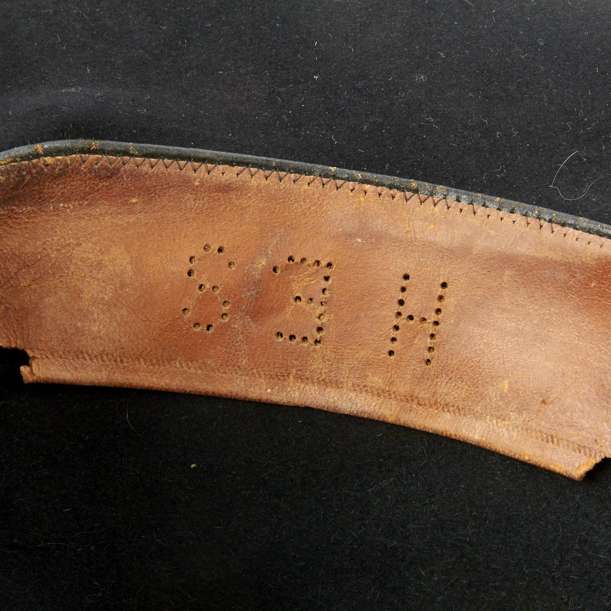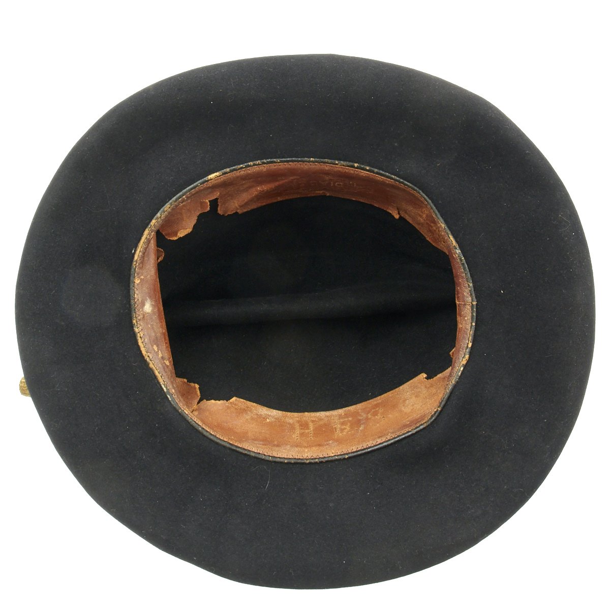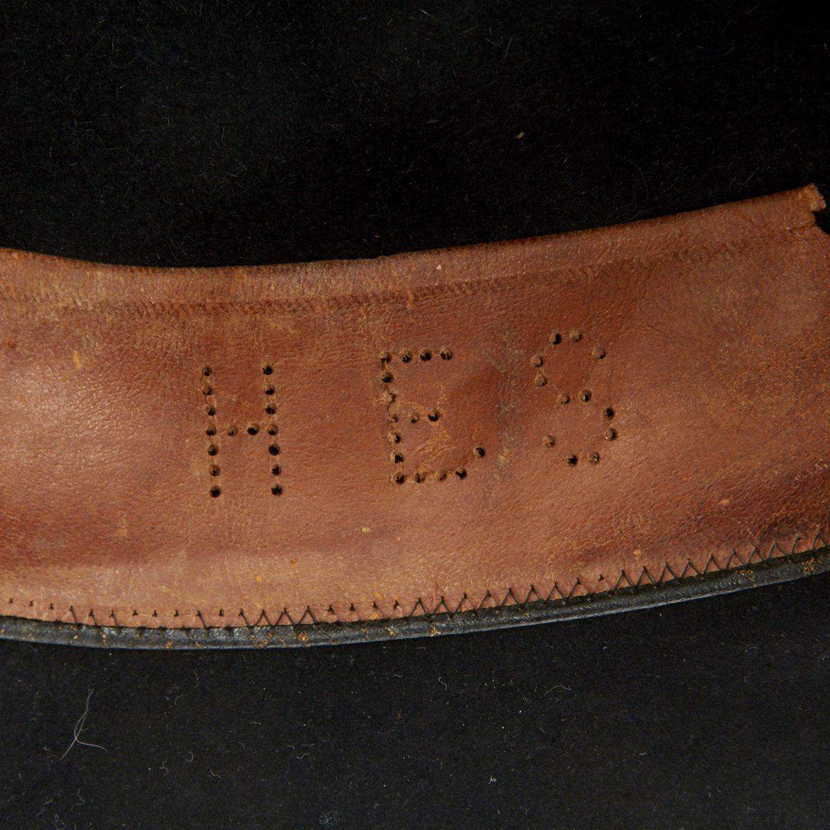 Black wool hat with a wide brim and a high crown. The inside leather band has the Initials H E S punched into it in letters about one inch high.