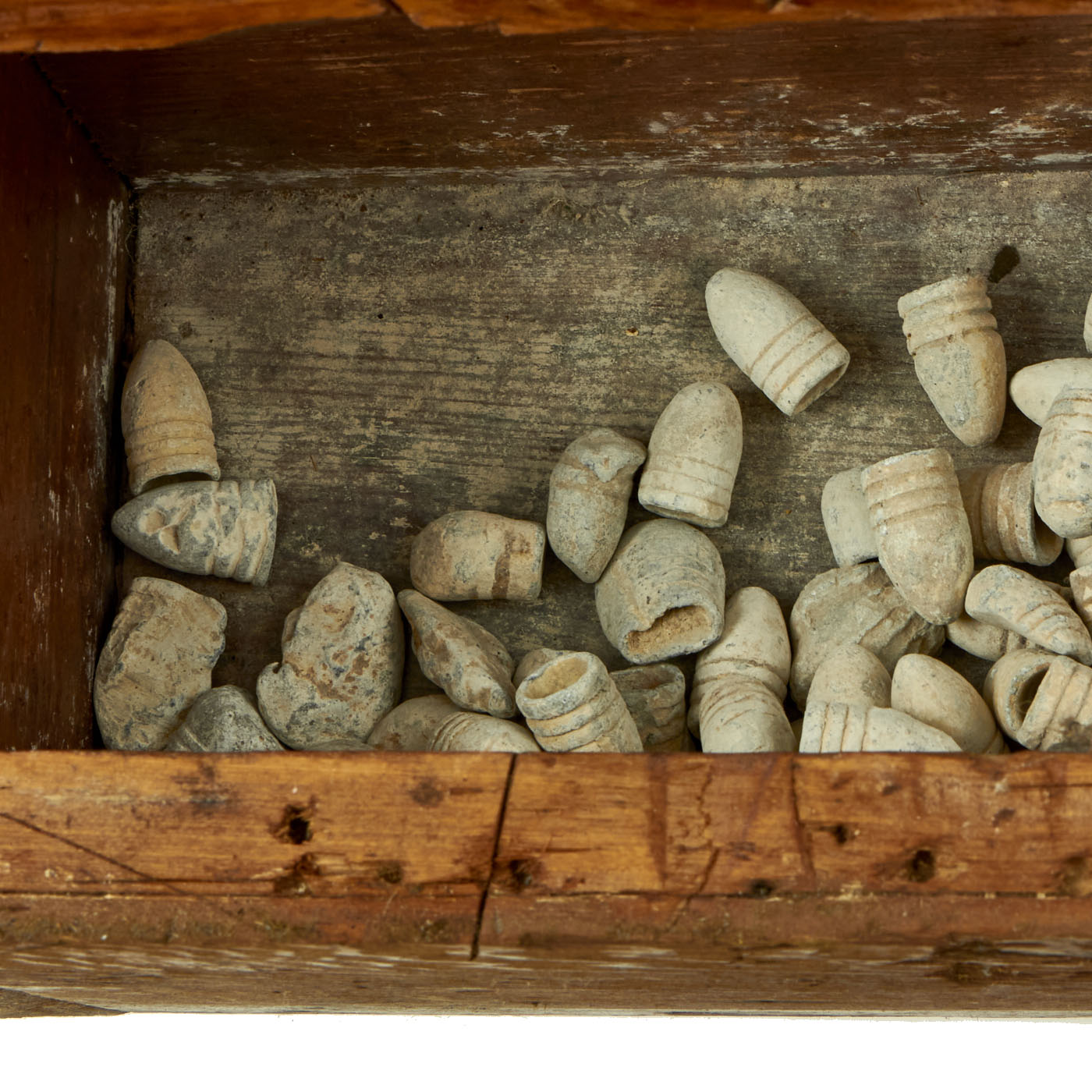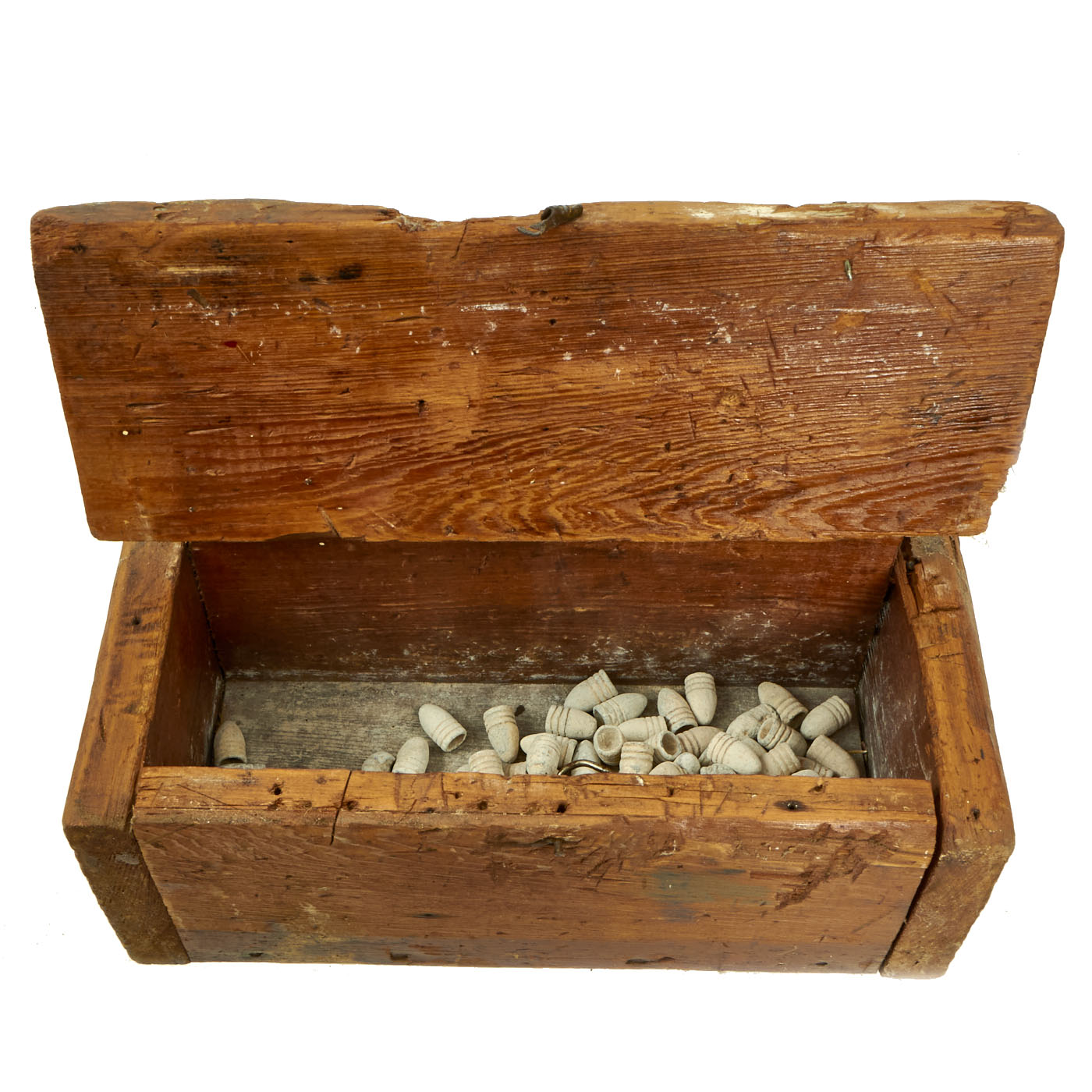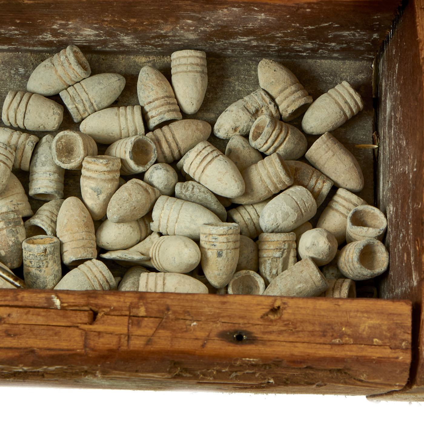 These 103 Minié ball bullets all appear to be .58 caliber and vary in condition. There are roughly 53 solid examples, while the other 50 are large fragments, flattened from impact or showing other deformities. These are ground dug examples and their condition reflects as such. All bullets are stored in what appears to be an old wooden toolbox, which has a lot of nicks, cracks and chips present. The box is not from the Civil War era and appears to just have been what was available to store these findings in. The box measures approximately 14 ½” x 6 ½” x 6 ½”.