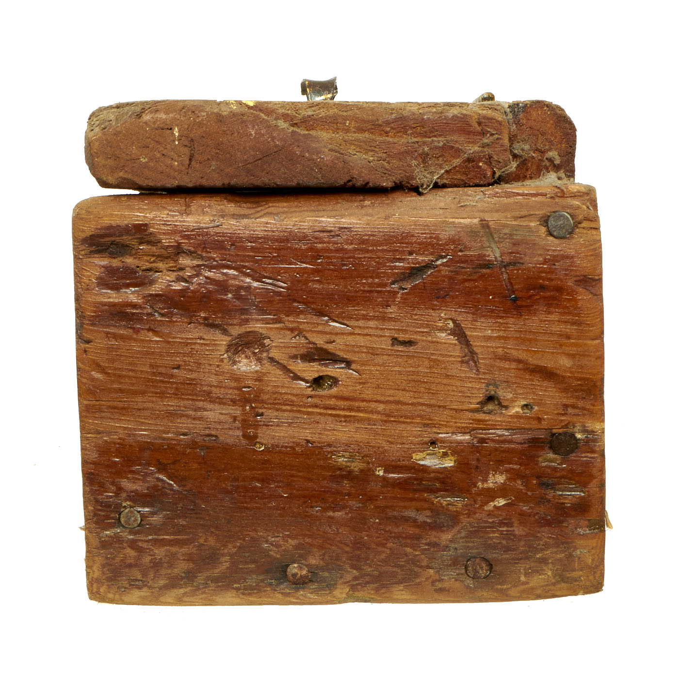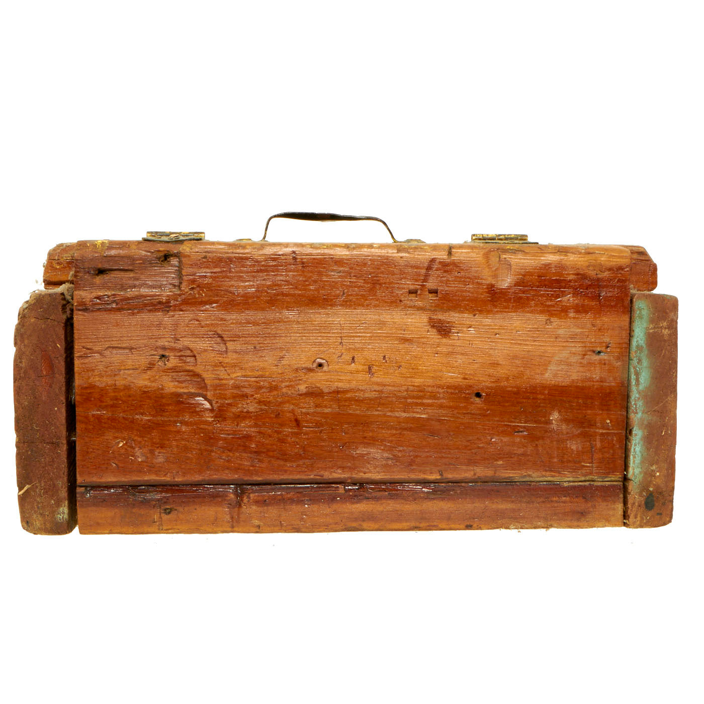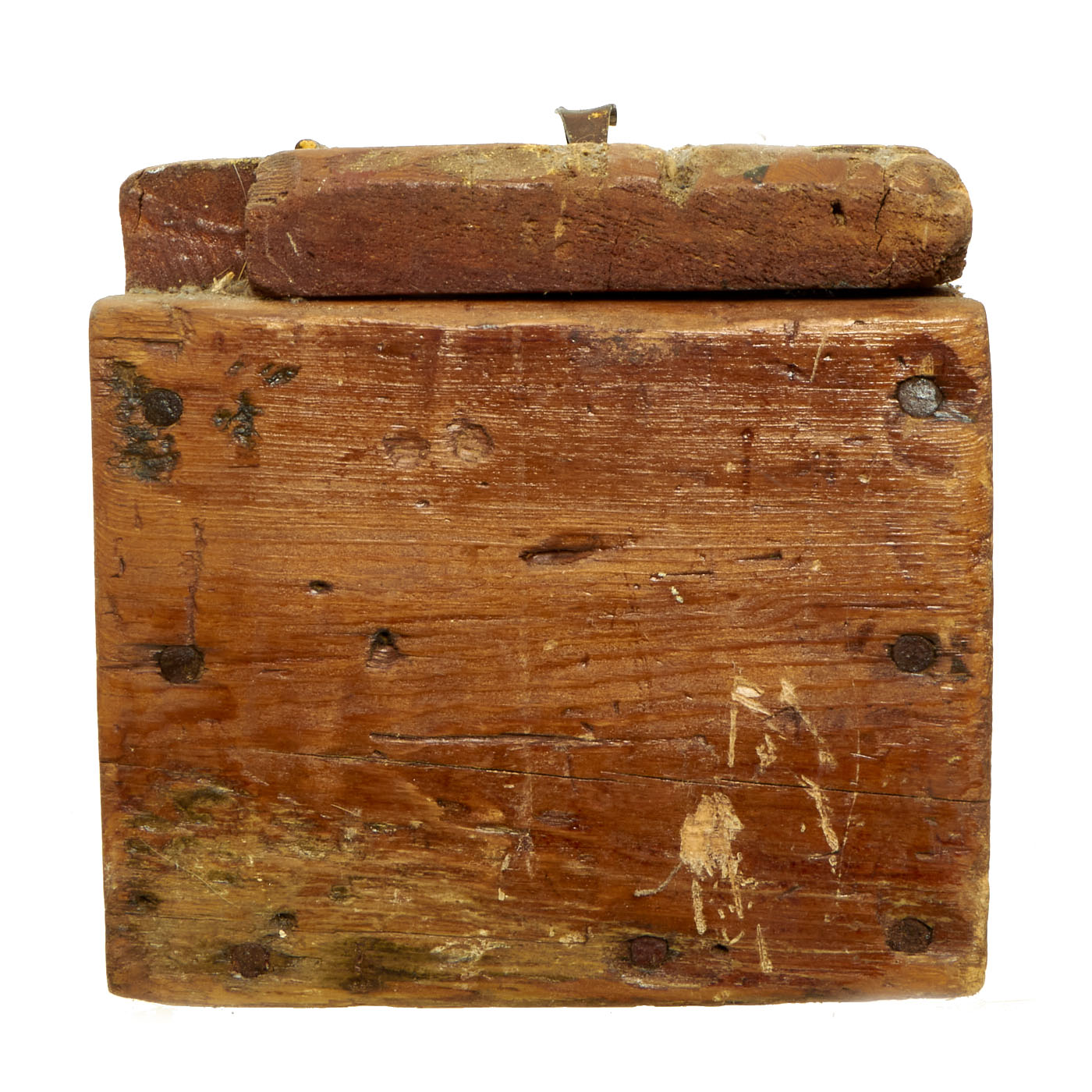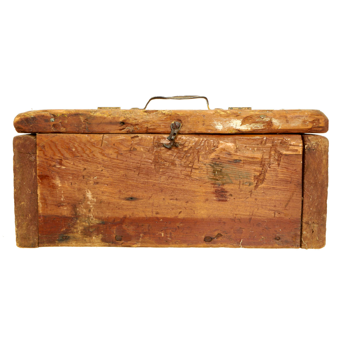 These 103 Minié ball bullets all appear to be .58 caliber and vary in condition. There are roughly 53 solid examples, while the other 50 are large fragments, flattened from impact or showing other deformities. These are ground dug examples and their condition reflects as such. All bullets are stored in what appears to be an old wooden toolbox, which has a lot of nicks, cracks and chips present. The box is not from the Civil War era and appears to just have been what was available to store these findings in. The box measures approximately 14 ½” x 6 ½” x 6 ½”.