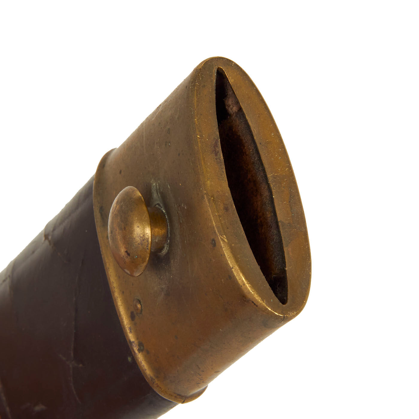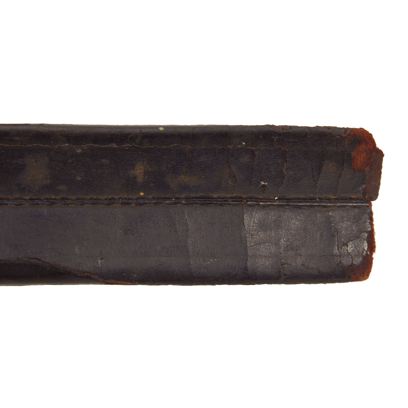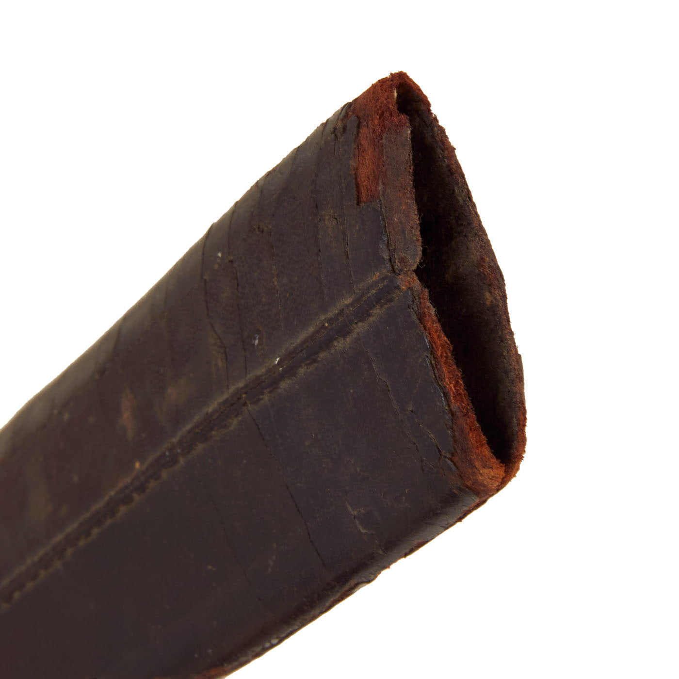 The black leather scabbard is in good condition, but the lower half with the drag is completely missing. There is minor wear to it and the black leather finish does have some minor crazing present. This was a sword that saw service but was cared for.