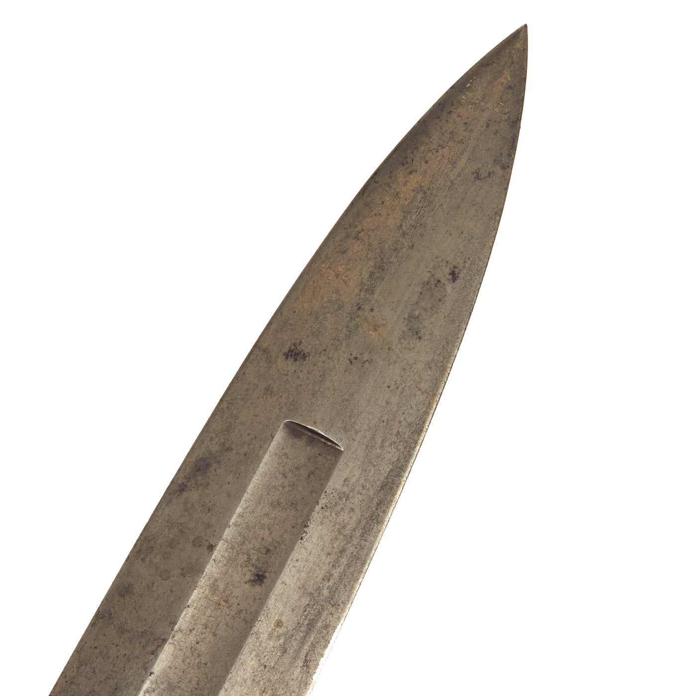 The blade on this example is one of the best we have ever seen. It does have some staining, but a lot of the original factory machining marks can still be seen. It also does appear to have been sharpened at some point. There is a little bit of rust peppering in places, but nothing major.