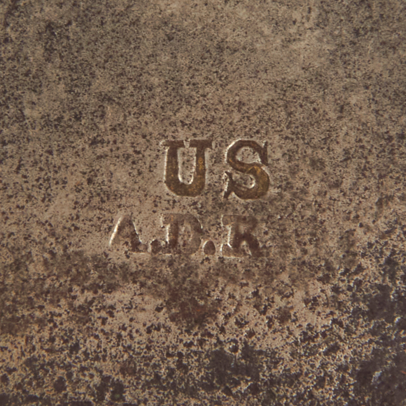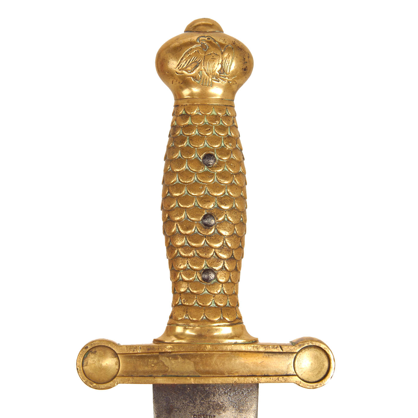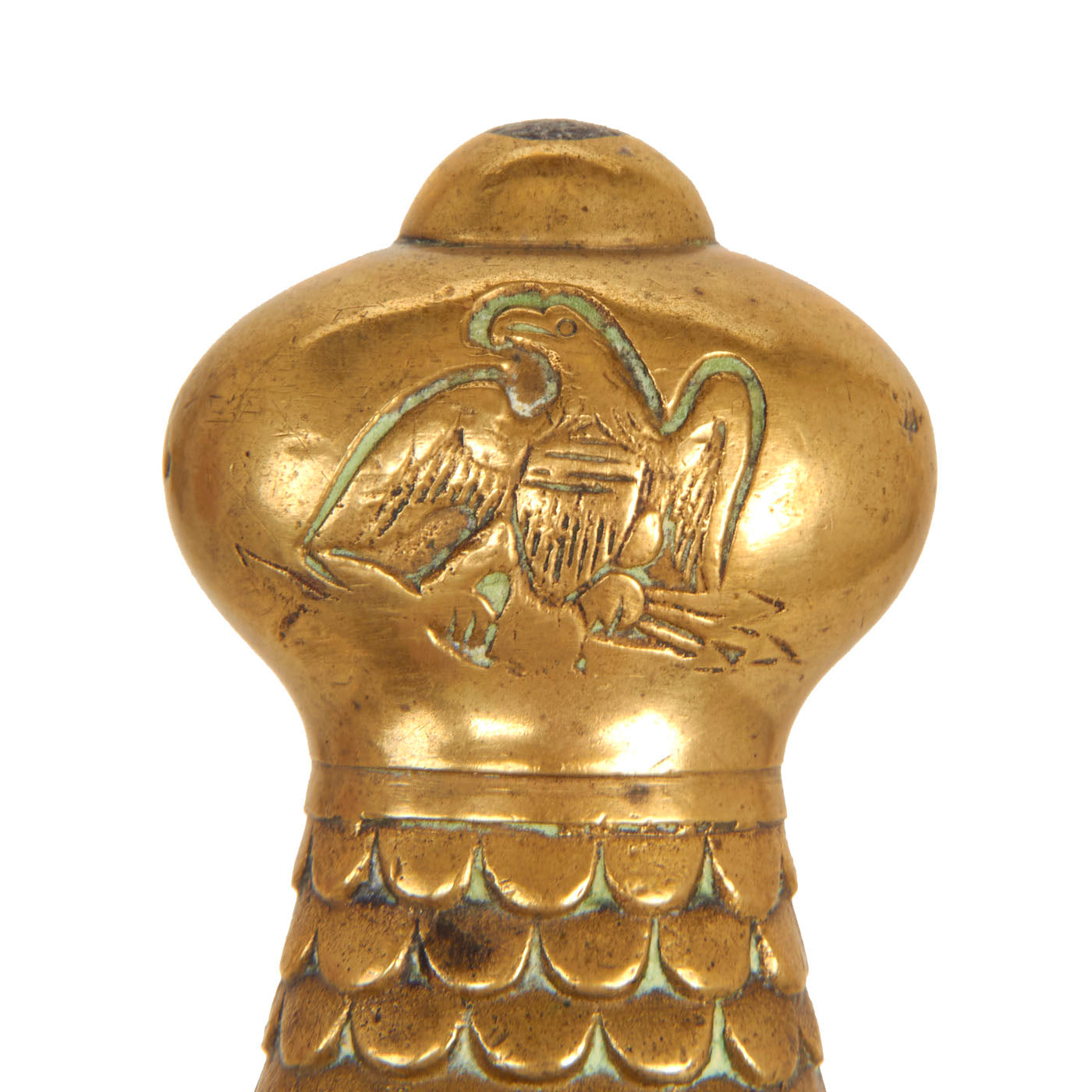 The hilt and cross guard are cast and partly machined brass, inspector marked on the crossguard: A.D.K / J.W.R. The grips have been molded in a scalloped eagle feather design. Three transverse iron rivets secure it to the tang of the blade. The pommel is decorated on each side with a heavily incised American eagle, with shield, holding arrows in his left talon and an olive branch in his right talon. The eagle's head faces towards its right. The straight cross quillons terminate in disk shaped finials.