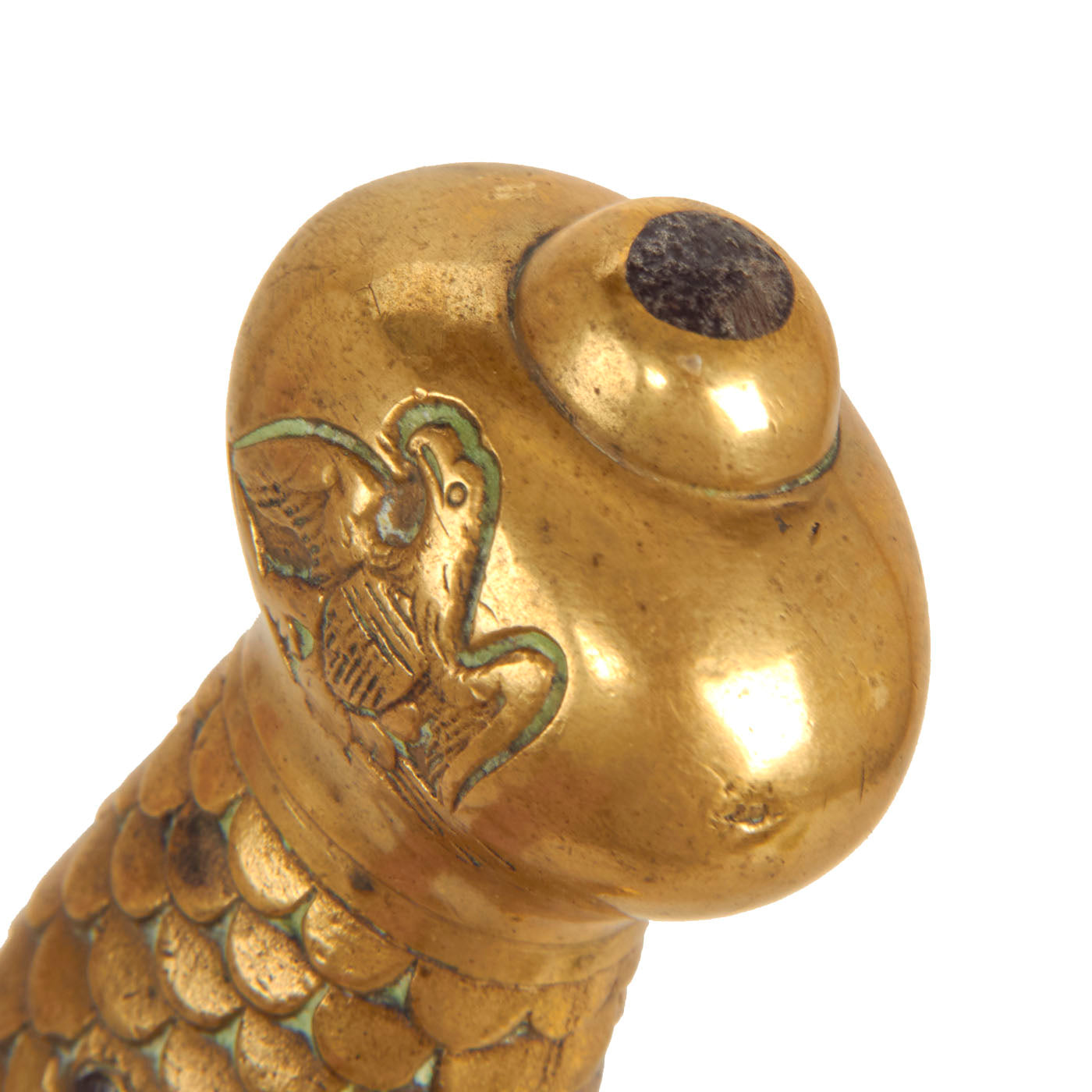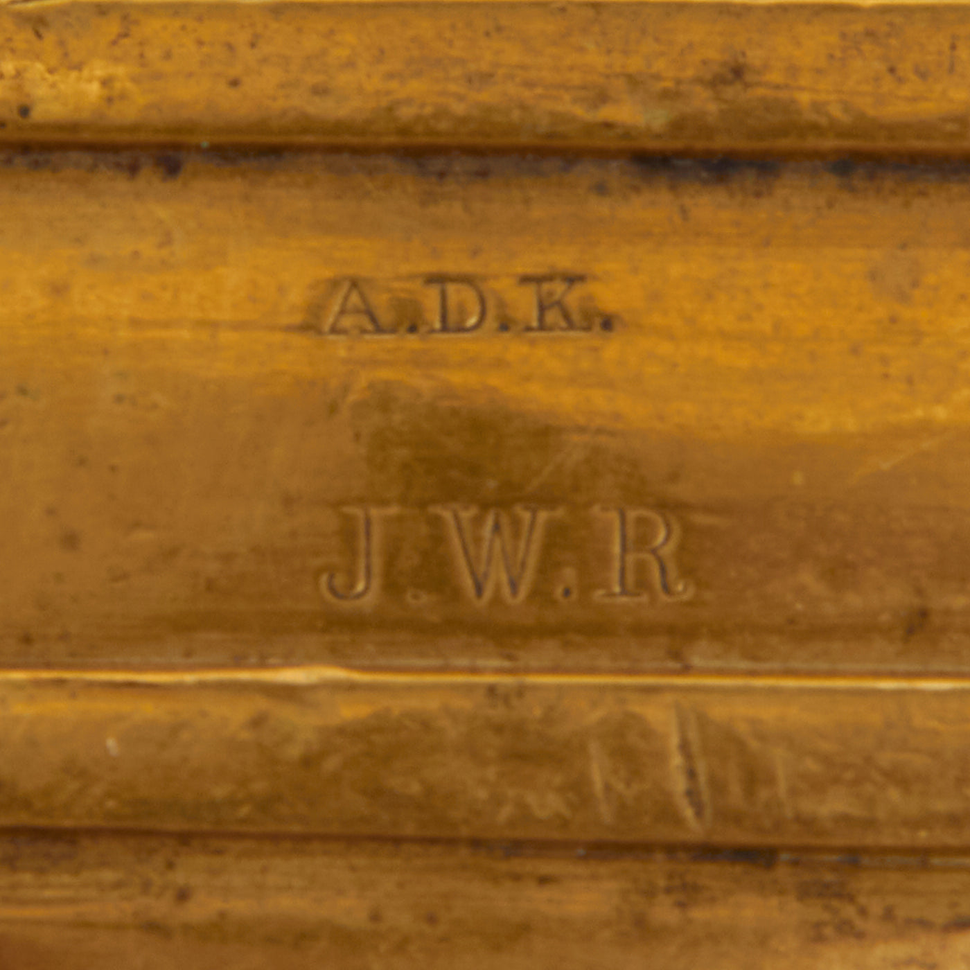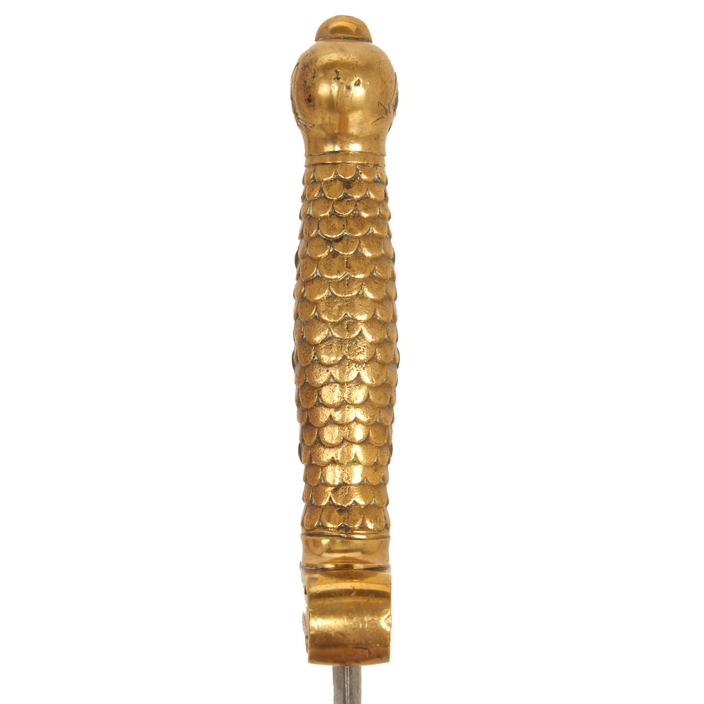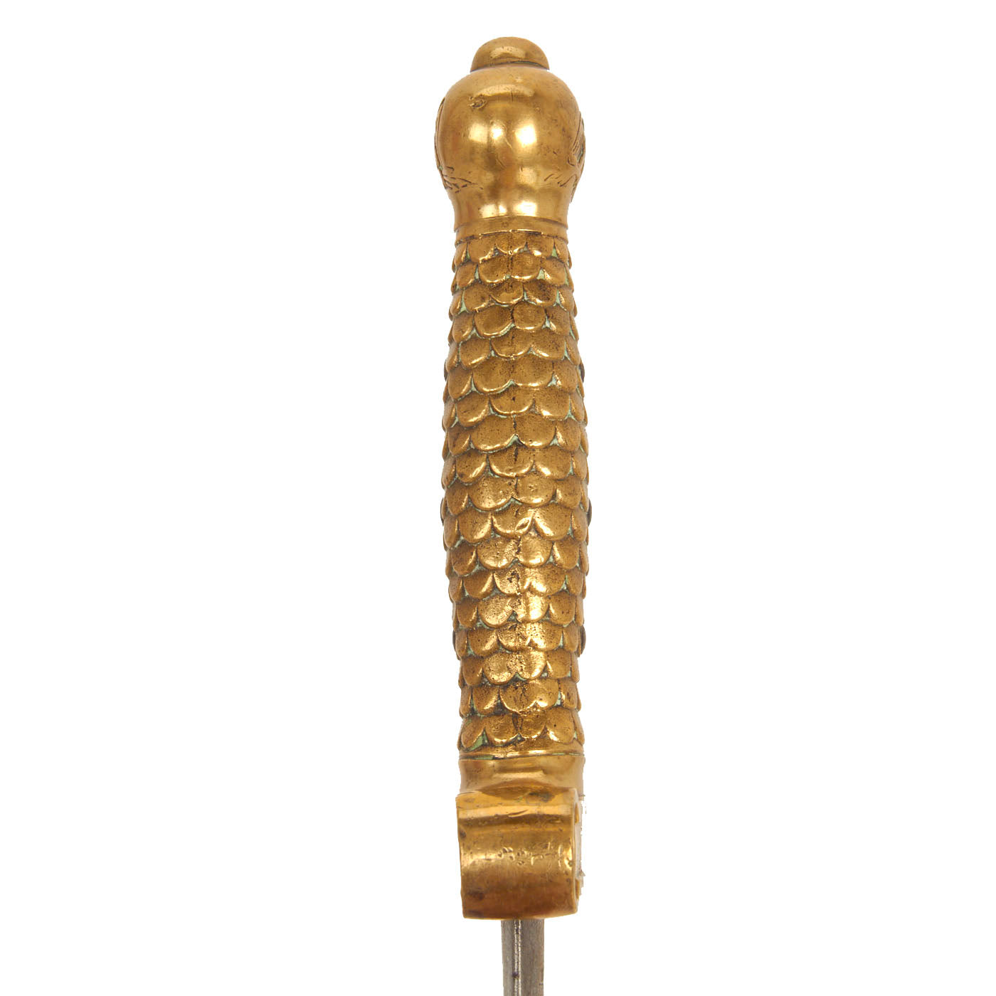 The hilt and cross guard are cast and partly machined brass, inspector marked on the crossguard: A.D.K / J.W.R. The grips have been molded in a scalloped eagle feather design. Three transverse iron rivets secure it to the tang of the blade. The pommel is decorated on each side with a heavily incised American eagle, with shield, holding arrows in his left talon and an olive branch in his right talon. The eagle's head faces towards its right. The straight cross quillons terminate in disk shaped finials.