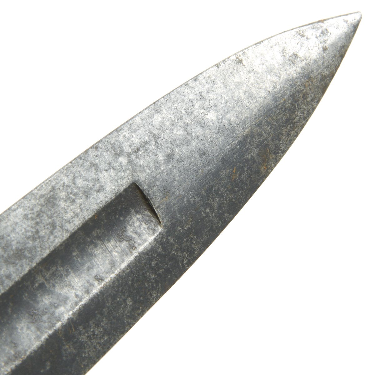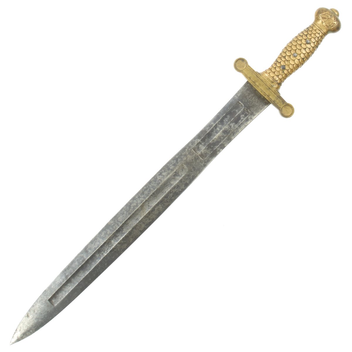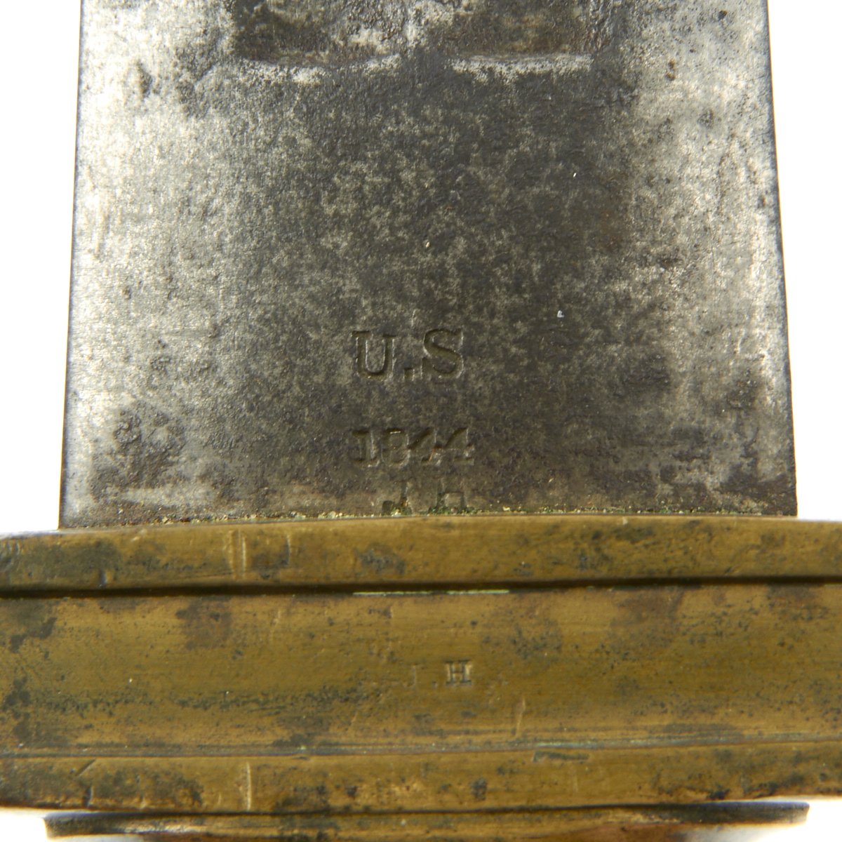 Original Item: Only One Available. This 1844 dated Ames Foot Artillery sword has a straight, heavy iron blade. It is double edged and the blade is very clean. There are two side-by-side fullers, starting just below the hilt. Then, after a space of 11/16", there is a single broad center fuller that extends toward the blade's spear shaped point. The overall blade length is approximately 19''.
