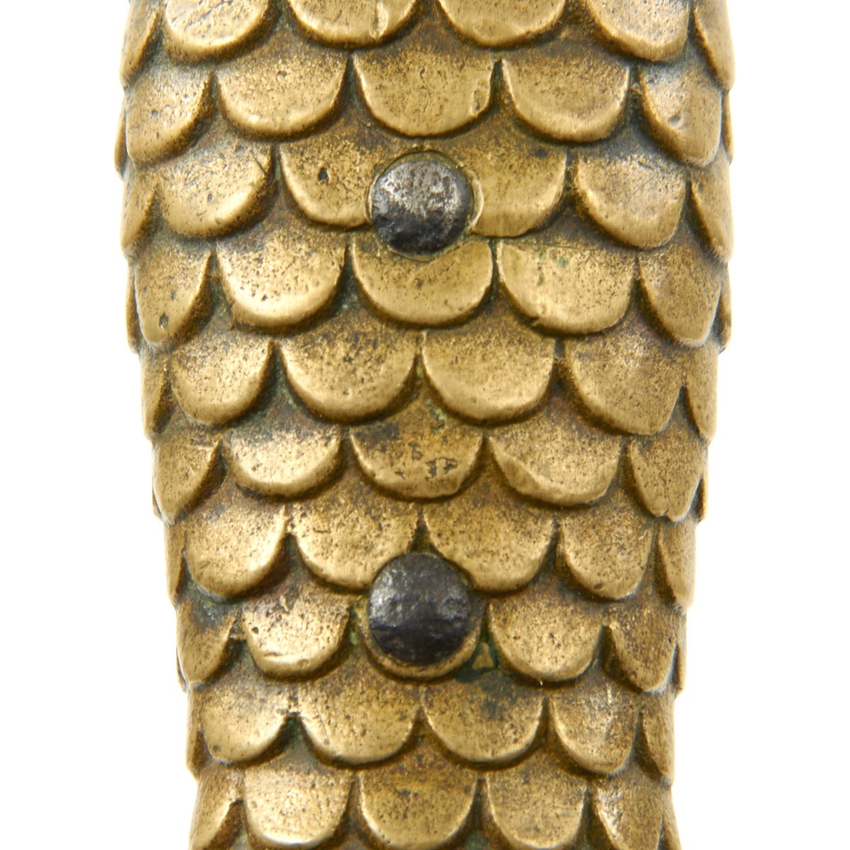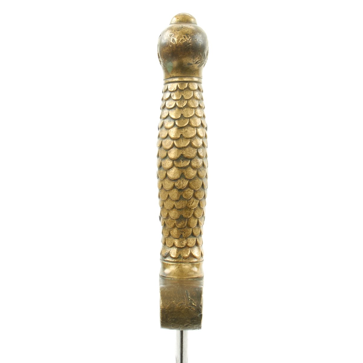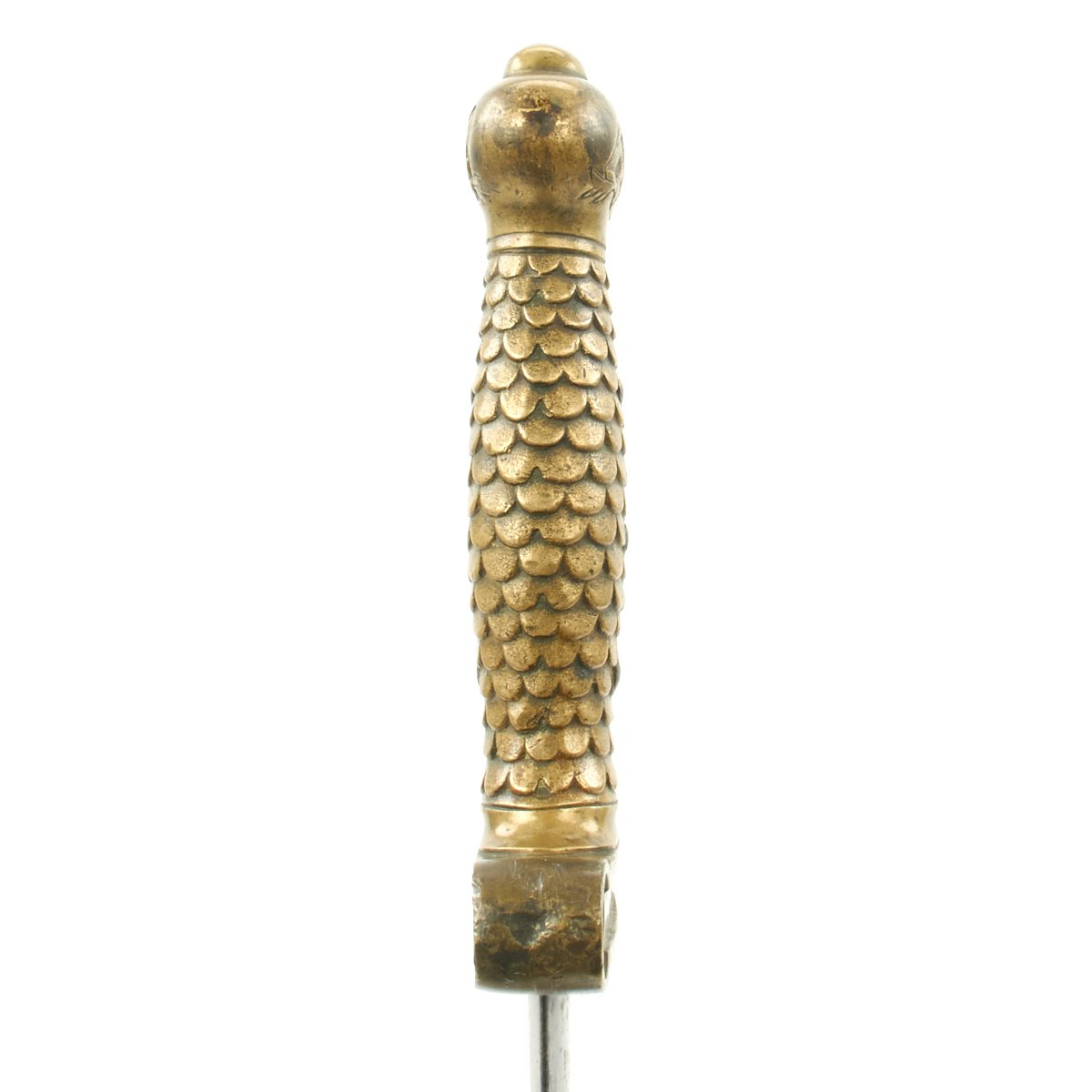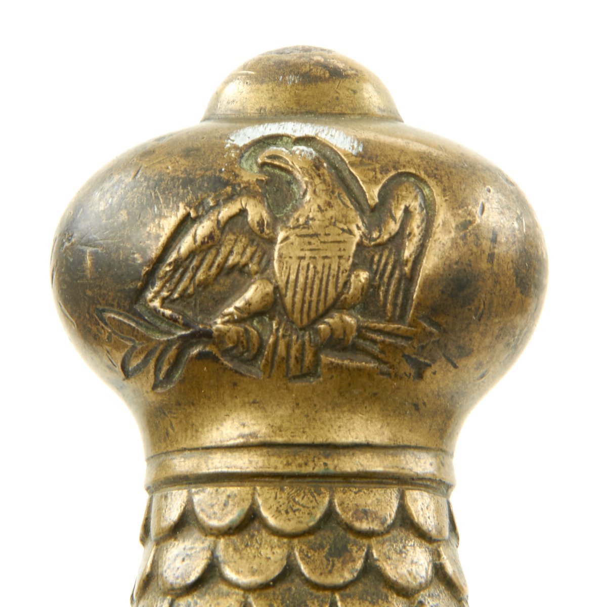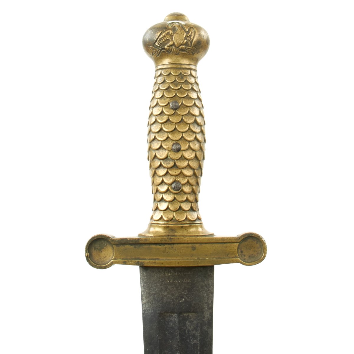 The hilt and cross guard are stamped brass. The grips have been molded in a scalloped eagle feather design. Three transverse iron rivets secure it to the tang of the blade. The pommel is decorated on each side with a heavily incised American eagle, with shield, holding arrows in his left talon and an olive branch in his right talon. The eagle's head faces towards its right. The straight cross quillons terminate in disk shaped finials.