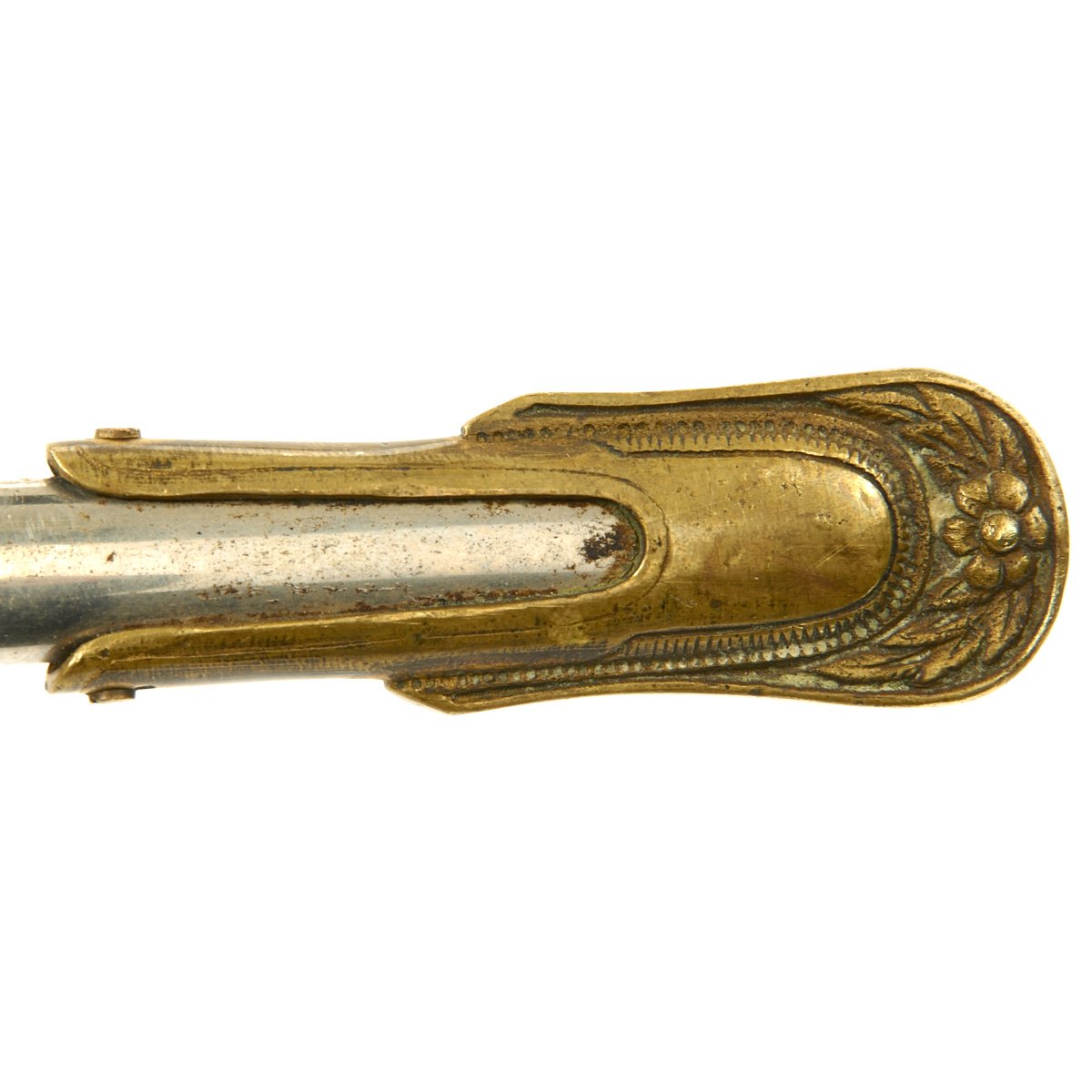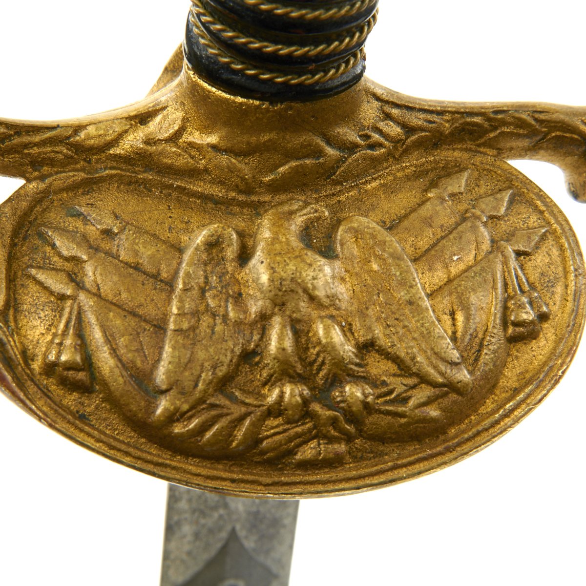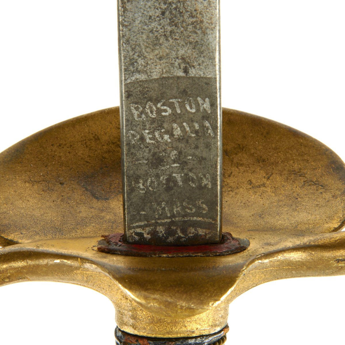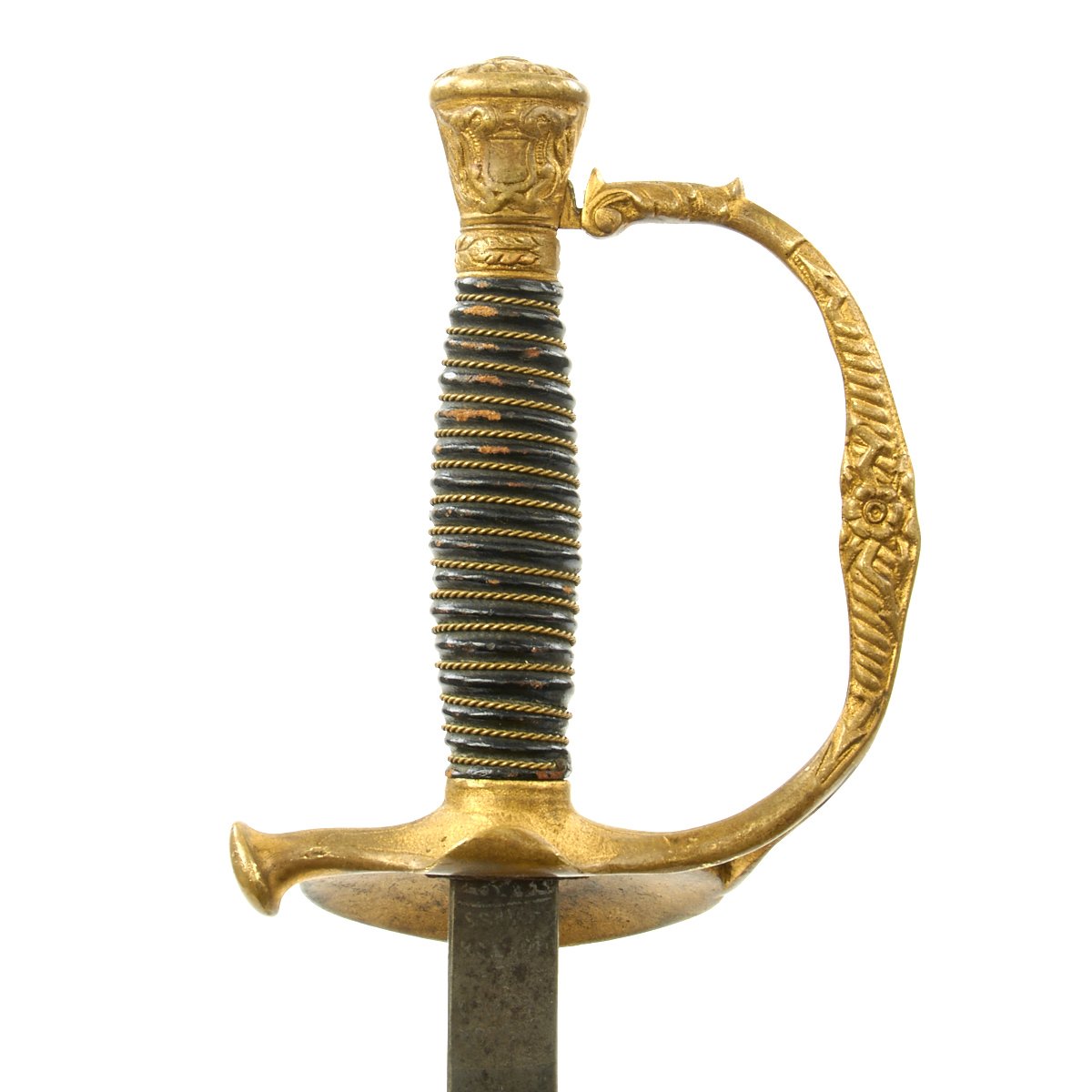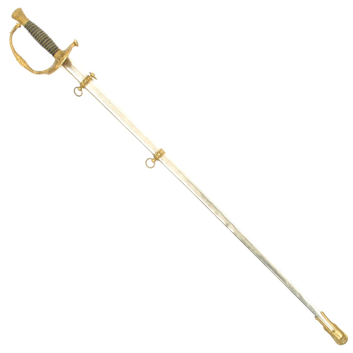 It has a partially etched 30" blade with foliage and crossed swords etc, including a Spread Eagle in the center of which is a small box engraved with the name TOTE. The sword measures 35" overall, and the hilt and "shell" Guard are of gilded bronze/brass and the grip is wire bound leather. A good amount of the original gilding is present, though the leather grip is worn. It comes in its original decorated brass mounted nickel-plated scabbard. Scabbard is straight, and the plating is in good shape, though there are numerous dents on both sides of the scabbard.