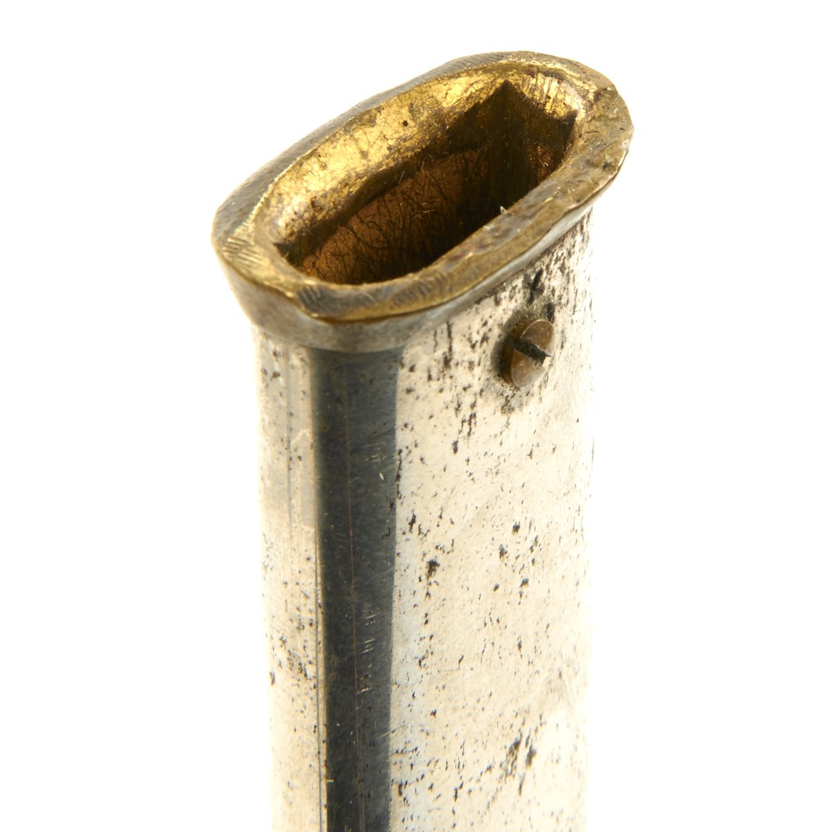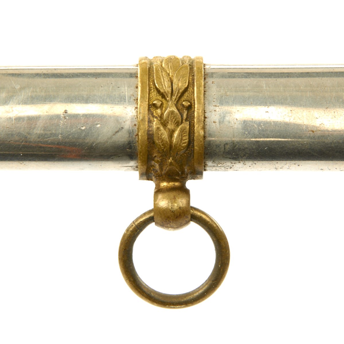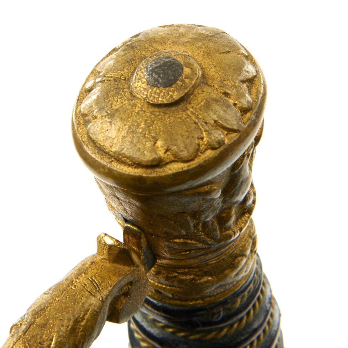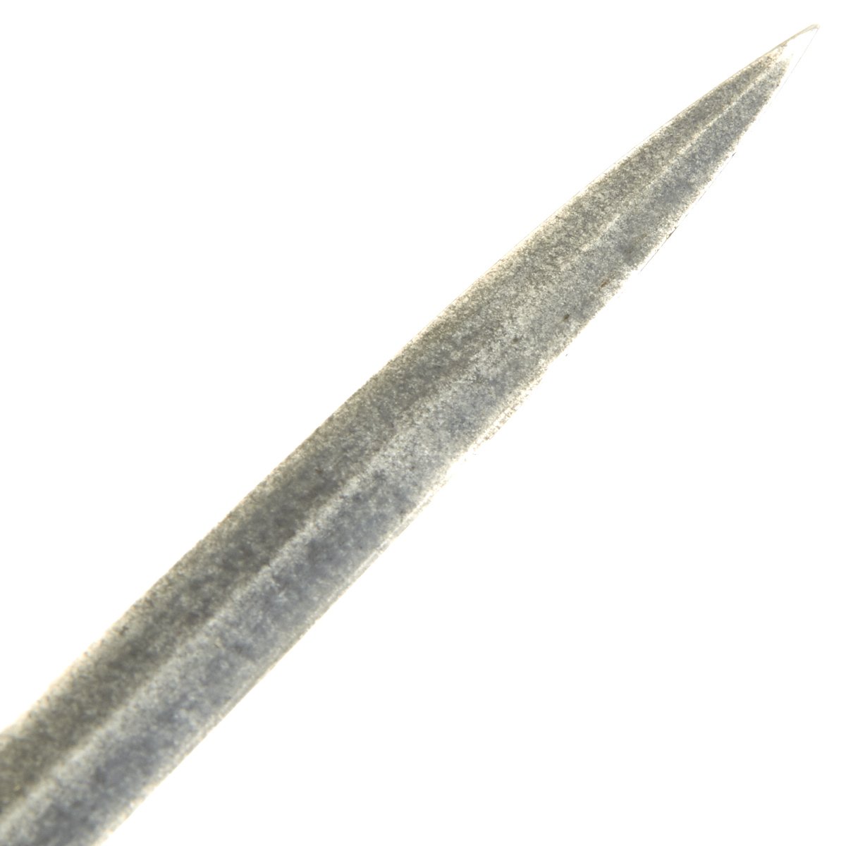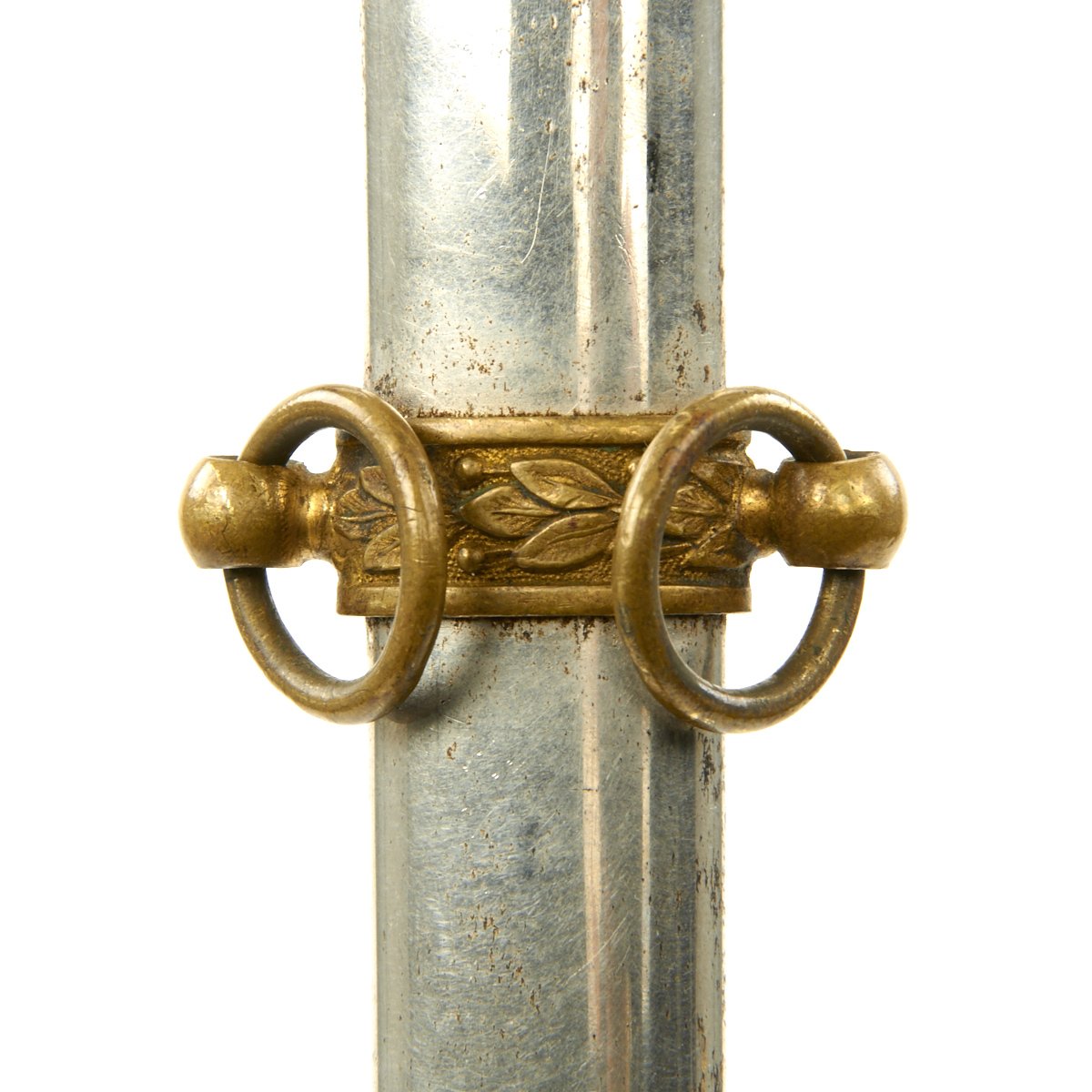 It has a partially etched 30" blade with foliage and crossed swords etc, including a Spread Eagle in the center of which is a small box engraved with the name TOTE. The sword measures 35" overall, and the hilt and "shell" Guard are of gilded bronze/brass and the grip is wire bound leather. A good amount of the original gilding is present, though the leather grip is worn. It comes in its original decorated brass mounted nickel-plated scabbard. Scabbard is straight, and the plating is in good shape, though there are numerous dents on both sides of the scabbard.