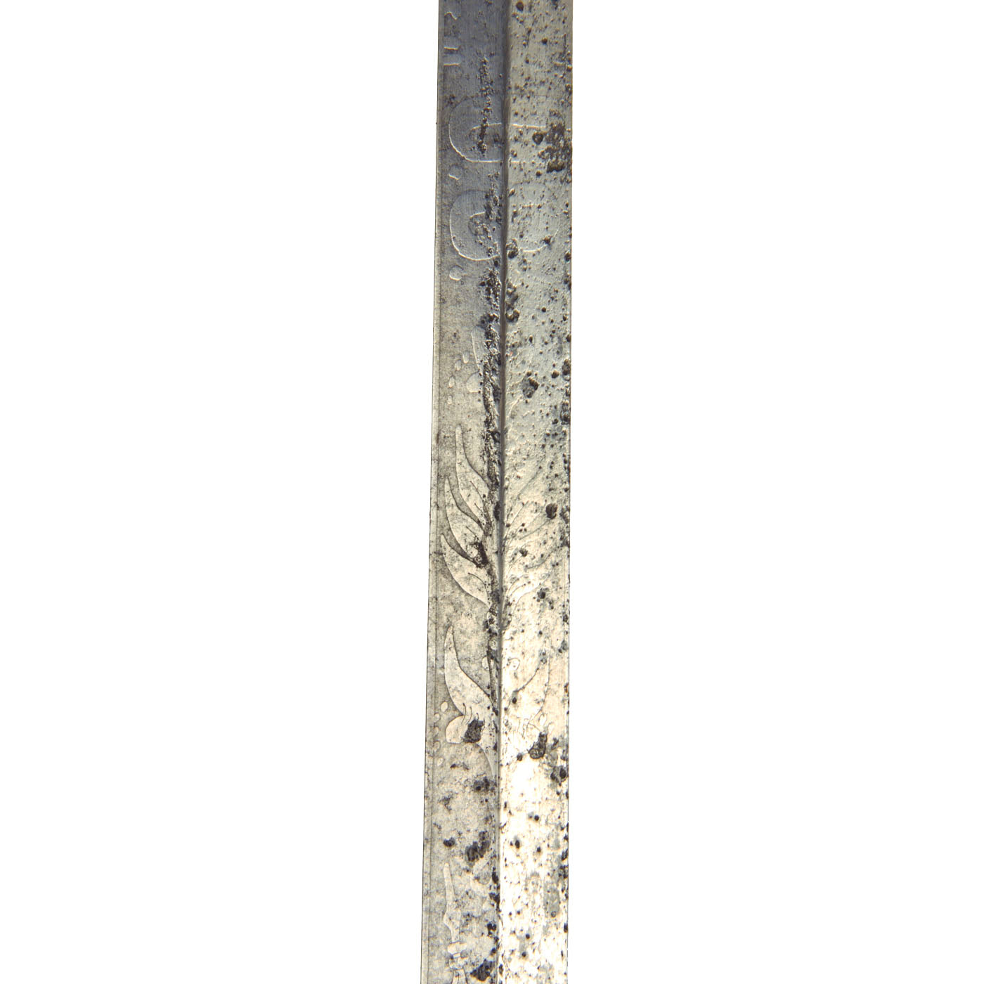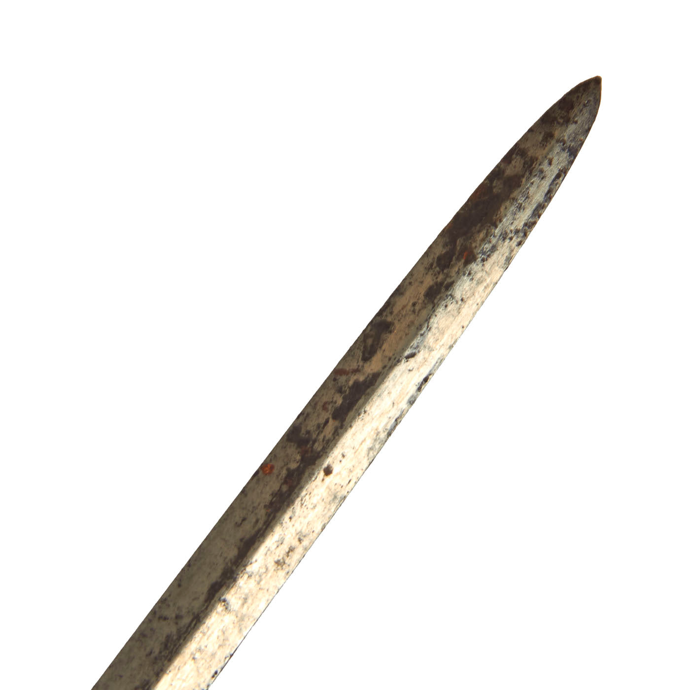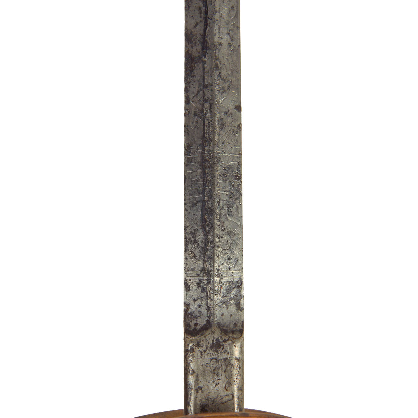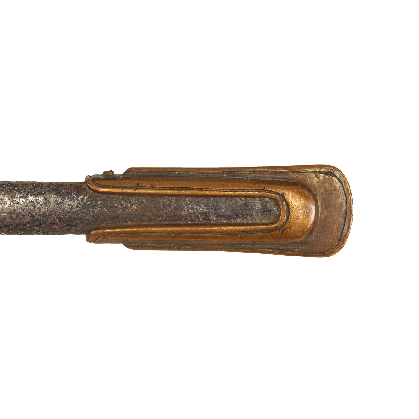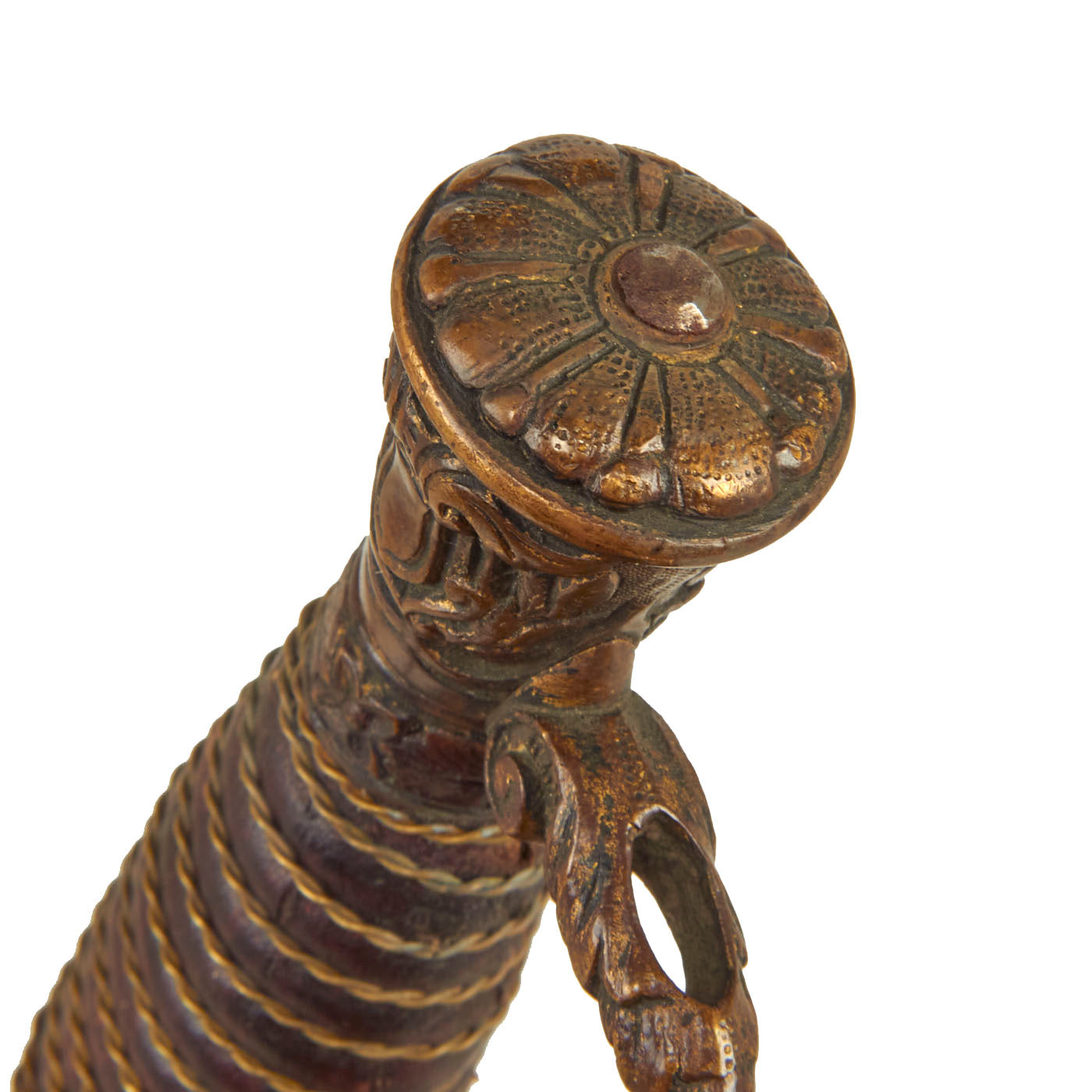It comes in its original decorated brass mounted steel scabbard, which has lost its original blued finish. Scabbard is mostly straight, with one small bend that we can see.