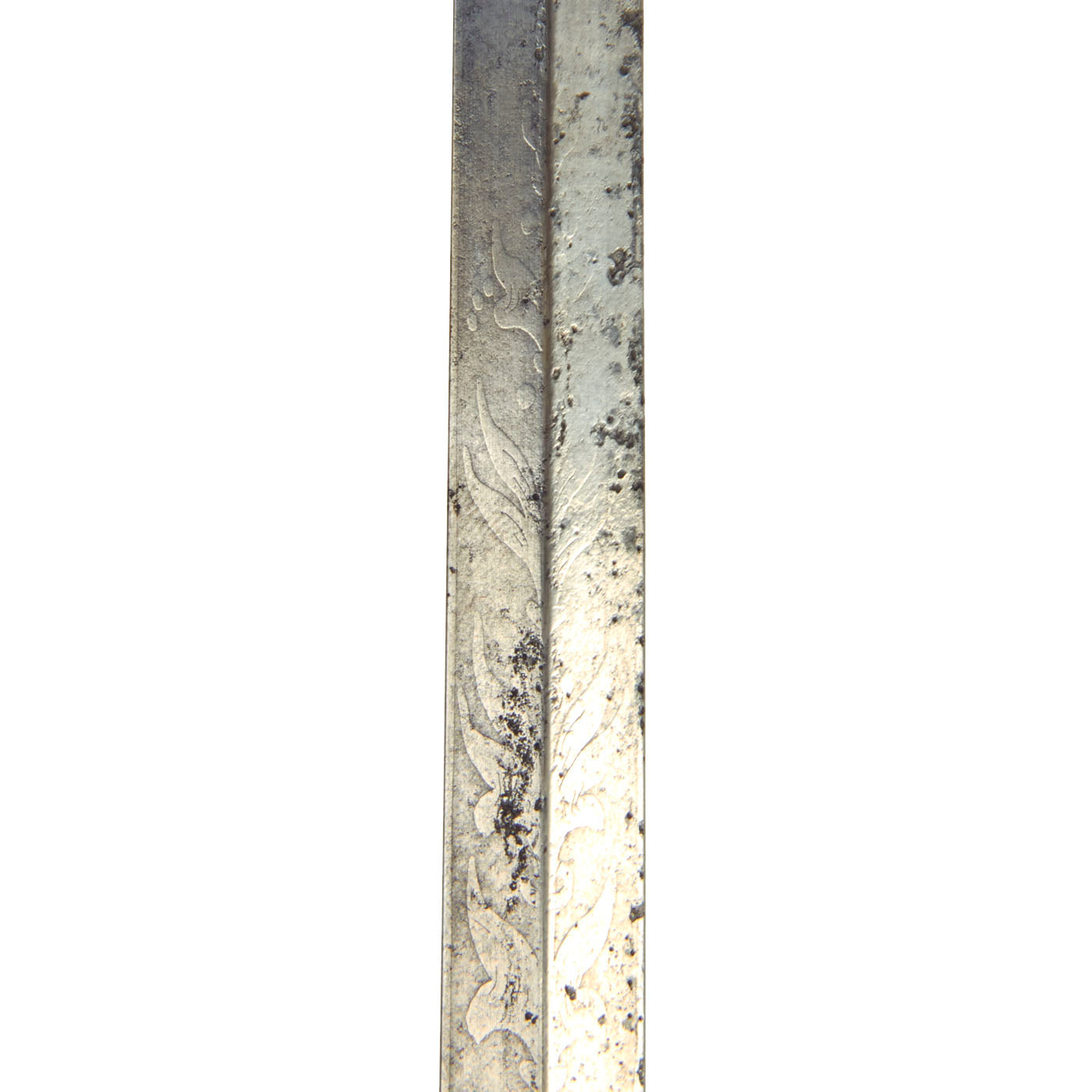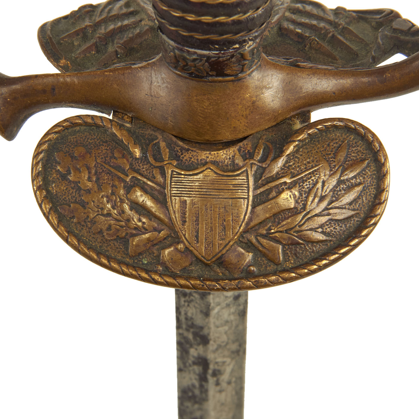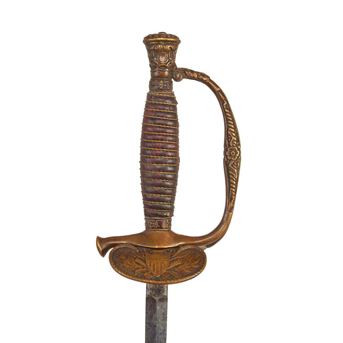 It has a partially etched 30" blade with foliage designs, and has a Spread Eagle in the center of one side and U.S. on the other side. The sword measures 37" overall, and the hilt and "shell" Guard are of gilded bronze/brass and the grip is wire bound sharkskin. It also features a partial "fold-away" guard on one side, which would allow it to rest more comfortably on the left hip. A good amount of the original gilding is present, though the skin of the grip is worn.