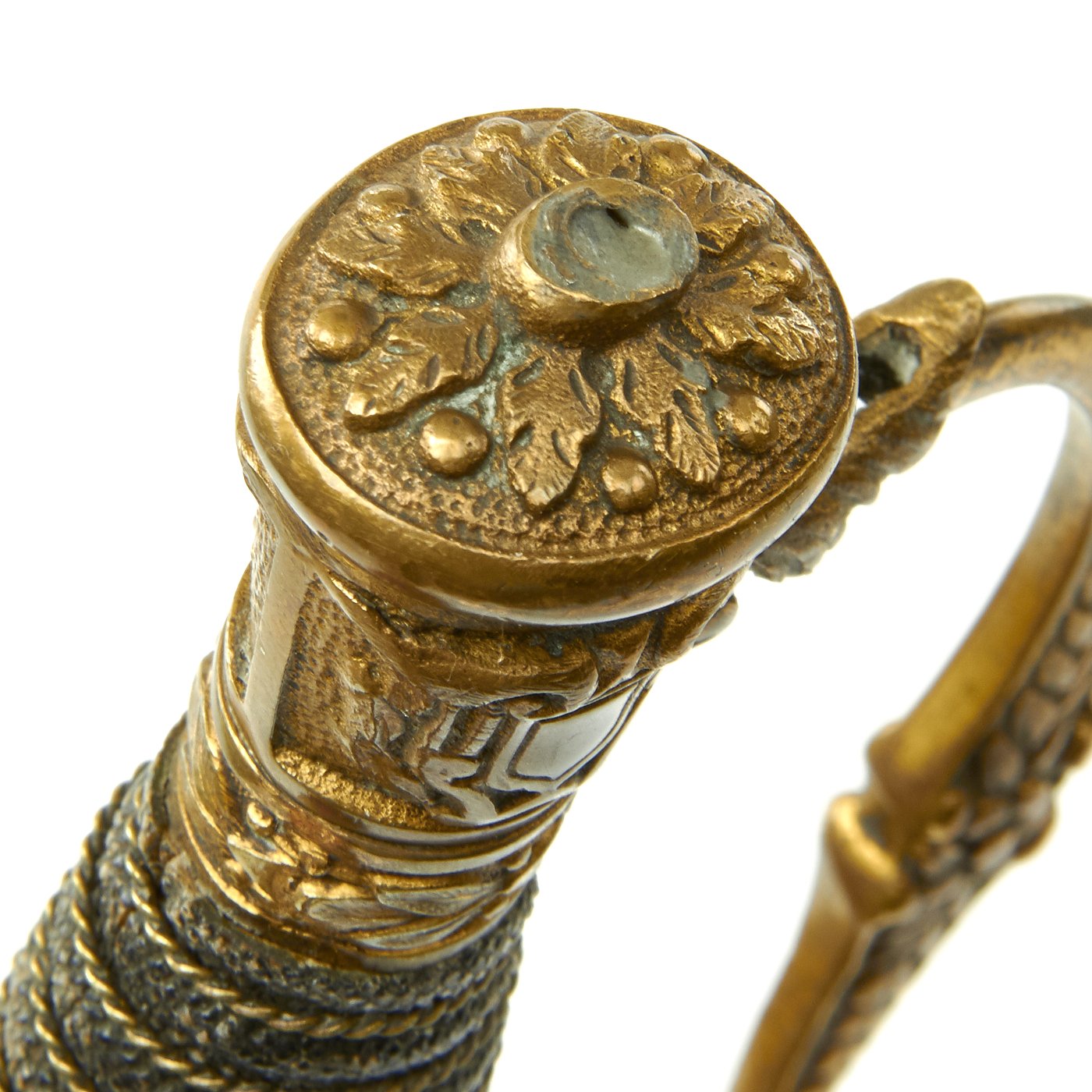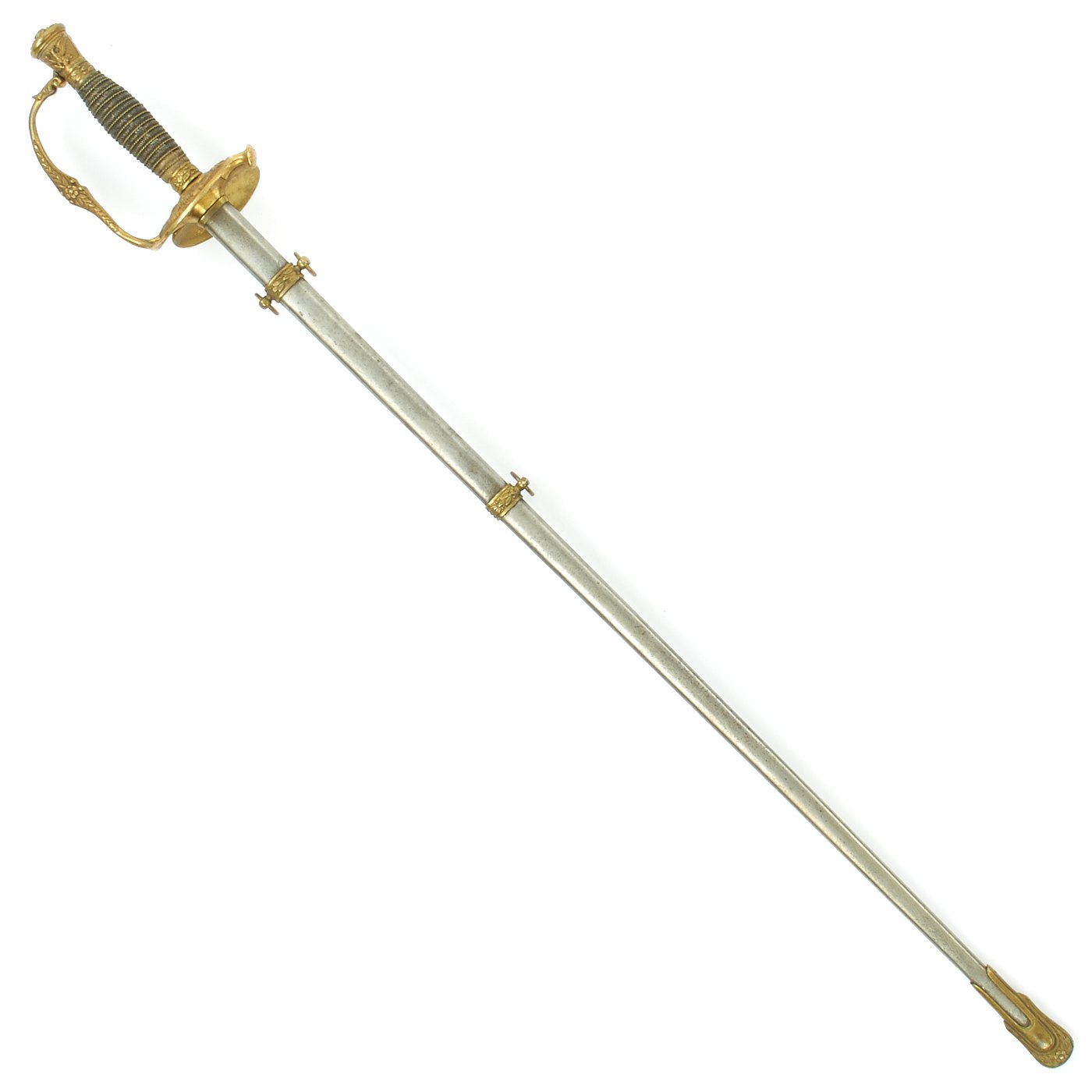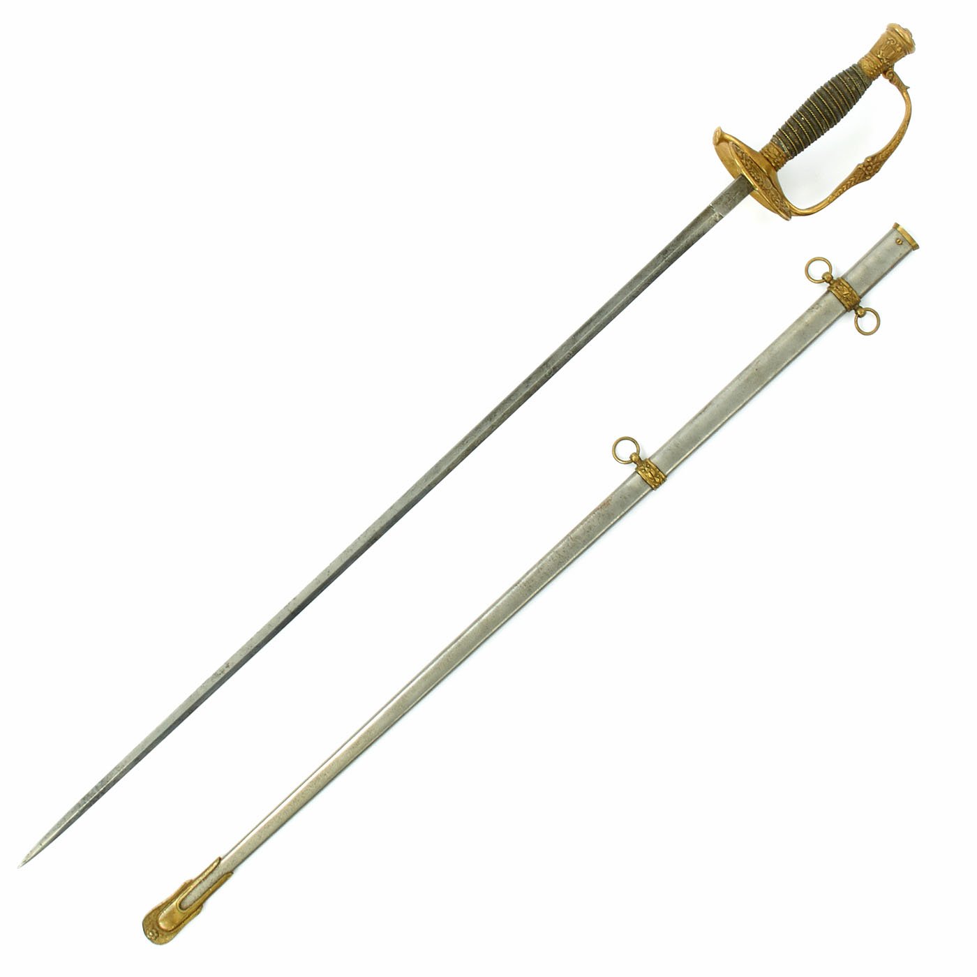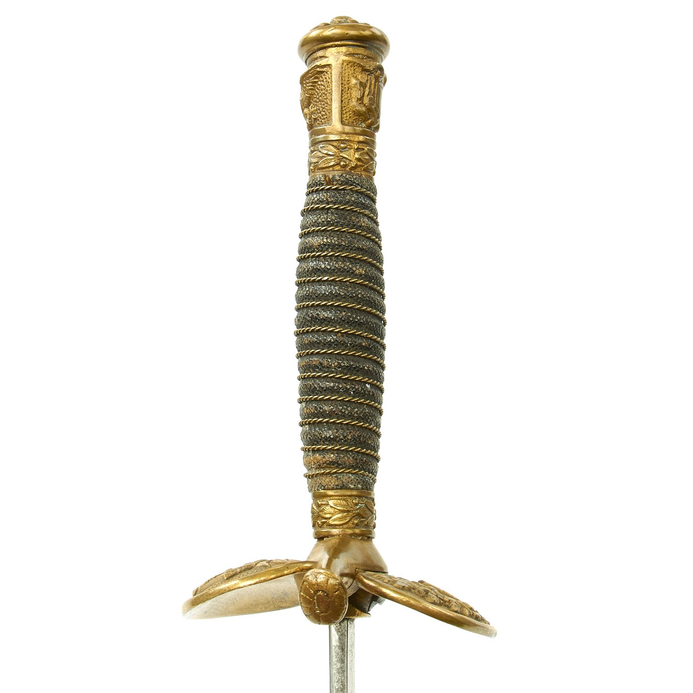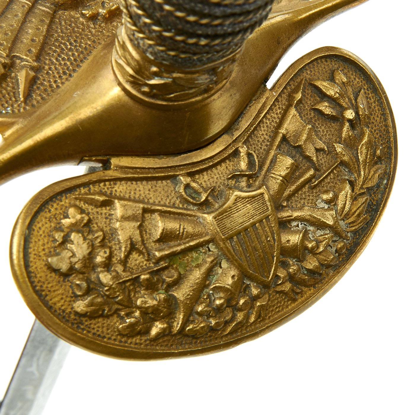 It has a partially etched 30" blade with foliage designs, and has a Spread Eagle in the center of one side and U.S. on the other side. The sword measures 36 1/2" overall, and the hilt and "shell" Guard are of gilded bronze/brass and the grip is wire bound sharkskin. It also features a partial "fold-away" guard on one side, which would allow it to rest more comfortably on the left hip. A good amount of the original gilding is present, though the skin of the grip is worn.