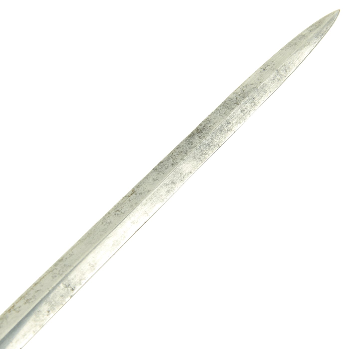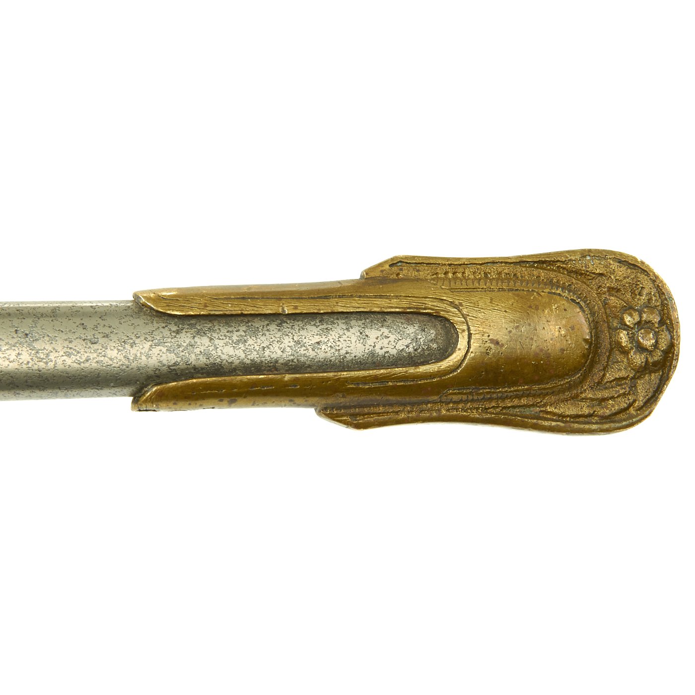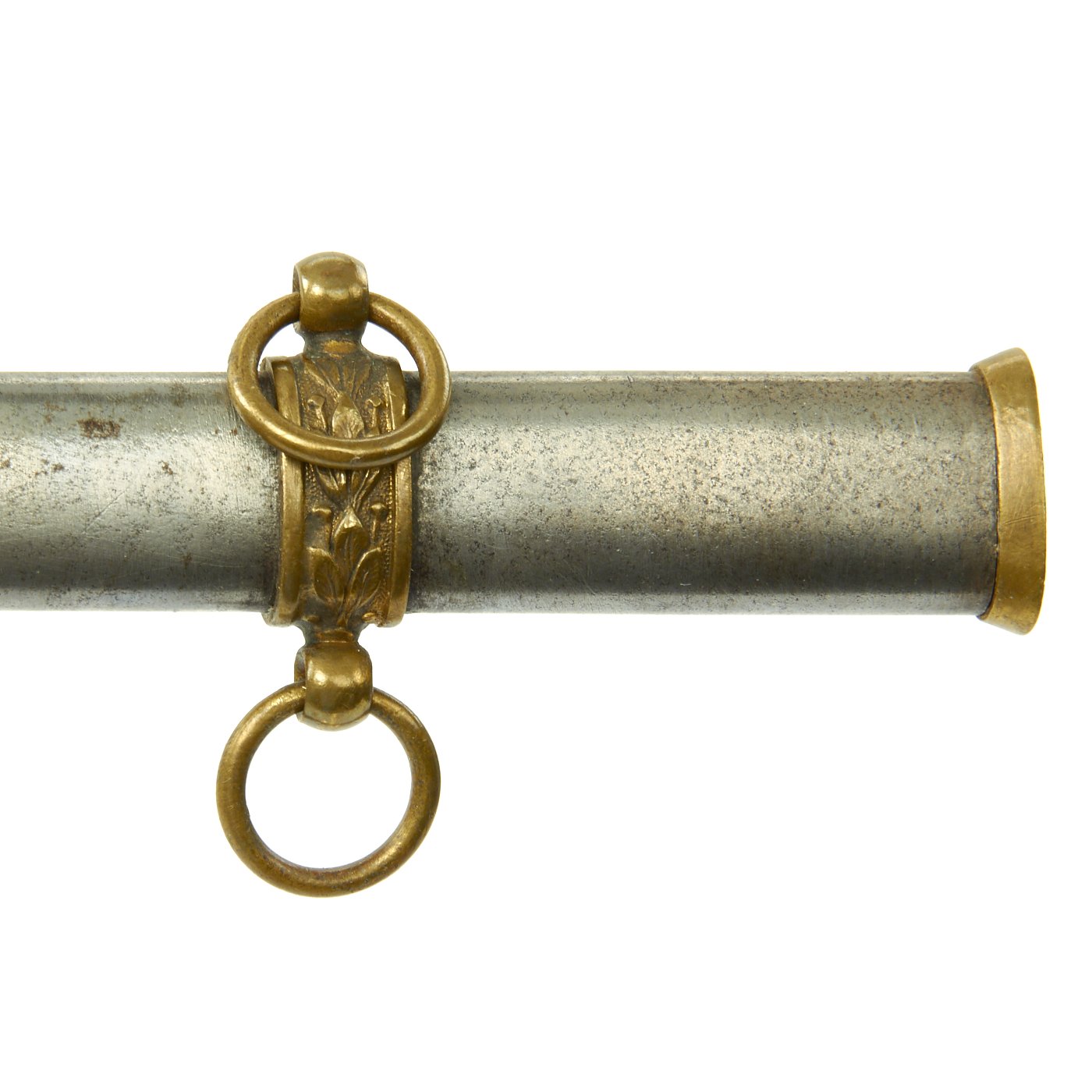It comes in its original decorated brass mounted steel scabbard, which has lost its original blued finish. Scabbard is straight, with no real dents that we can see.