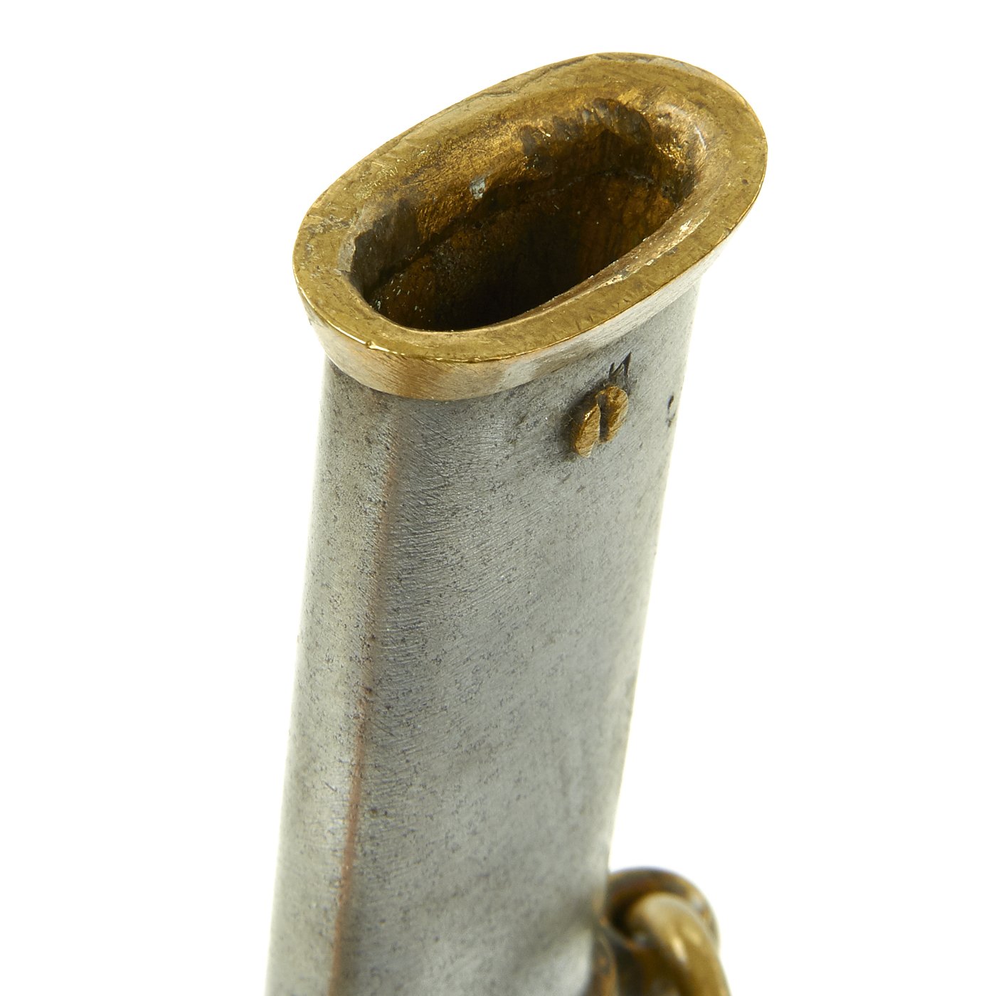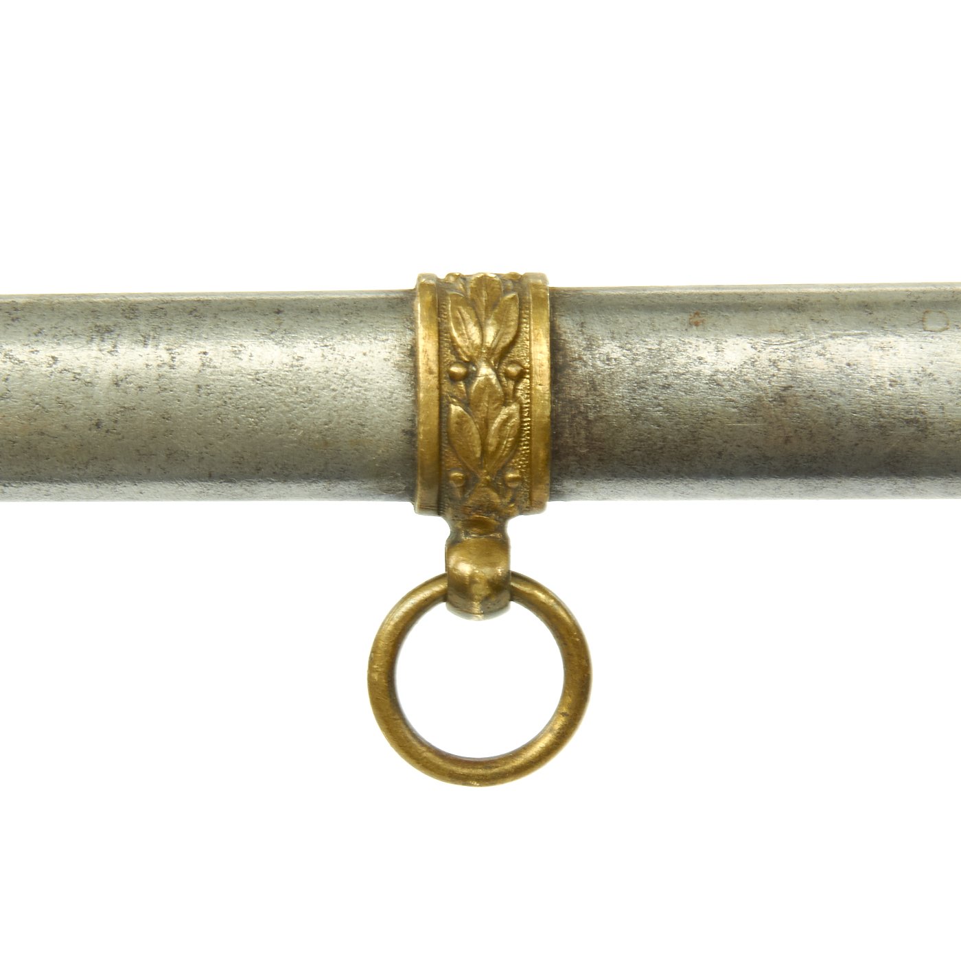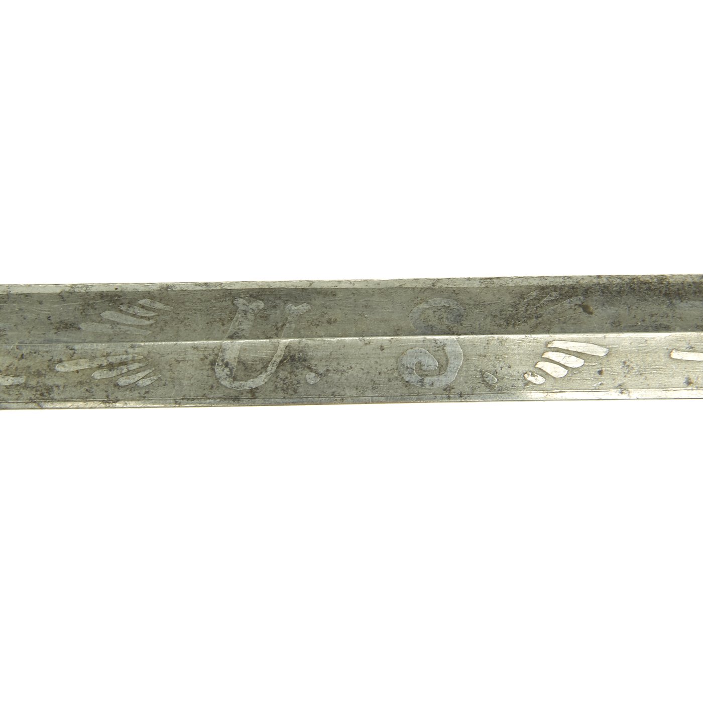It comes in its original decorated brass mounted steel scabbard, which has lost its original blued finish. Scabbard is straight, with no real dents that we can see.