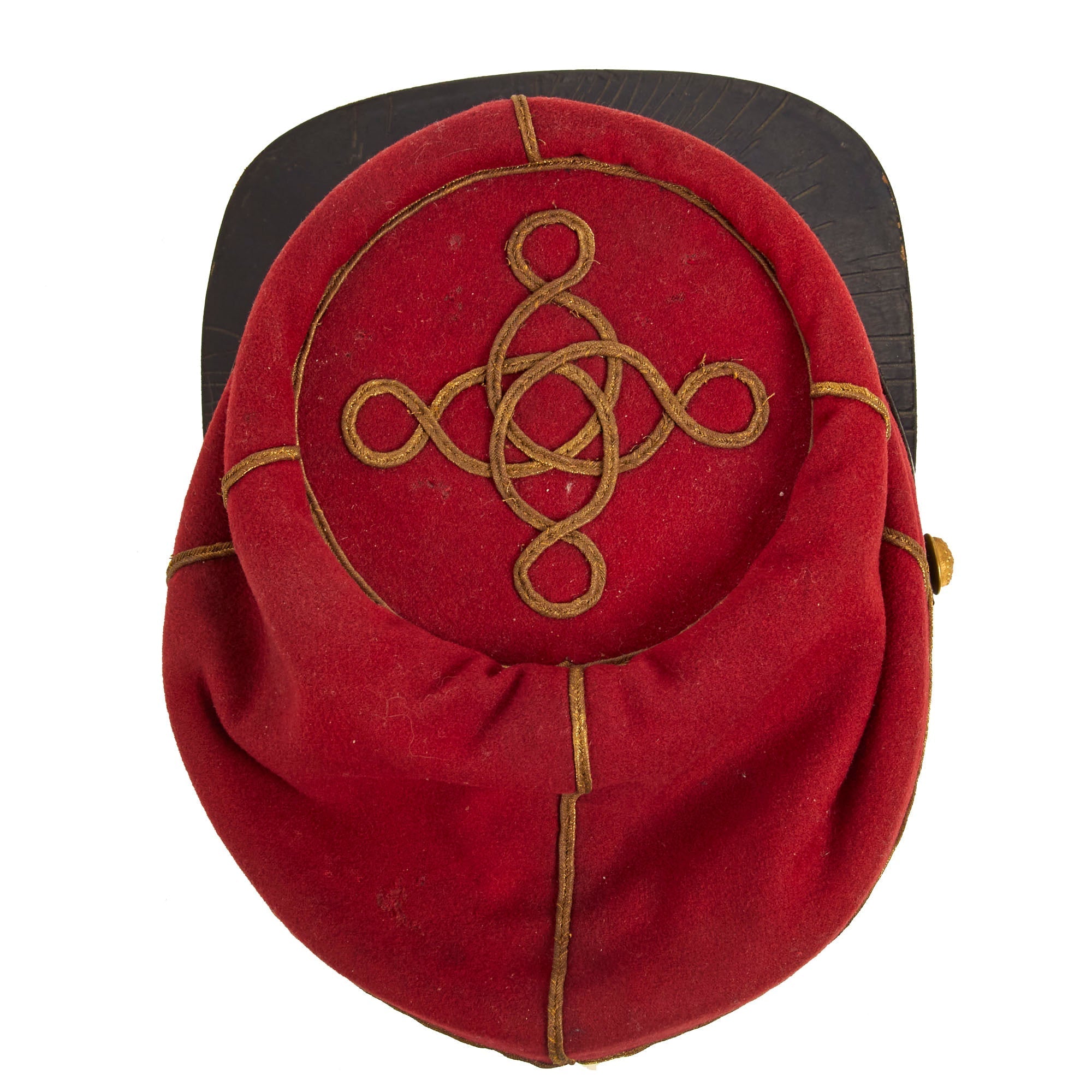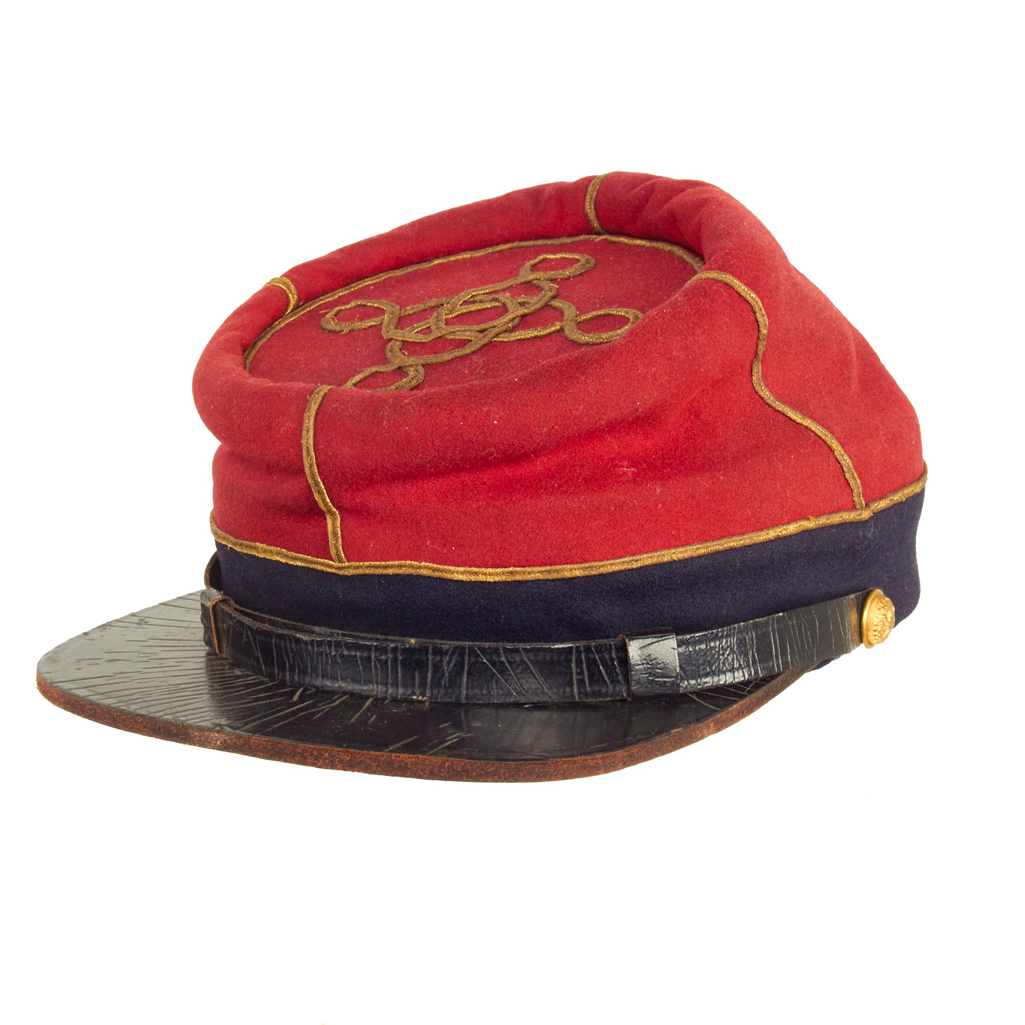 This is an absolutely stunning example of a Civil War Union Officer’s Kepi dating from the later portion of the American Civil War, Circa 1862-1863. This is the classic officer’s kepi which features French Style Officer’s Braid, which was popular with both Union and Confederate officer’s during the war. Generally, there is virtually no difference between Regular Union Artillery and Zouave caps of this style, the dark red with black band was common amongst both sides, even the use of the Federal Eagle buttons was common. To err on the side of caution, we are offering this cap as a Federal Artillery officer’s cap. Perhaps further research can yield otherwise.