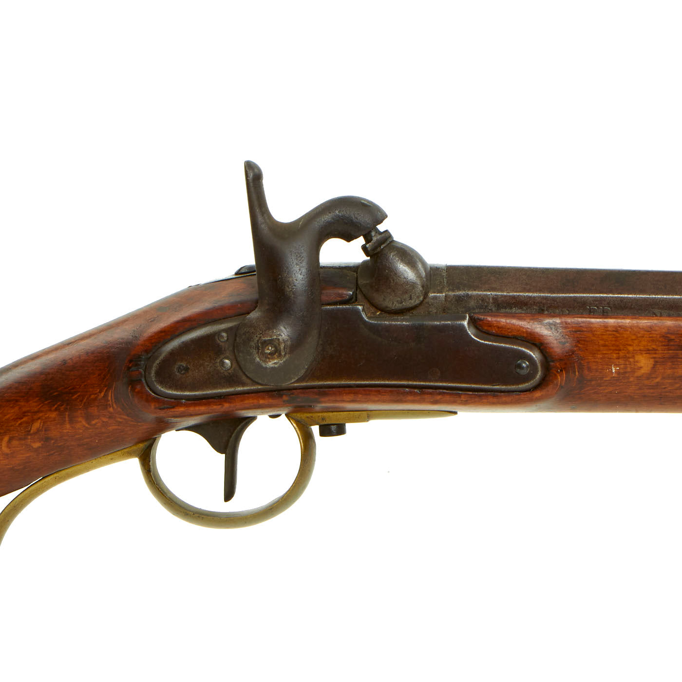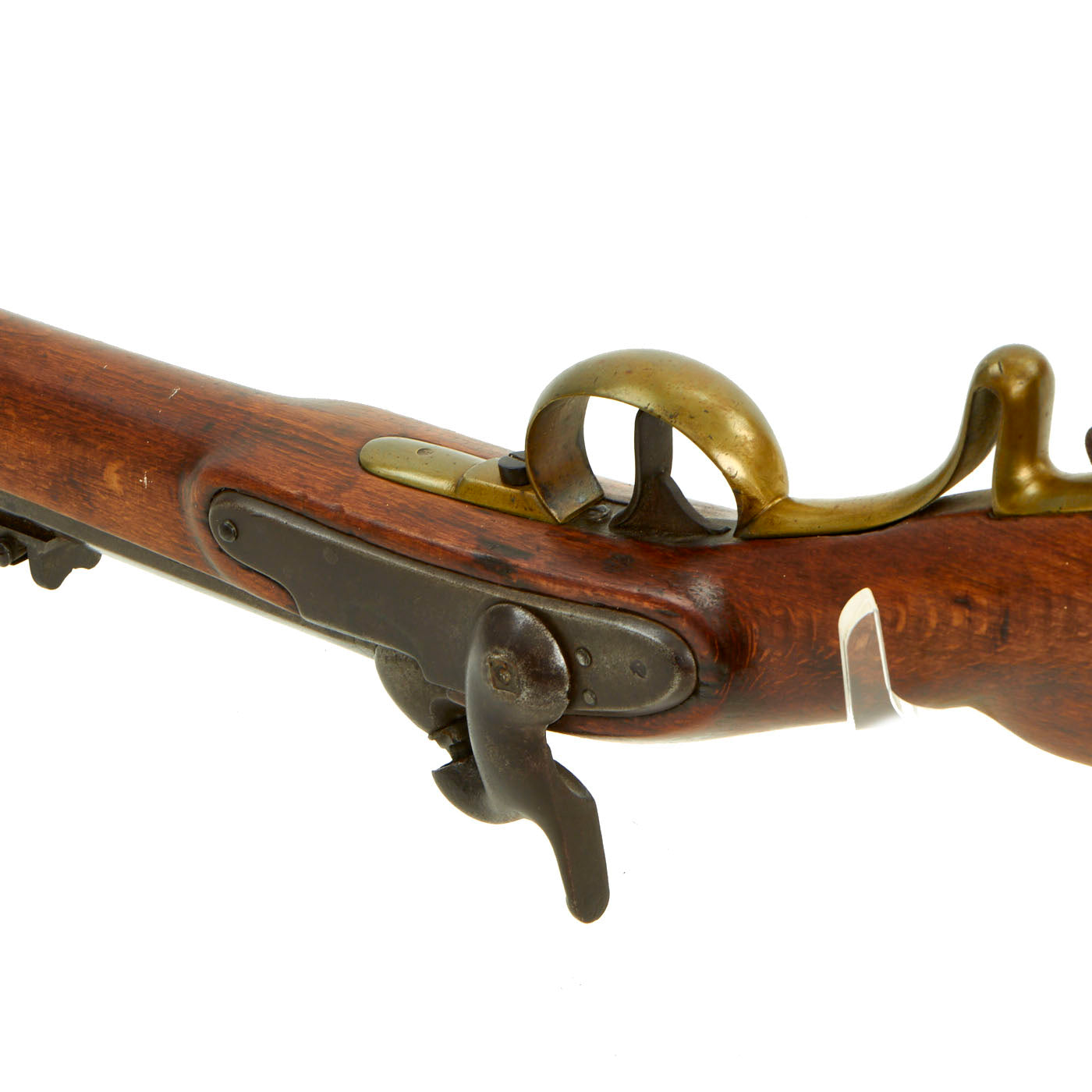 The stock is in very good condition, with a lovely cheek piece on the left butt stock, and a gently worn finish. The metalwork shows a lovely gray patina overall, with just a bit of powder burn around the cap nipple. It does not look to have seen extensive use since it was converted to percussion. We checked the bore, and the 12 groove rifling is still clear, with a partly bright finish, showing some past oxidation. The rear sight is still present and has both the fixed and flip up portions intact and fully functional. The lock functions correctly, holding at half cock and firing at full, however the hammer screw has had the head break off, as shown in the photos.
