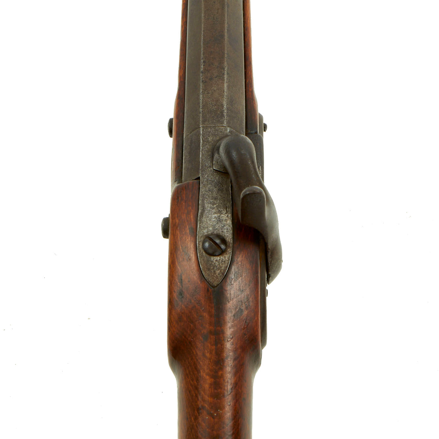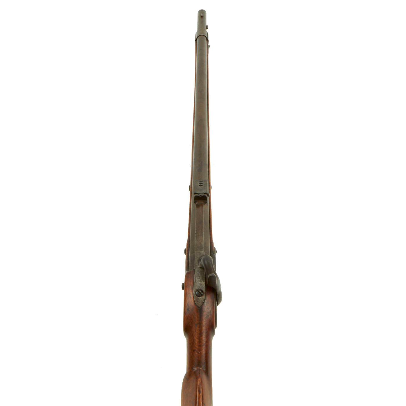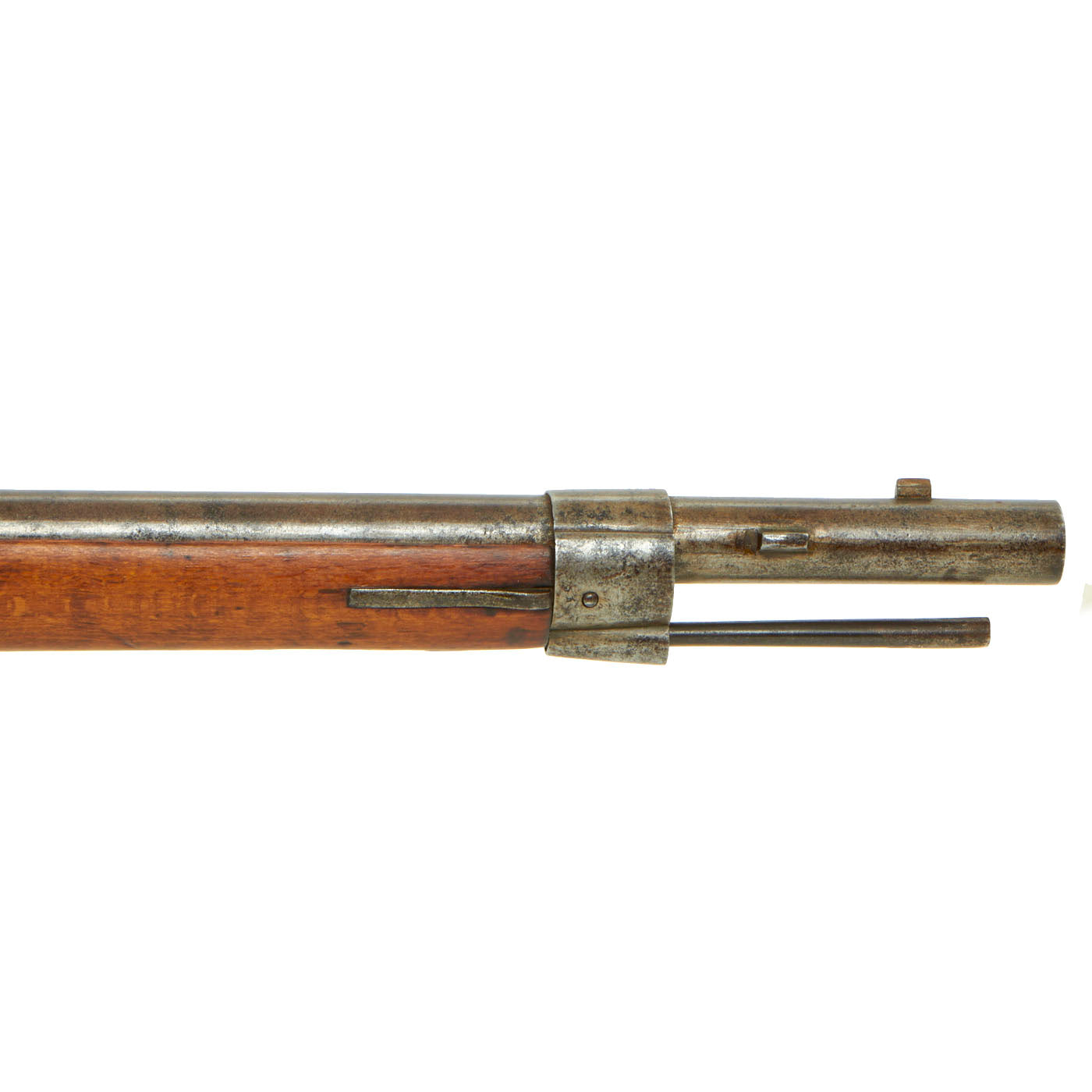 There are still markings on the lock indicating that it did have a frizzen, which was adapted as part of the "tube lock" system originally used on this rifle. There are also still remnants of the "pan" part of the system, now ground flush to the rest of the lock plate. It still retains a cleaning rod, however it looks to be a replacement without the proper end fitting, and both the lower and upper sling swivels are missing.