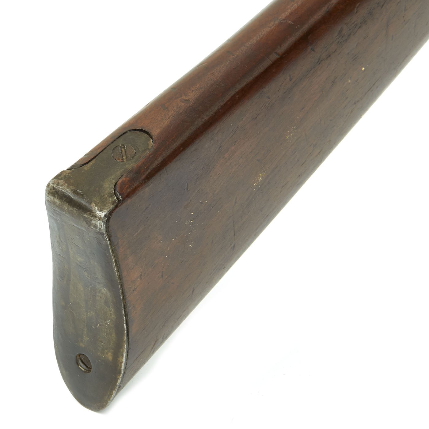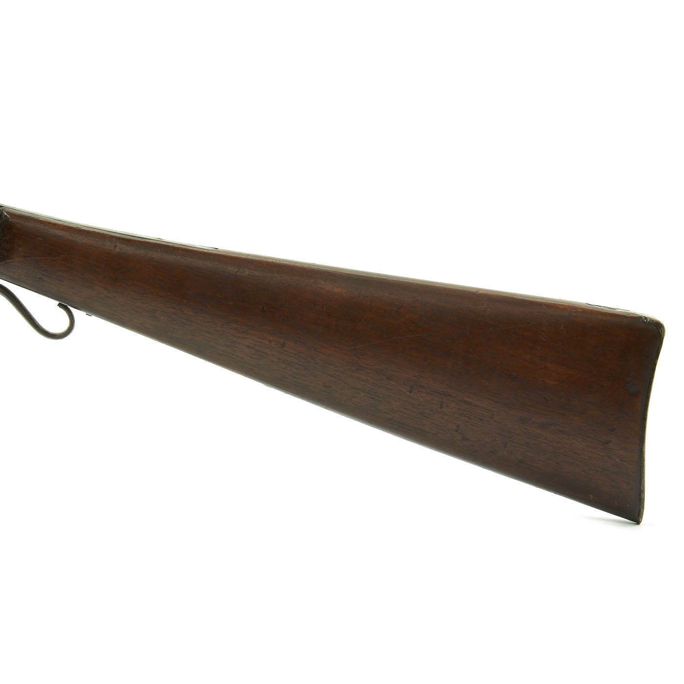 All told, these orders accounted for nearly half of the total production for the First Model Carbine. In addition to prewar purchases, the Confederacy also acquired Maynards through the capture of Federal armories located in southern states. The Maynard Second Model Carbine was produced between 1864 and 1865, with more than 20,000 produced to arm Federal cavalry units. Unlike the First Model Maynard, the Second Model was produced exclusively in .50 caliber. In addition, the Maynard tape primer system, patchbox, and tang sight common to the First Model were omitted, and the profile of the buttstock differs between these two variants.