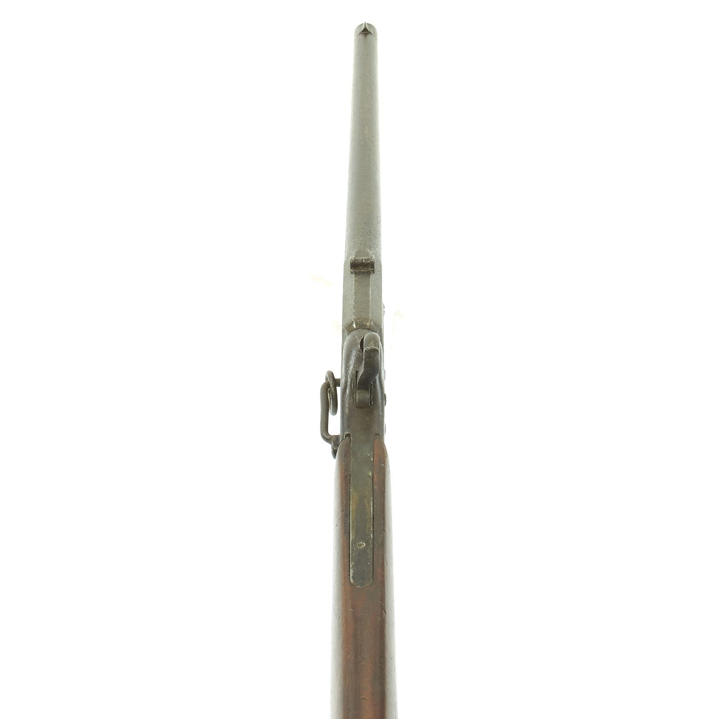This percussion carbine was patented by Edward Maynard of Washington, D.C., December 6, 1859, and manufactured by the Massachusetts Arms Company of Chicopee Falls, Massachusetts. Introduced into United States service in the late 1850s, it was put into mass production in 1861 and performed well in the hands of Federal troops. It has a 20-inch barrel and measures 36 7/8 inches in overall length, and has no forestock. The barrel tips for loading when the trigger guard lever is lowered. Percussion caps were required to fire a perforated .50 caliber brass cartridge that required hand extraction. Early versions included the Maynard tape primer system, but wartime exigencies forced its elimination. Both barrel and buttplate were blued, and the receiver of this arm was casehardened. Some were tinned for Navy use.