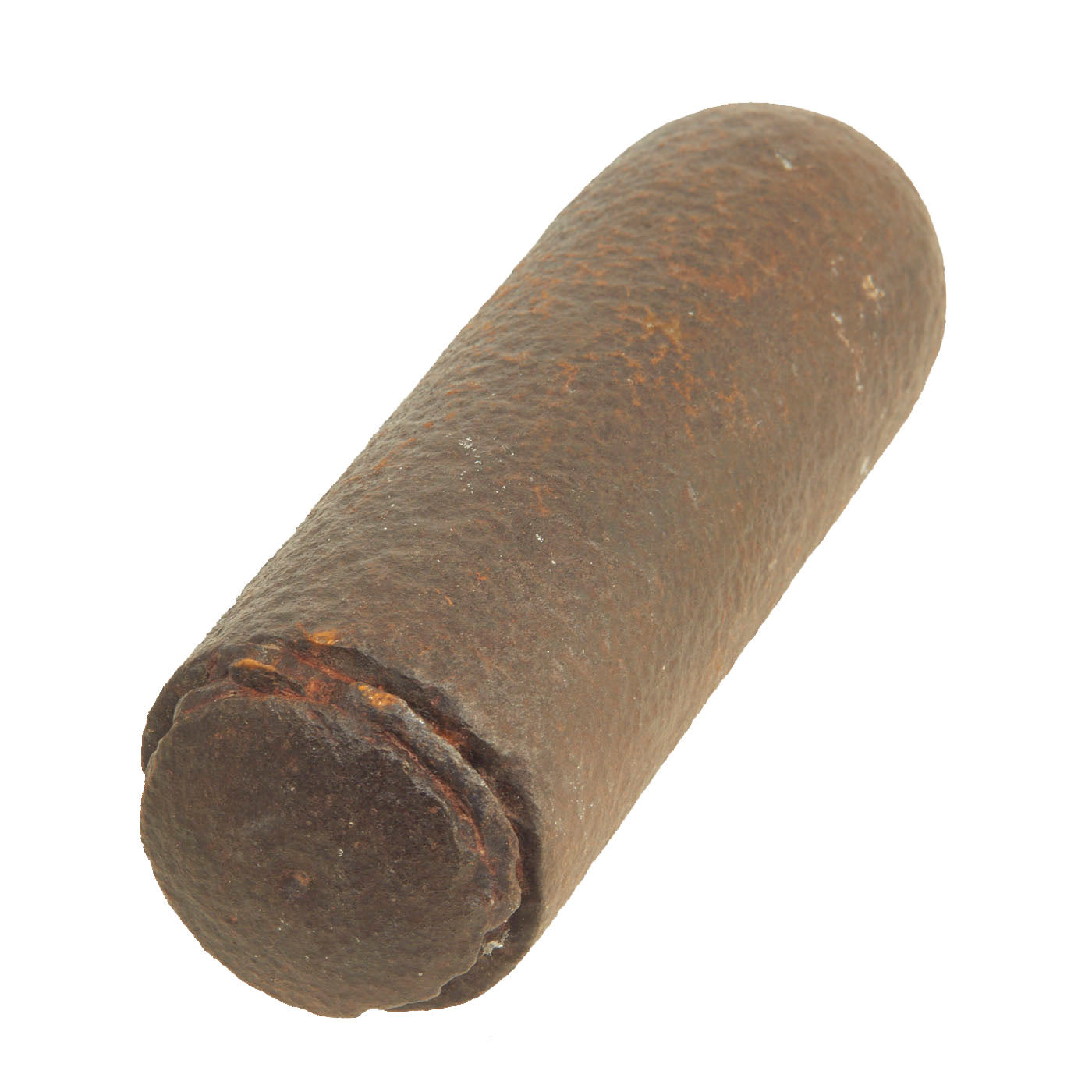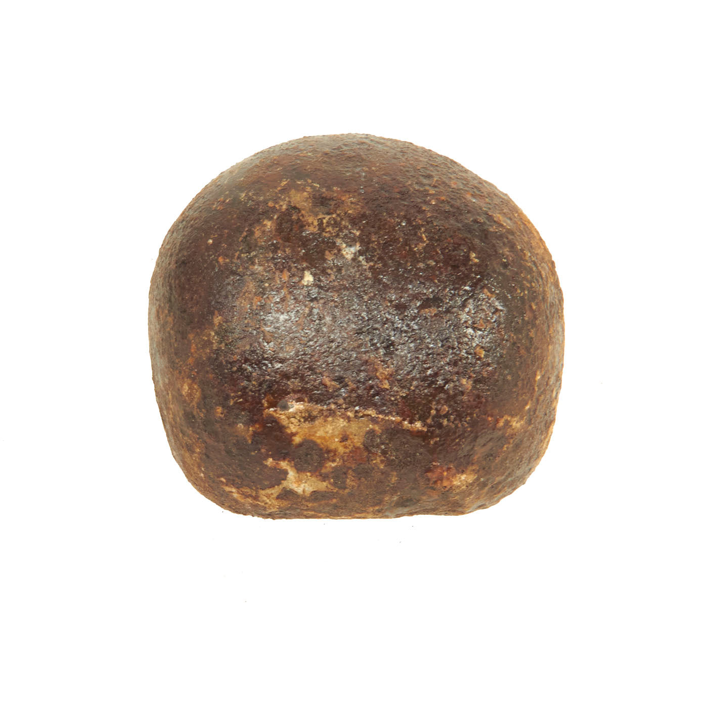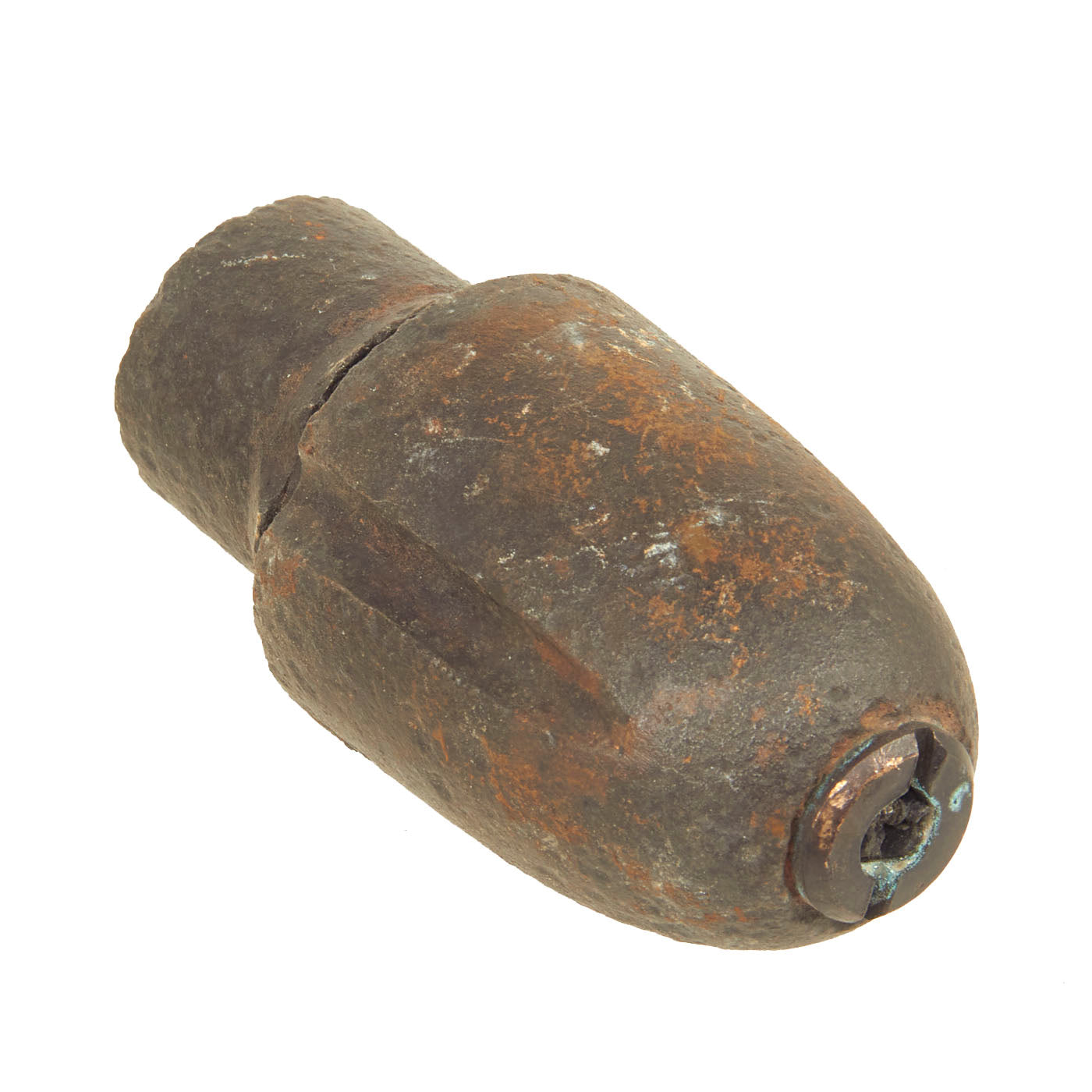 - 12 Pdr Cannonball Fragment For Use With a Bormann Timed Fuse: This is a lovely example of a ground dug Federal 12pdr cannonball that would have been used with the Bormann time fuse. The Bormann fuse is named after its inventor, Belgian Army Captain Charles G. Bormann. The Bormann time fuze was employed by the United Stated Ordnance Department as early as 1852. The time fuze is contained in a tin and lead disk. This disk had time markings indicated in seconds and quarter-seconds graduated up to 5 1/4 seconds. The artillerist used a metal punch to pierce the thin metal at the desired time marking. This exposed a section in the horseshoe-shaped horizontal mealed powder train, which is covered by a thin sheet of tin. When the cannon discharged, the flame from the explosion ignited this powder train. It would burn in a uniform rate in both directions, but one end would terminate in a dead-end just beyond the 5 1/4 second mark (Confederate copies are 5 1/2 seconds).
