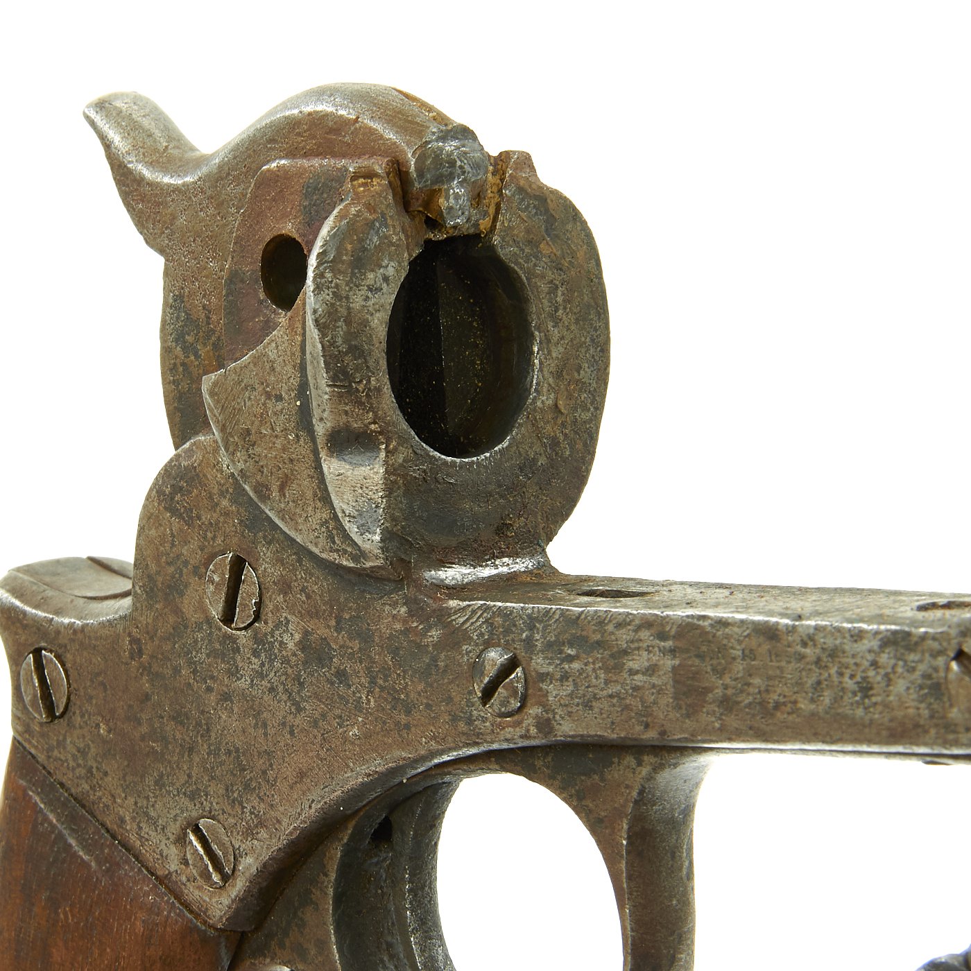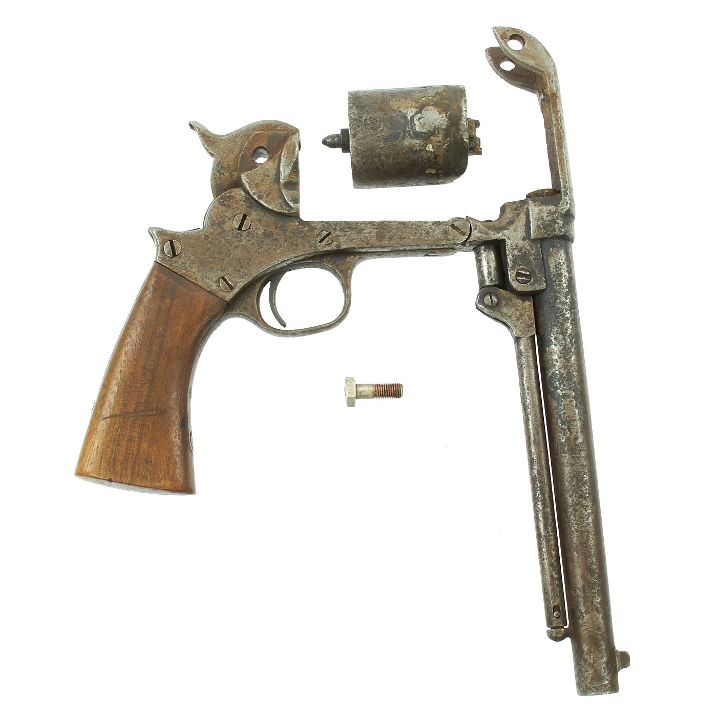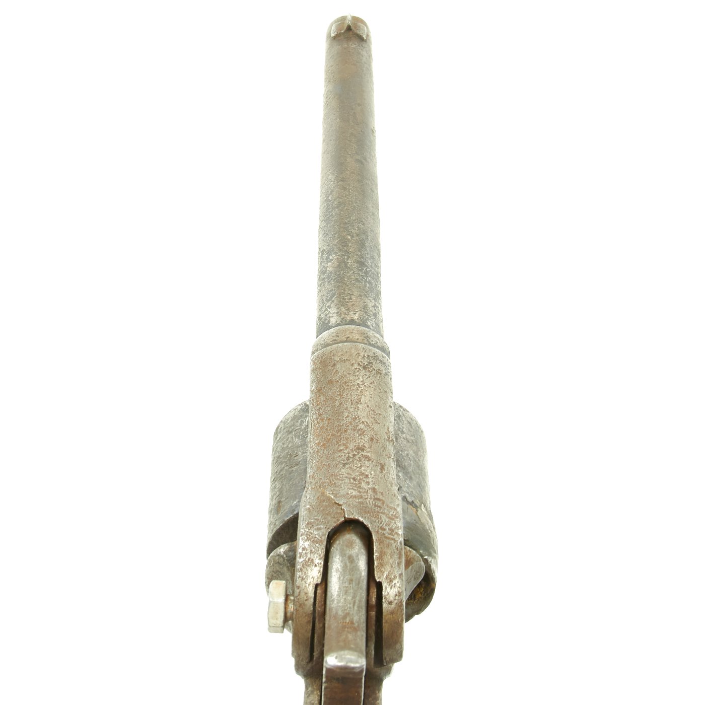 This BATTLEFIELD PICK-UP is in dreadful condition but its really not that bad, all things considered. It looks like the wood grip has been replaced or at least very much reworked. The ironwork is all stained and pitted and part of the cylinder has been welded, apparently in an aborted attempt to convert it to use cartridges? Definitely a bit of "basement gunsmithing" was done.
