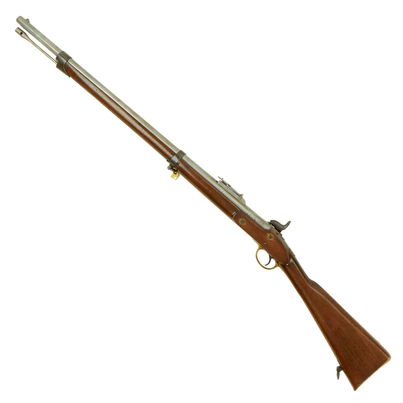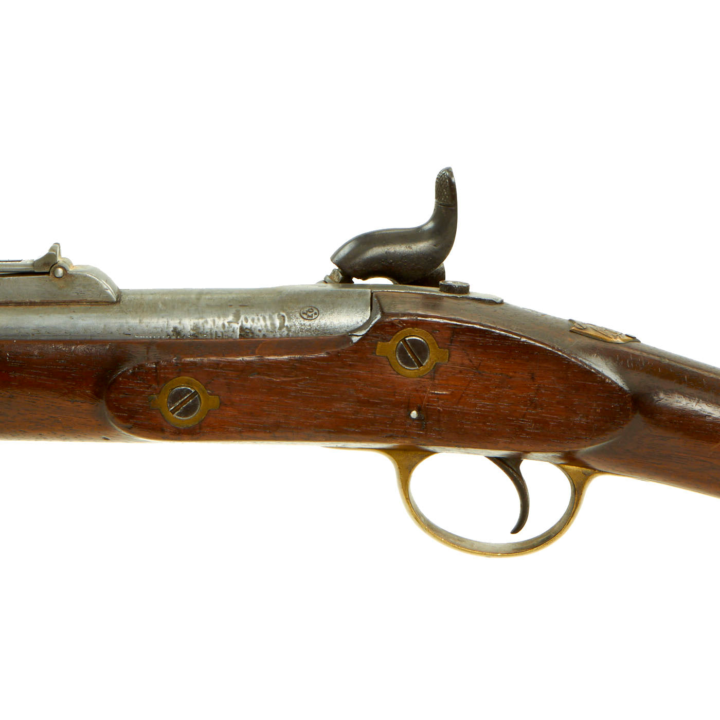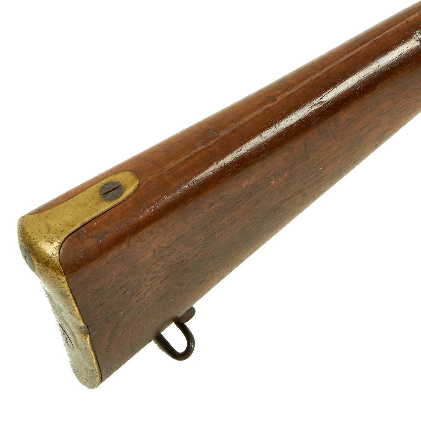 Original item: Only One Available. This is a very nice example of rare Imported Civil War rifle. Usually referred to as the "Brazilian Contract Light Minié Rifle", research has shown that these are more correctly called the "Brazilian Model 1855 Naval Rifle". These were essentially a Belgian made percussion rifle very similar to the British P-1856 two band Enfield rifle, made utilizing the Belgian Minié ball rifled system. Approximately 6,000 of these rifles were imported by Herman Boker and sold in New York City in early 1861. The States of New York and Ohio purchased many of these, though we unfortunately cannot find any state markings on this rifle.