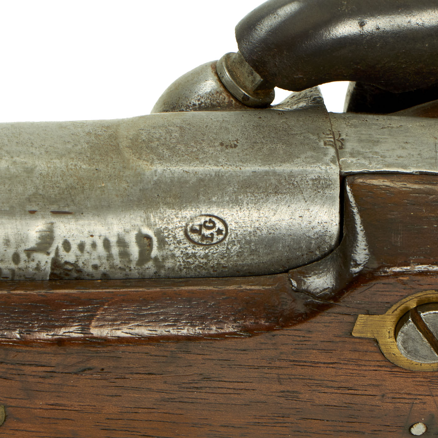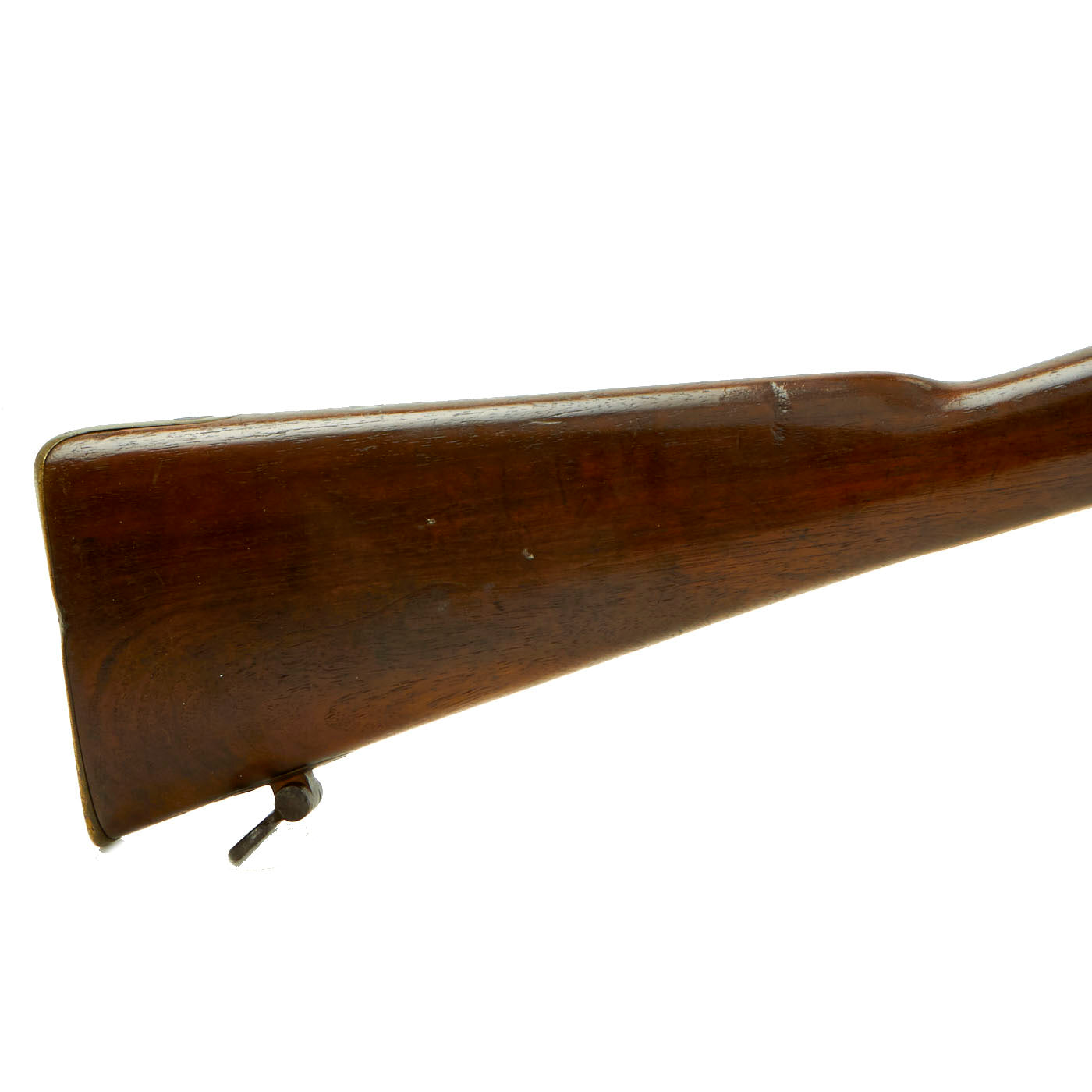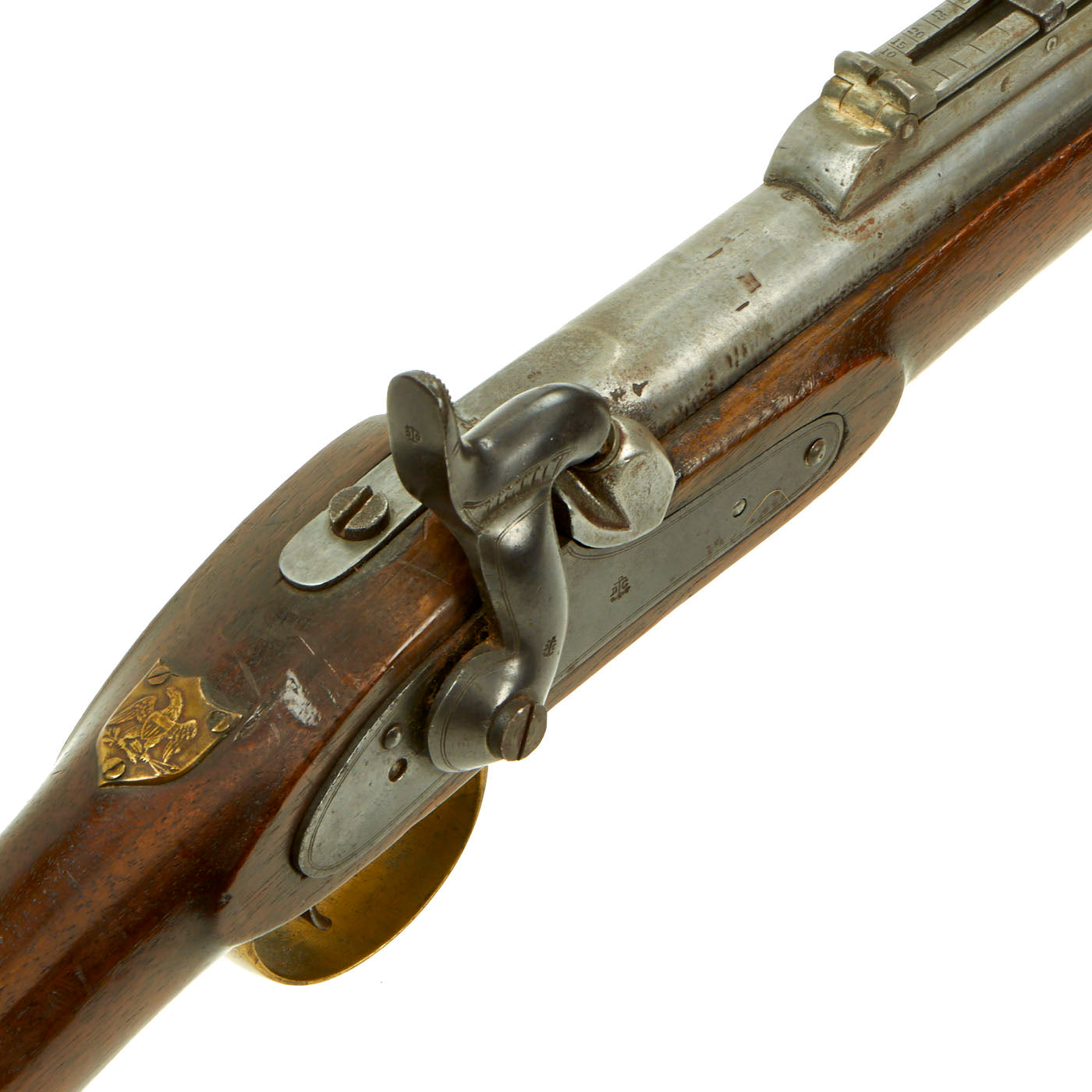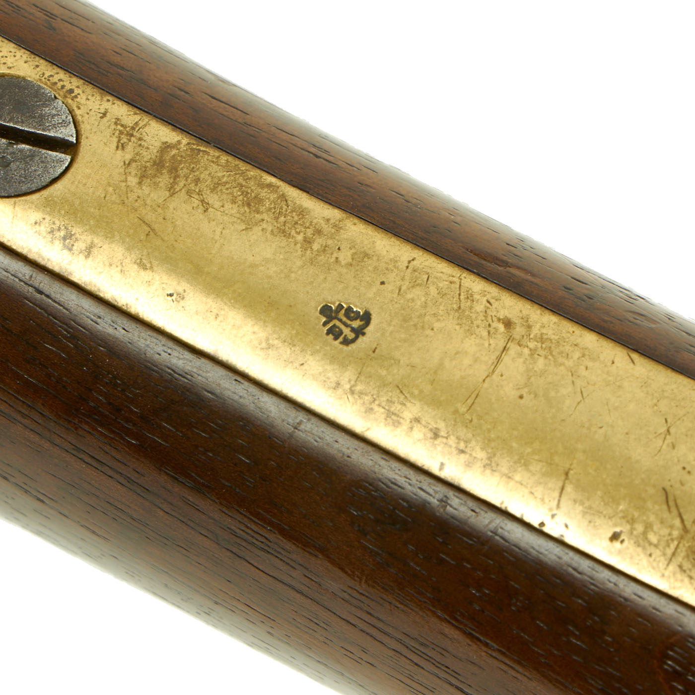 These were all made by O.P. Drissen & Cie of Liège, and the (Anchor) D C marking of this firm is seen on virtually all parts of the gun. It is also marked with the "Perron" Tower of Liège by the cap bolster, and the E / L G / * in an Oval Liège proof mark on the other side of the breech. There is a brass American Spread Eagle escutcheon behind the barrel tang which was a feature of this model. Though most were later removed, this example still retains the escutcheon making it quite rare and even more collectible. The right hand side of the stock bears an inspection cartouche that we are unfortunately unable to identify. The serial number on these were marked on the bayonet mounting lug, and this example is marked with 3171.