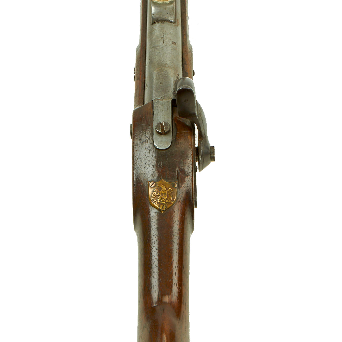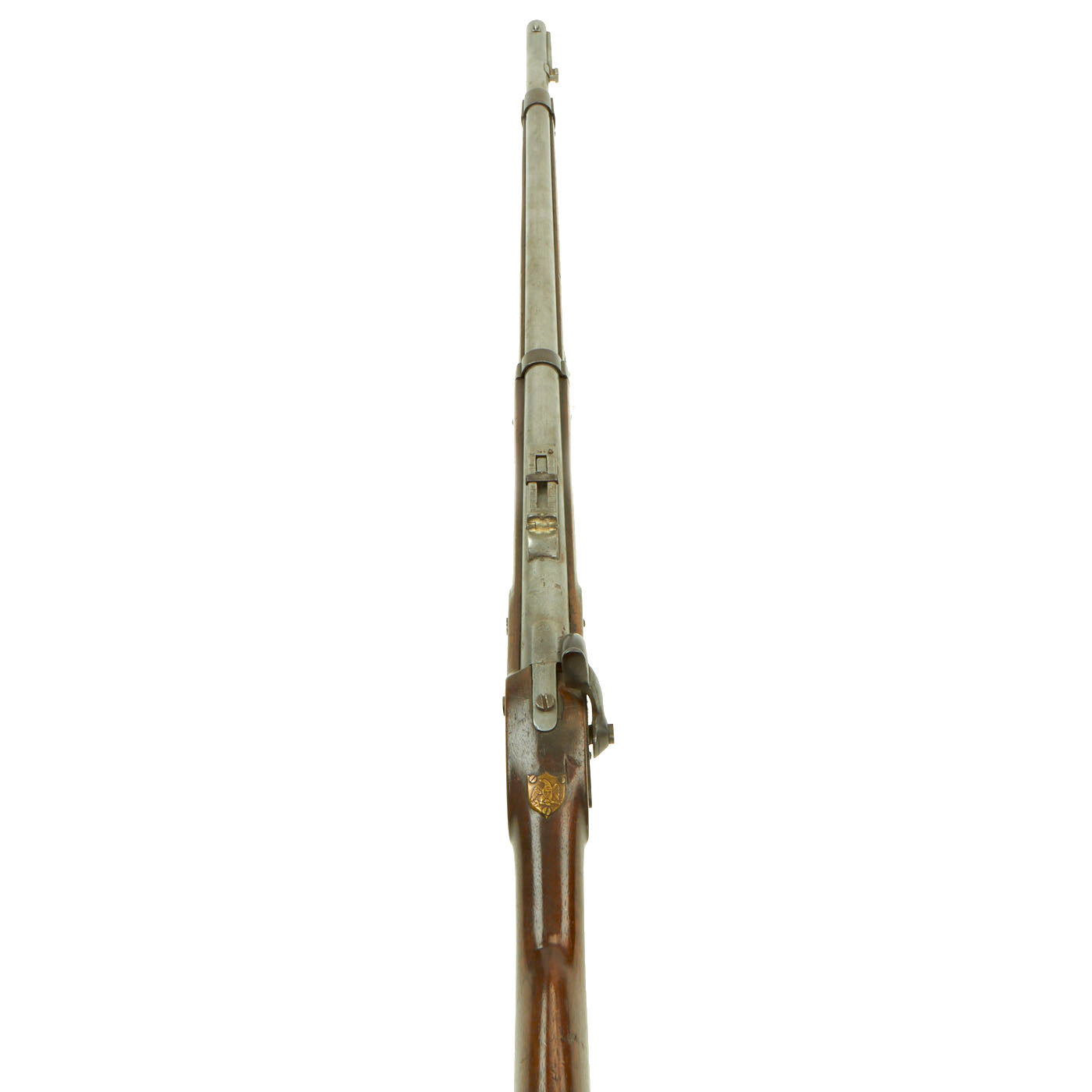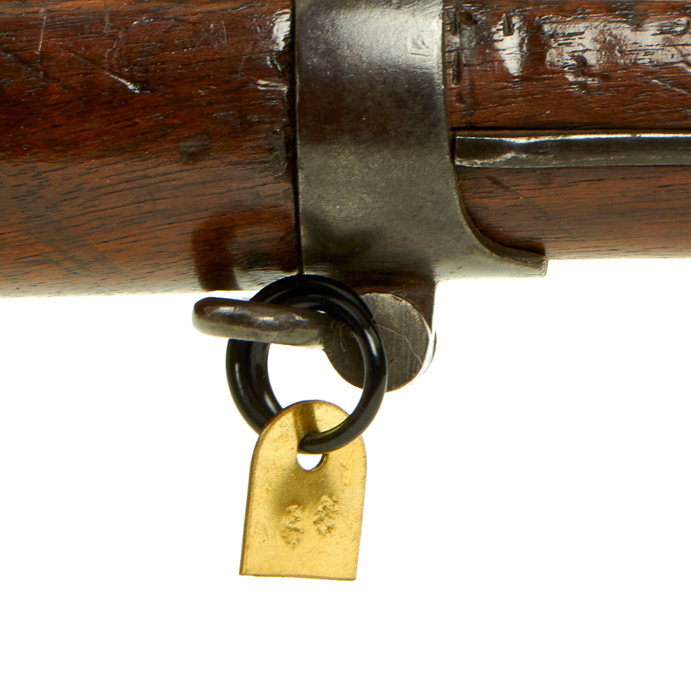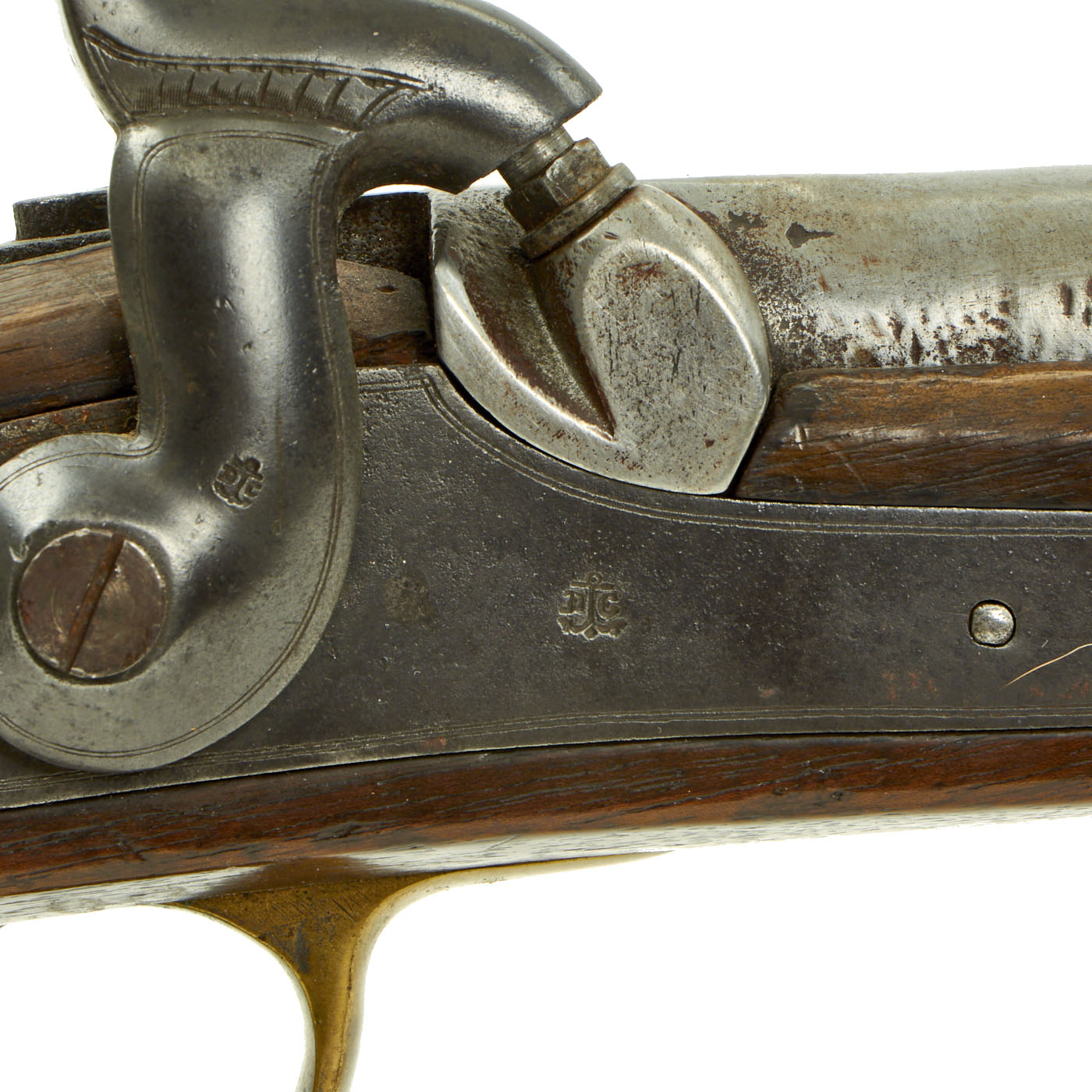 These were all made by O.P. Drissen & Cie of Liège, and the (Anchor) D C marking of this firm is seen on virtually all parts of the gun. It is also marked with the "Perron" Tower of Liège by the cap bolster, and the E / L G / * in an Oval Liège proof mark on the other side of the breech. There is a brass American Spread Eagle escutcheon behind the barrel tang which was a feature of this model. Though most were later removed, this example still retains the escutcheon making it quite rare and even more collectible. The right hand side of the stock bears an inspection cartouche that we are unfortunately unable to identify. The serial number on these were marked on the bayonet mounting lug, and this example is marked with 3171.