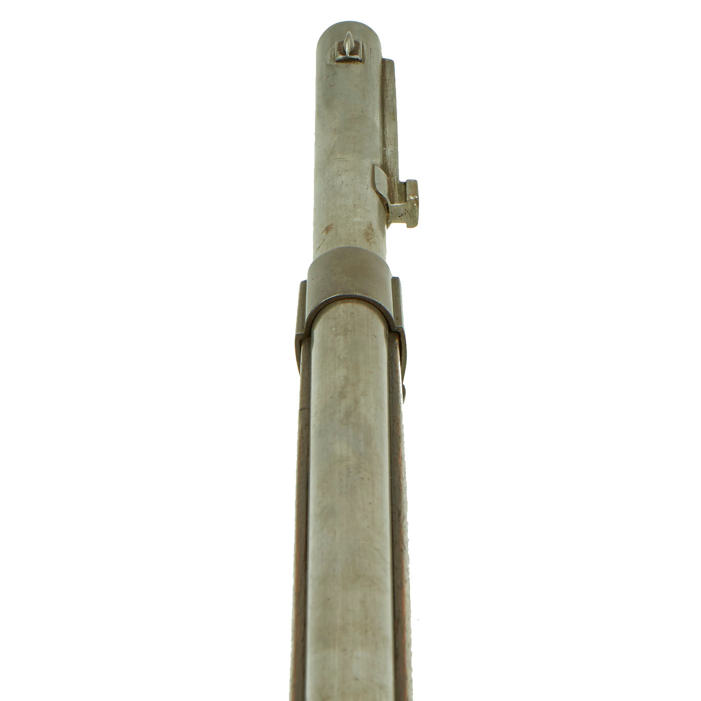 Condition of the rifle is very good, showing only light wear from service, and the original finish is very well retained. The stock shows the expected dents and dings from service, and looks to have been lightly varnished at some point. There is a bit of the stock missing near the bolster due to powder burn. We checked the bore, and the four groove rifling is still clear, though it is overall worn. The bore measures about .61, so it may have been bored out a bit, as is often seen on these rifles. The lock functions, currently will not hold at half cock. The nipple cone is in very good condition, possibly replaced during service.