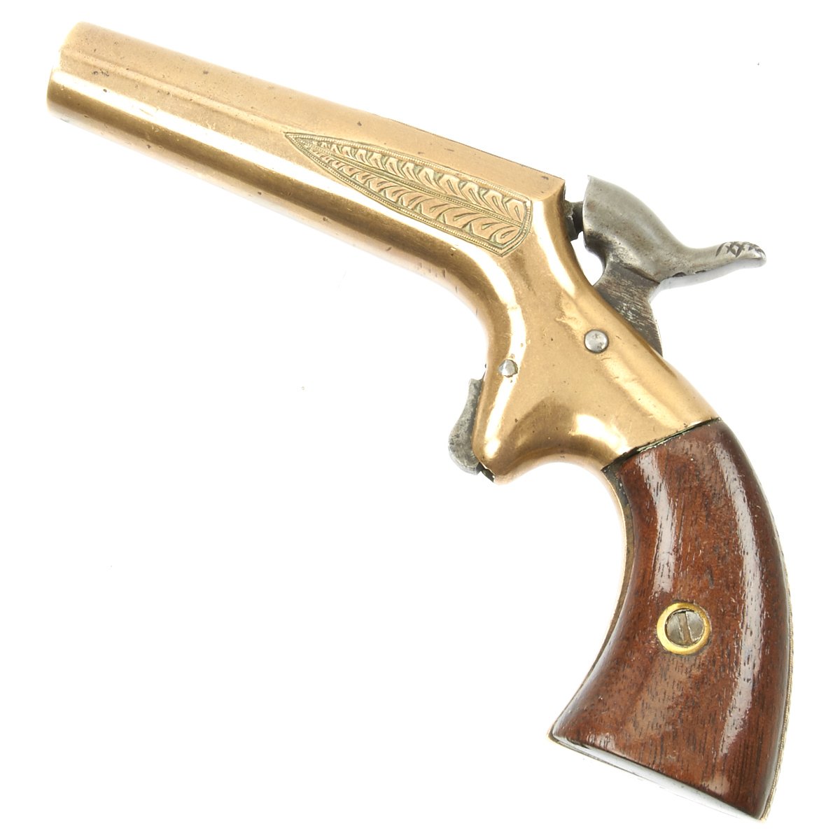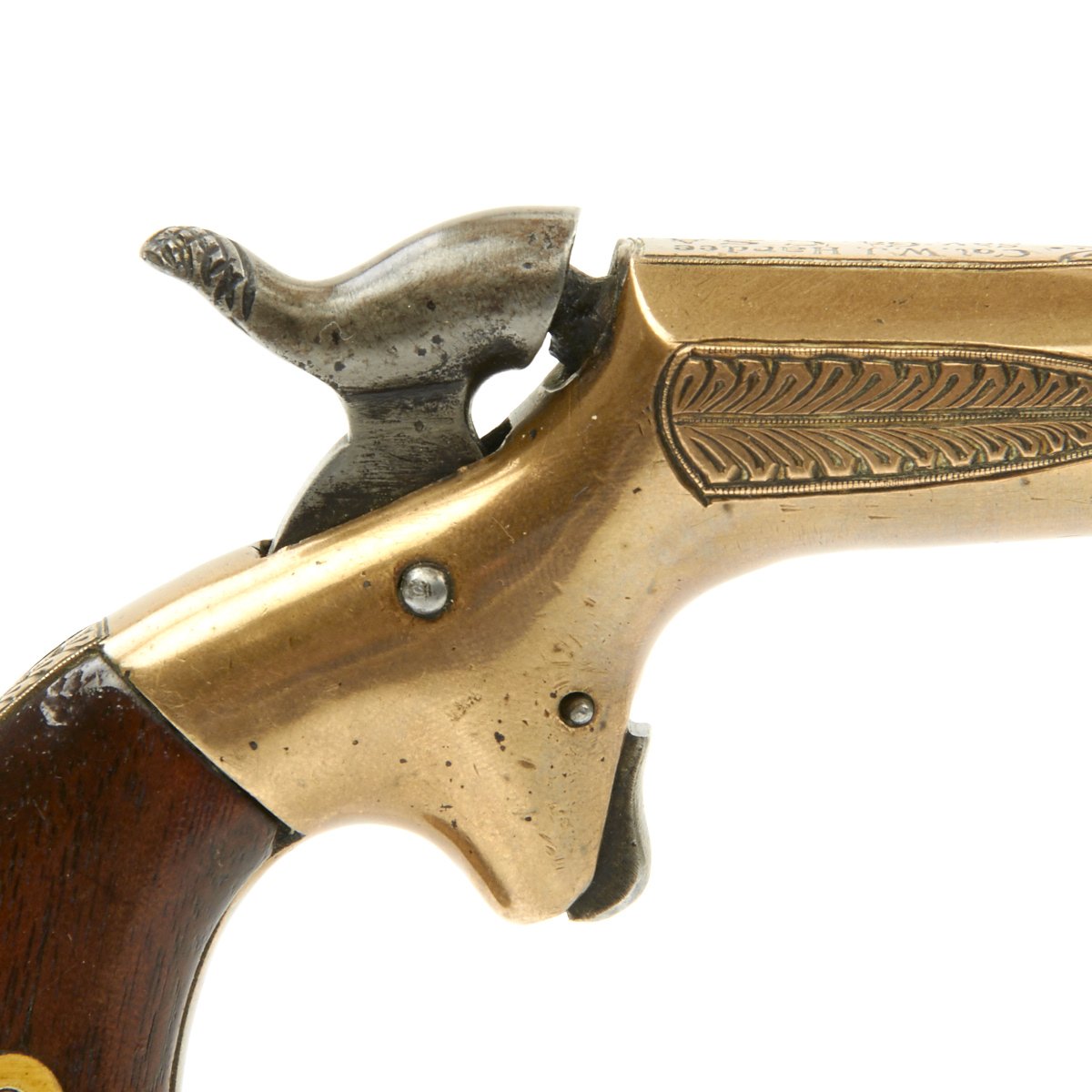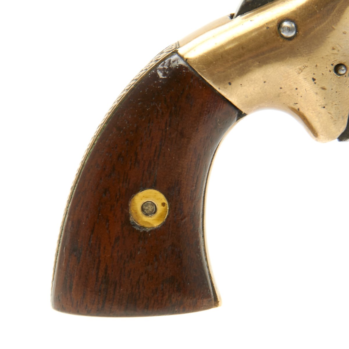 Original Item: One of a Kind. This is a most interesting small Single Shot Percussion Derringer constructed from Brass. The single piece grip frame and barrel bears serial number of # 25 on the bottom of the grip. The pistol is in approximately .32 Caliber, with iron hammer, trigger and presumably the internal parts. Nice deeply engraved decoration on back strap and on each side of the barrel. The design indicates production circa 1860-1863.